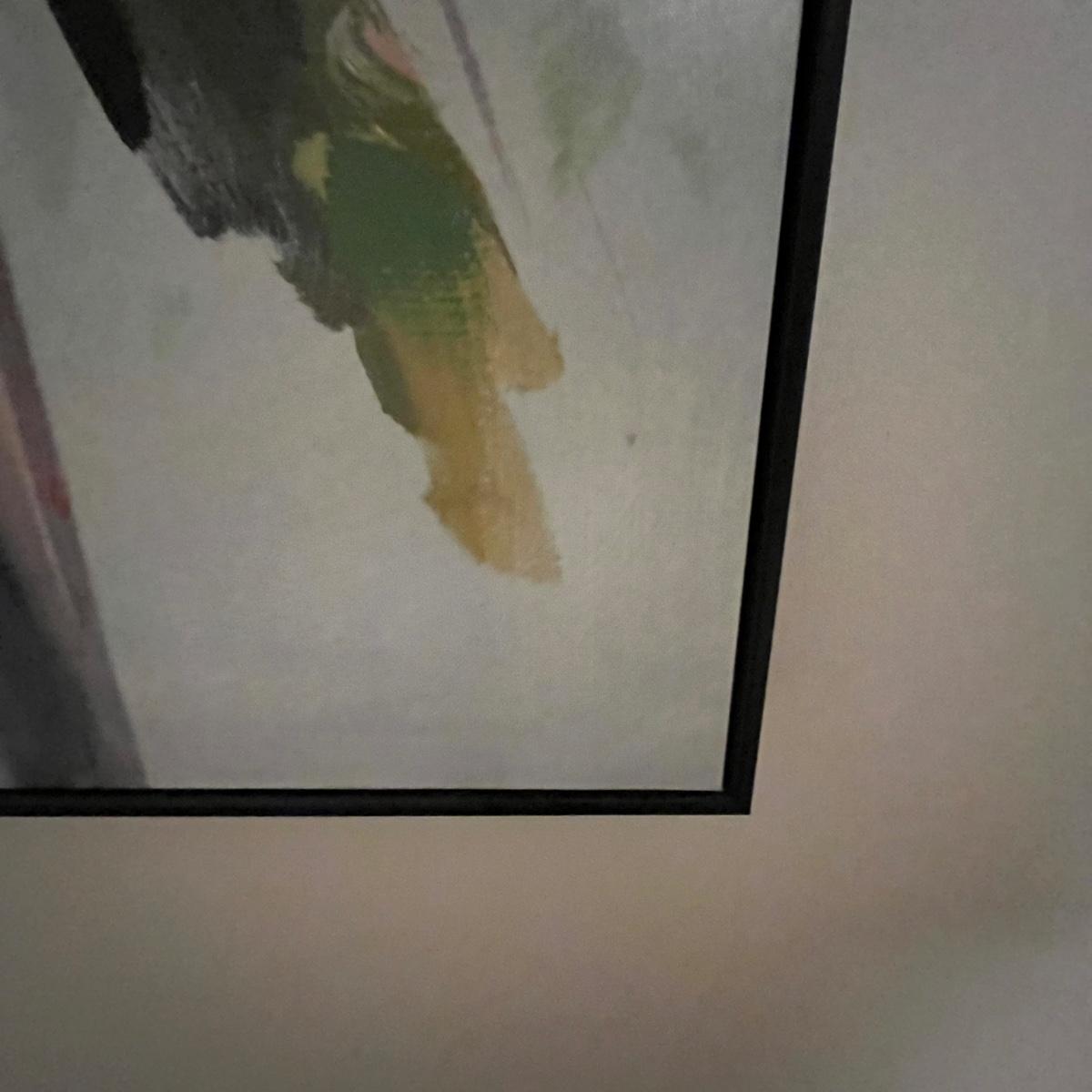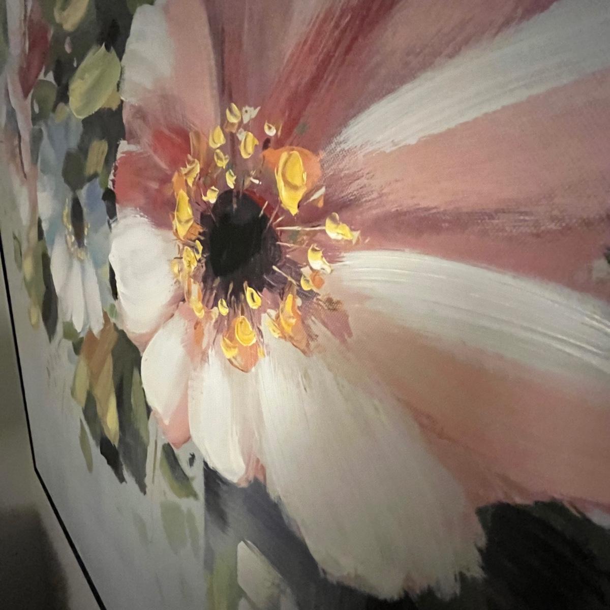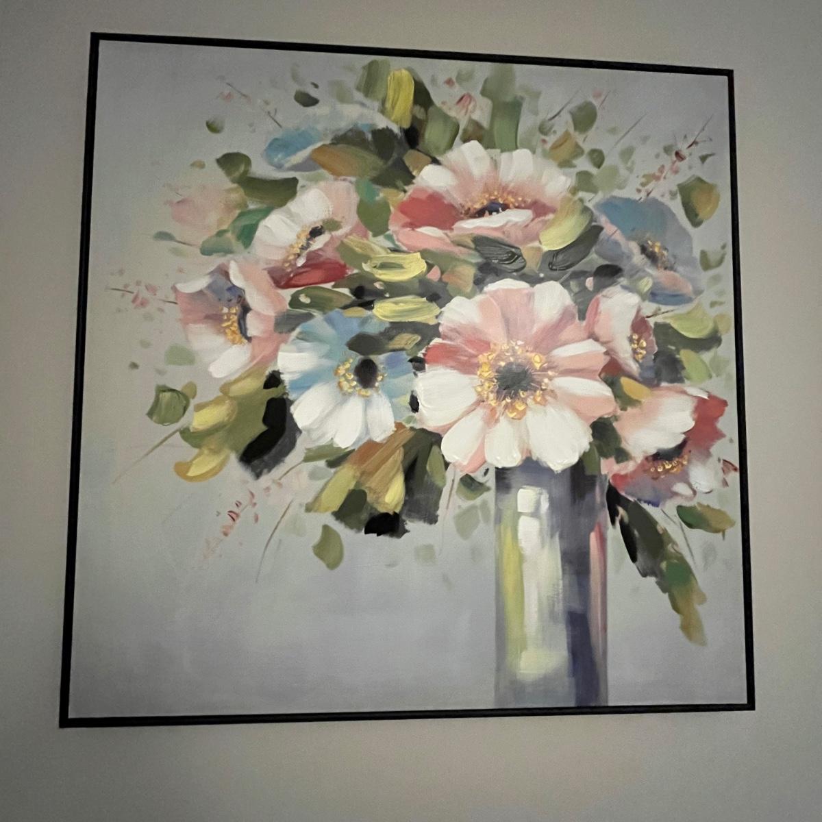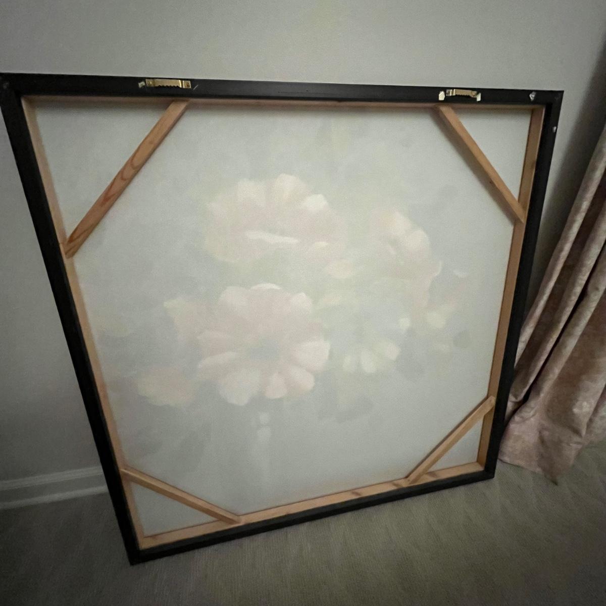 Lot includes a large wooden framed floral print that has paint added to print to make it look like a painting. Frame measures 39.5” x 39.5”.