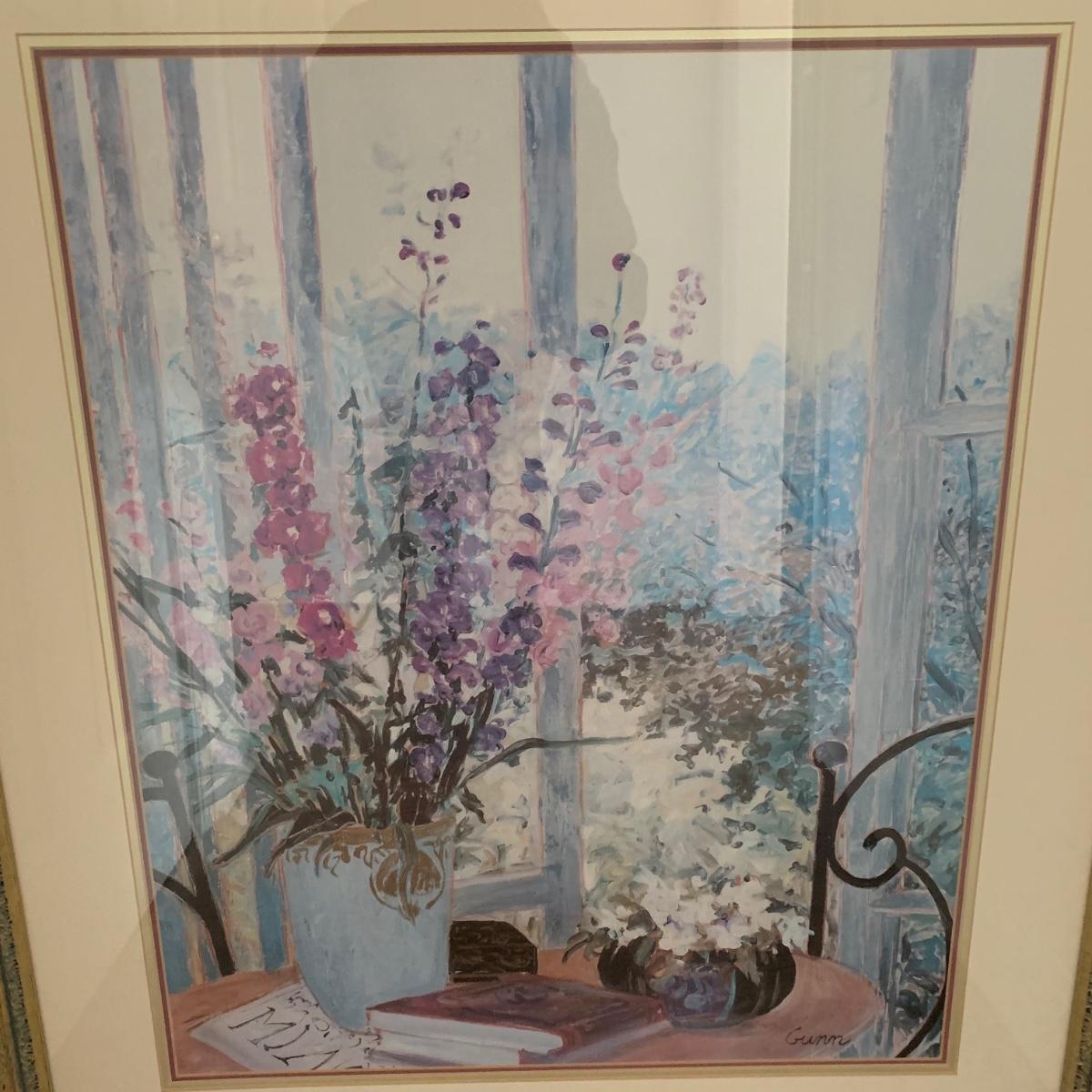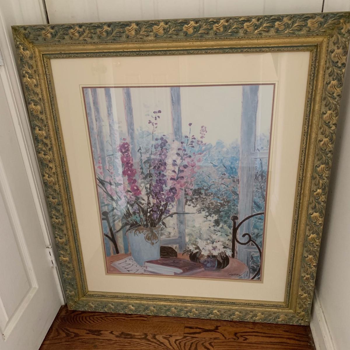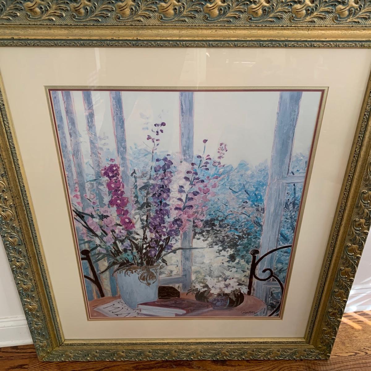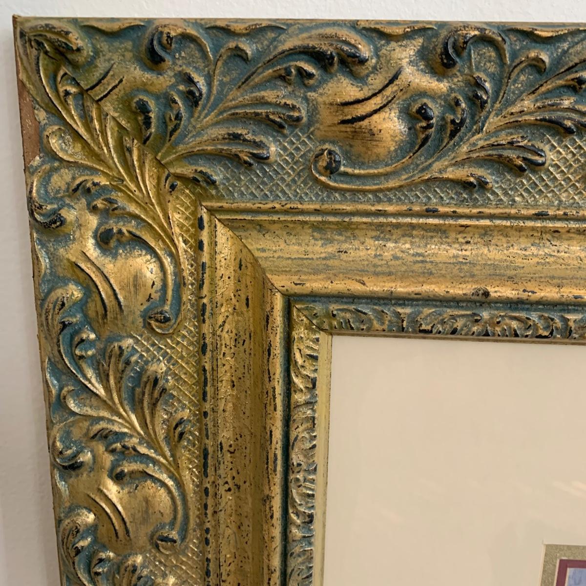 Large floral print behind glass. Print is framed in wood frame finished with ornate gold paint with hints of blue. Print is matted and measures approximately 37” x 42”H.