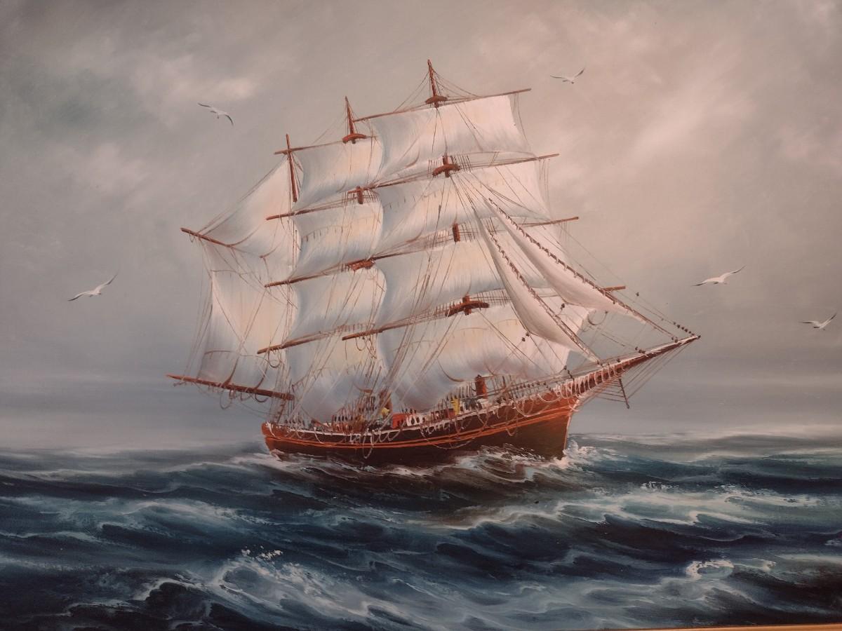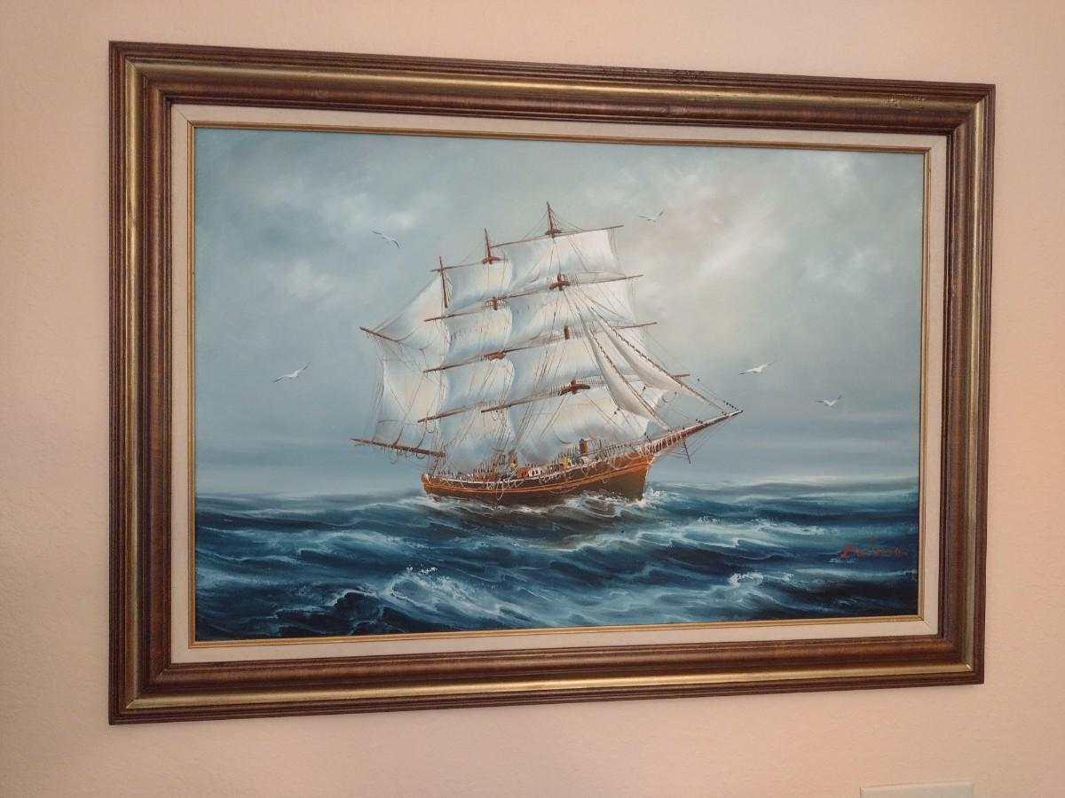 Large Framed Original Art on Canvas Clipper Ship Signed by Artist