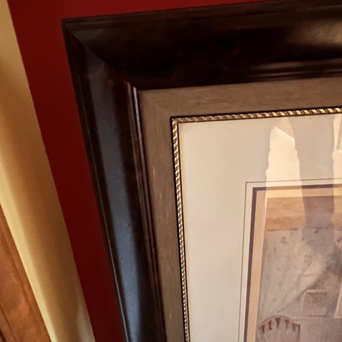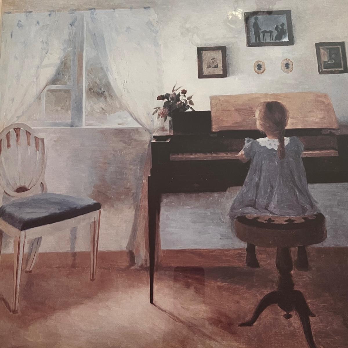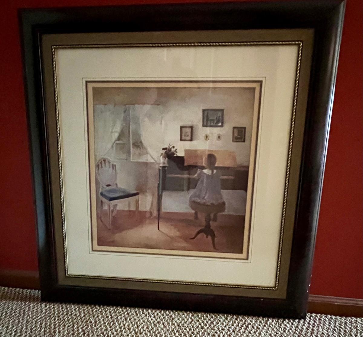 Large print of a girl playing piano. Print is mounted under glass in a brown resin like frame.
