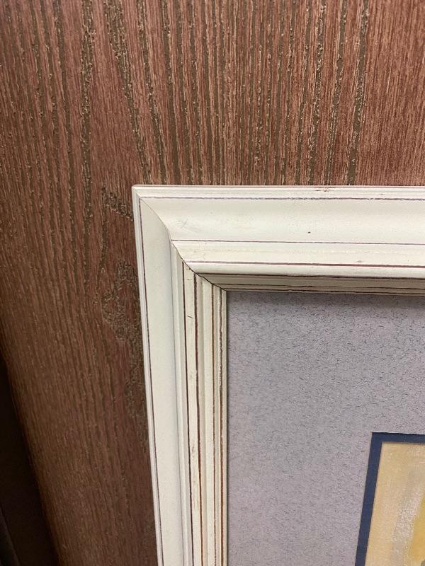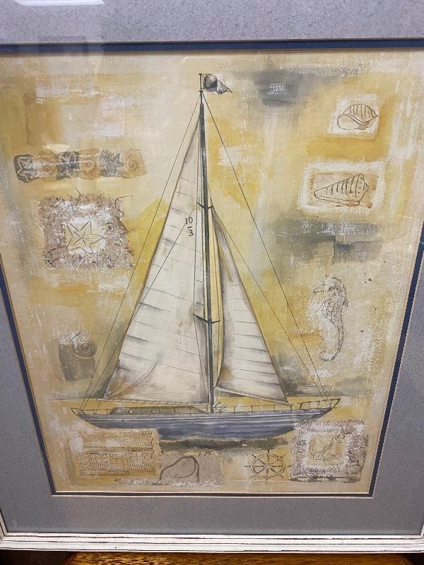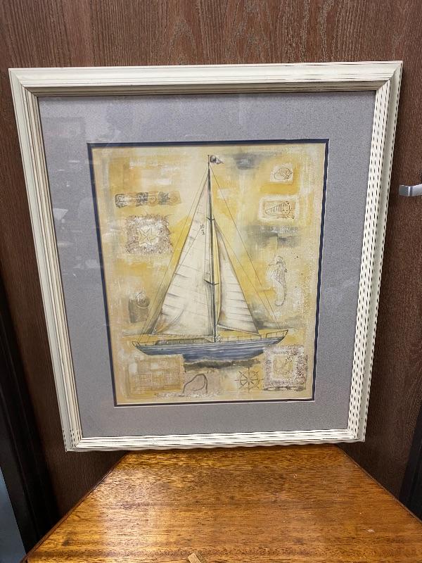 Framed Sail Boat Print. White frame. Pale yellows and blues. Measures 22x26. Has original price tag.