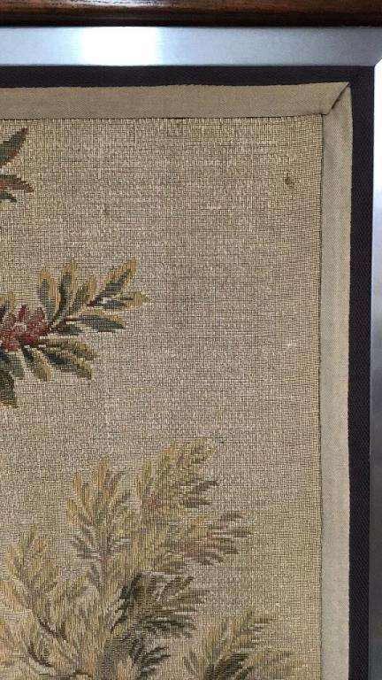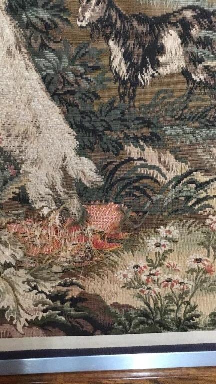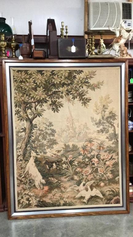 Pastoral scene with goats and birds, windmill in background..staining and pulls to textile..thread loss to lower left..metal and wood frame..75 x 60 inch