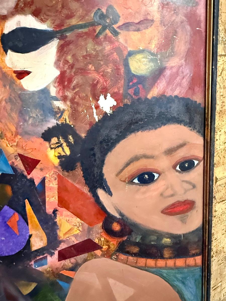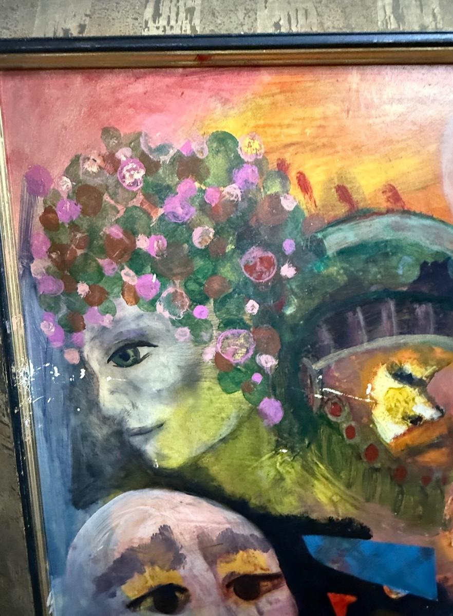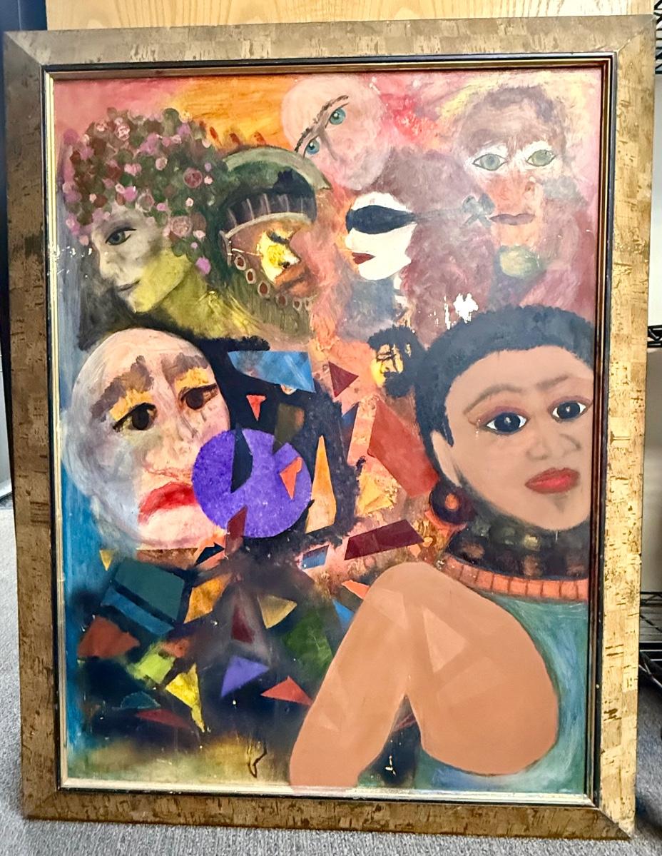 Large size, approx. 46” x 36”. A few damaged spots, see photos. Water-based paint on masonite.