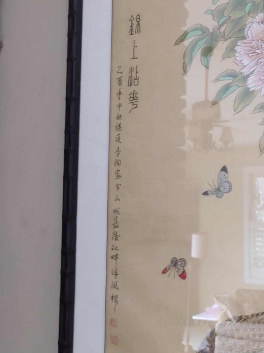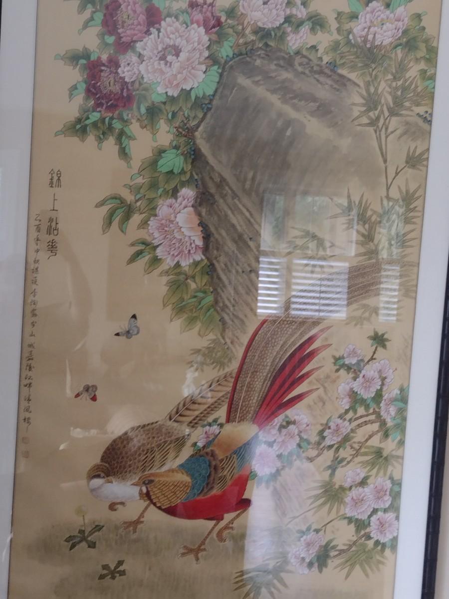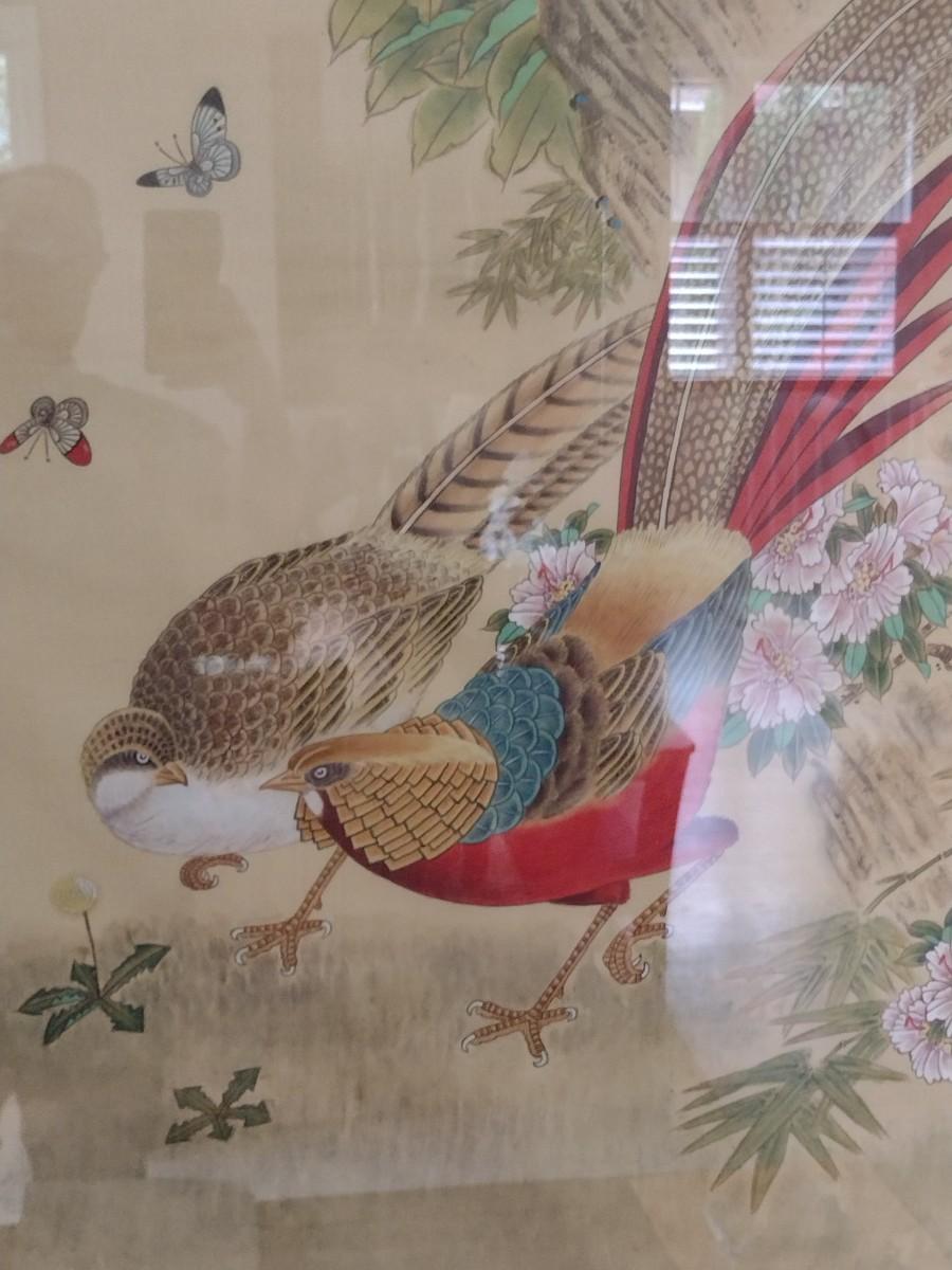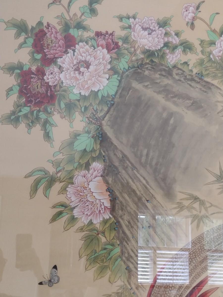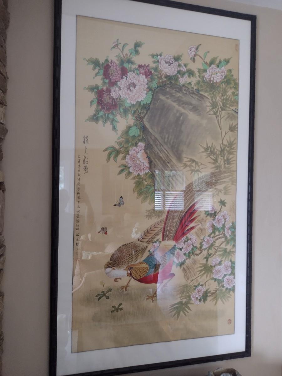 Large Framed with Glass Asian Peonies and Pheasants Artwork