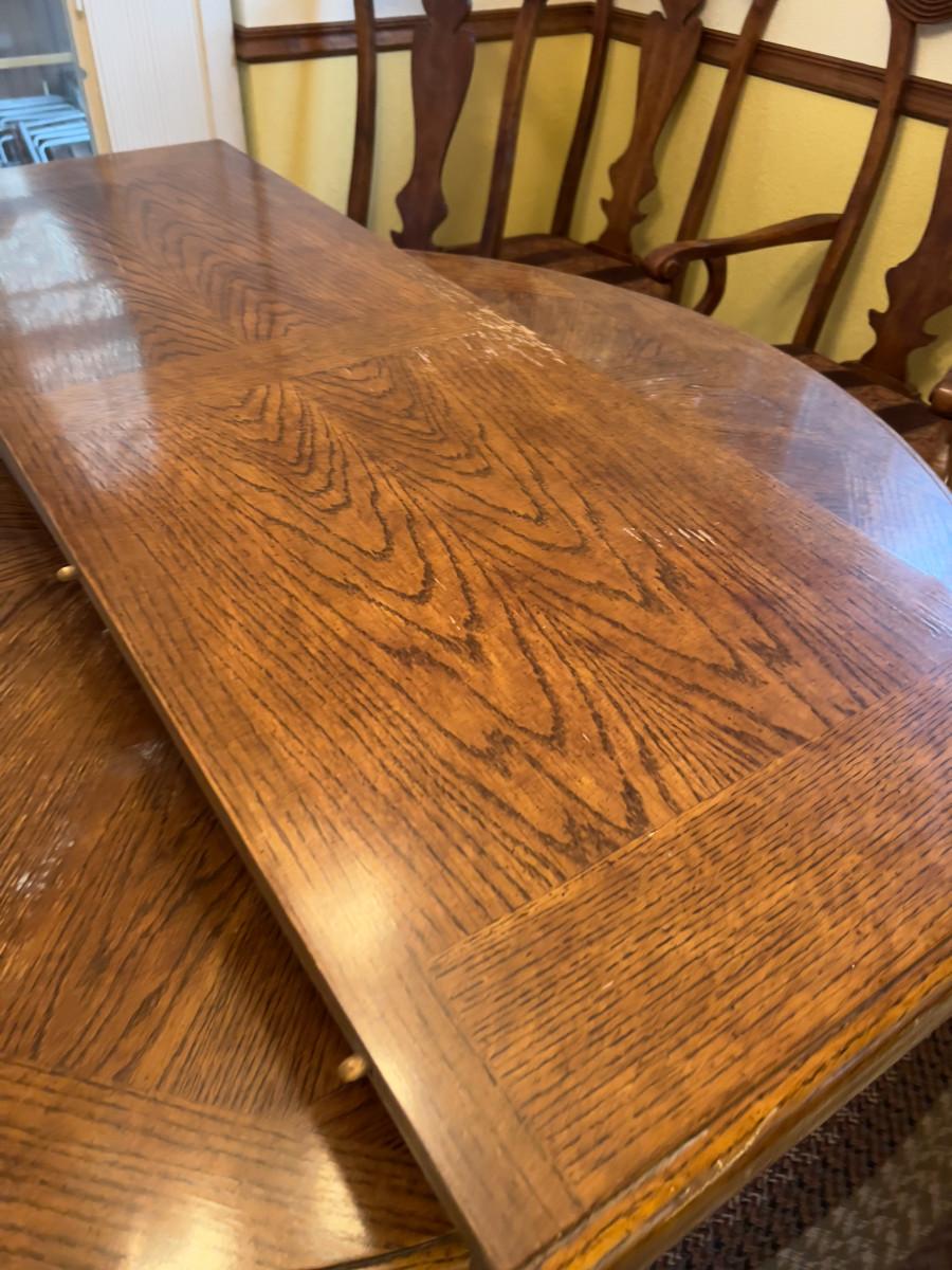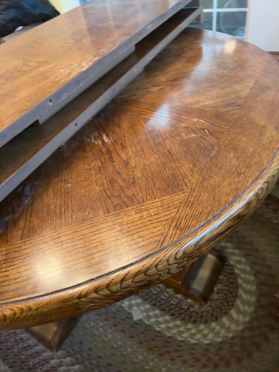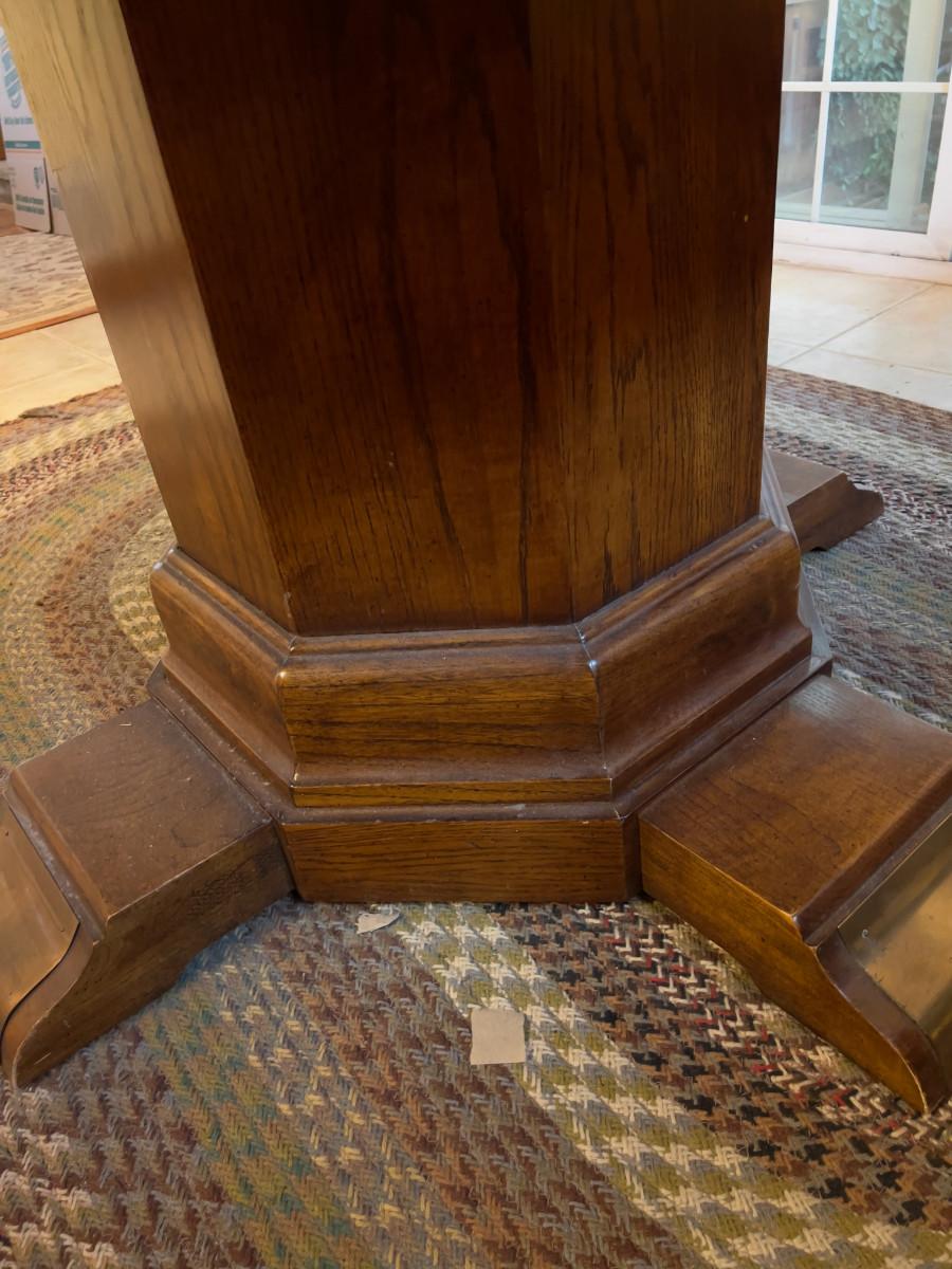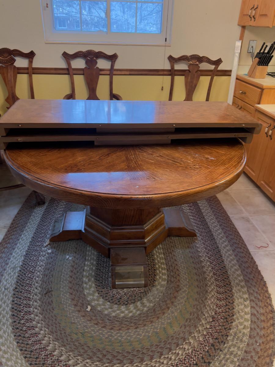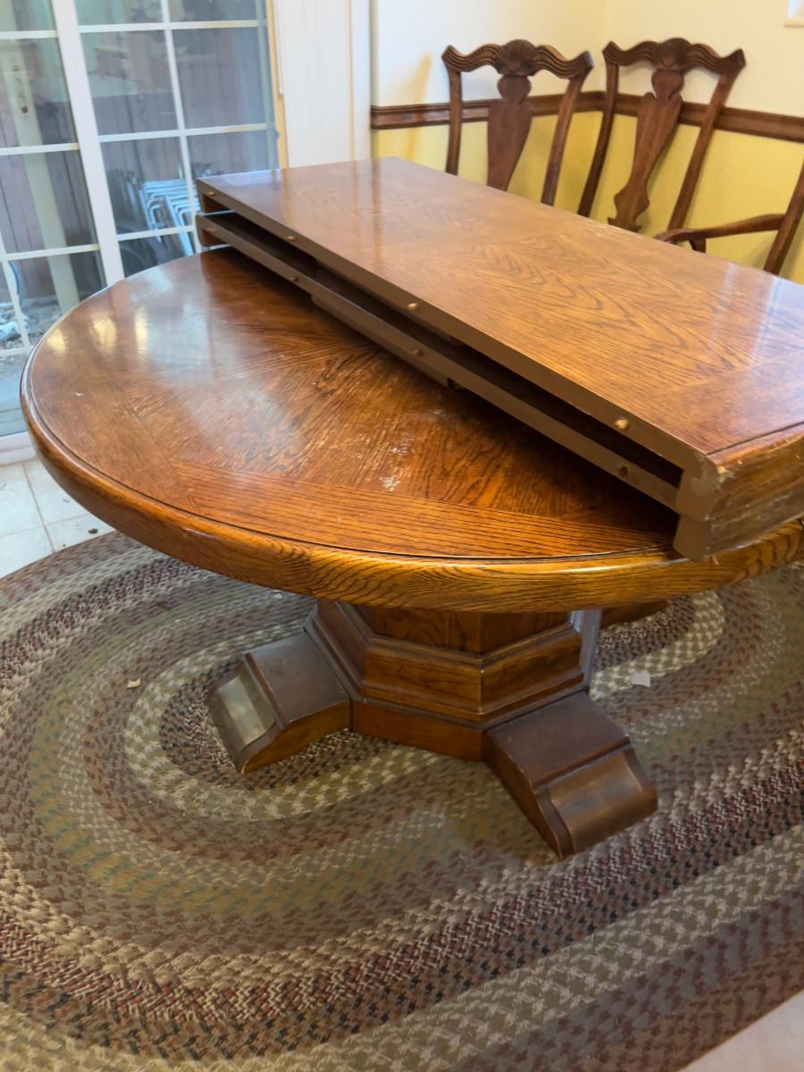 54" Diameter. Plus 2 leaves at 18" Each. Huge and Heavy BRING HELP! Its up stairs. Our Backs are damaged from years of furniture moving. Please be prepared to move and transport by self.