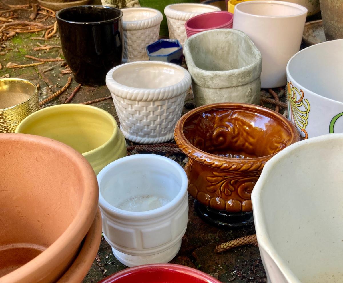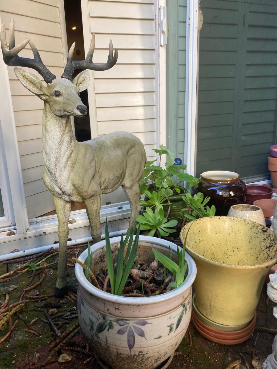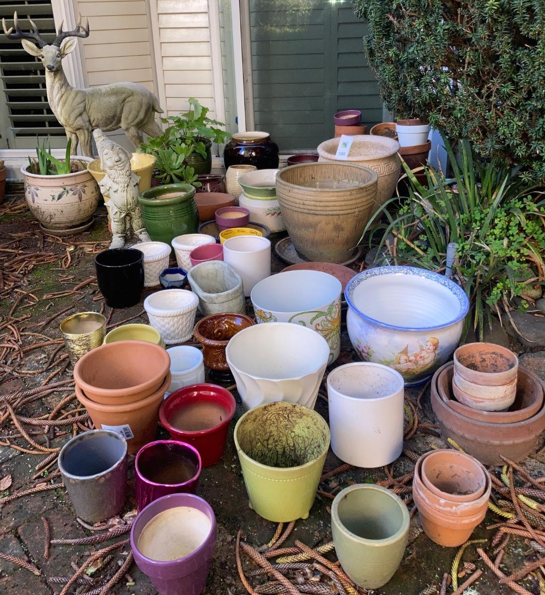 Large lot of pots and garden statuary including a concrete garden gnome and a resin deer. Approx. 65 pcs