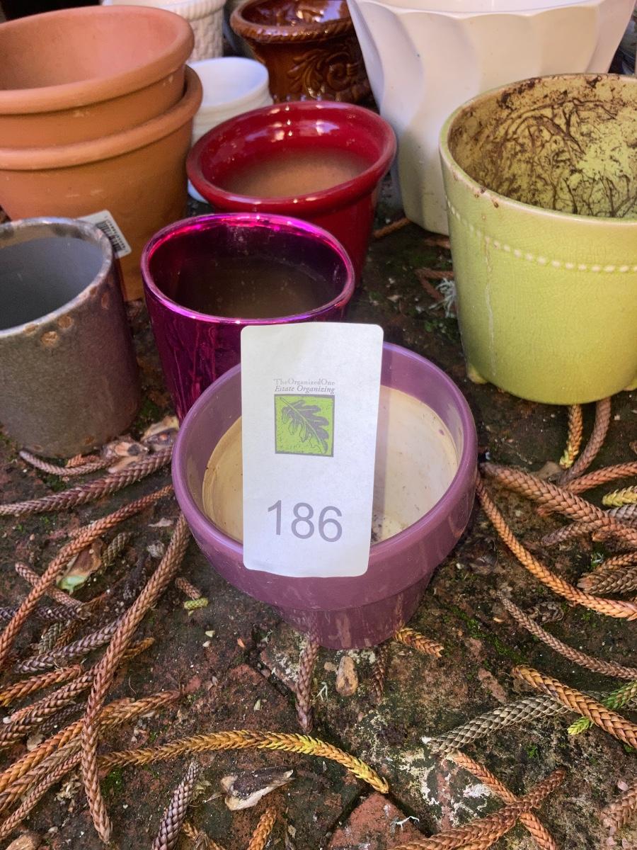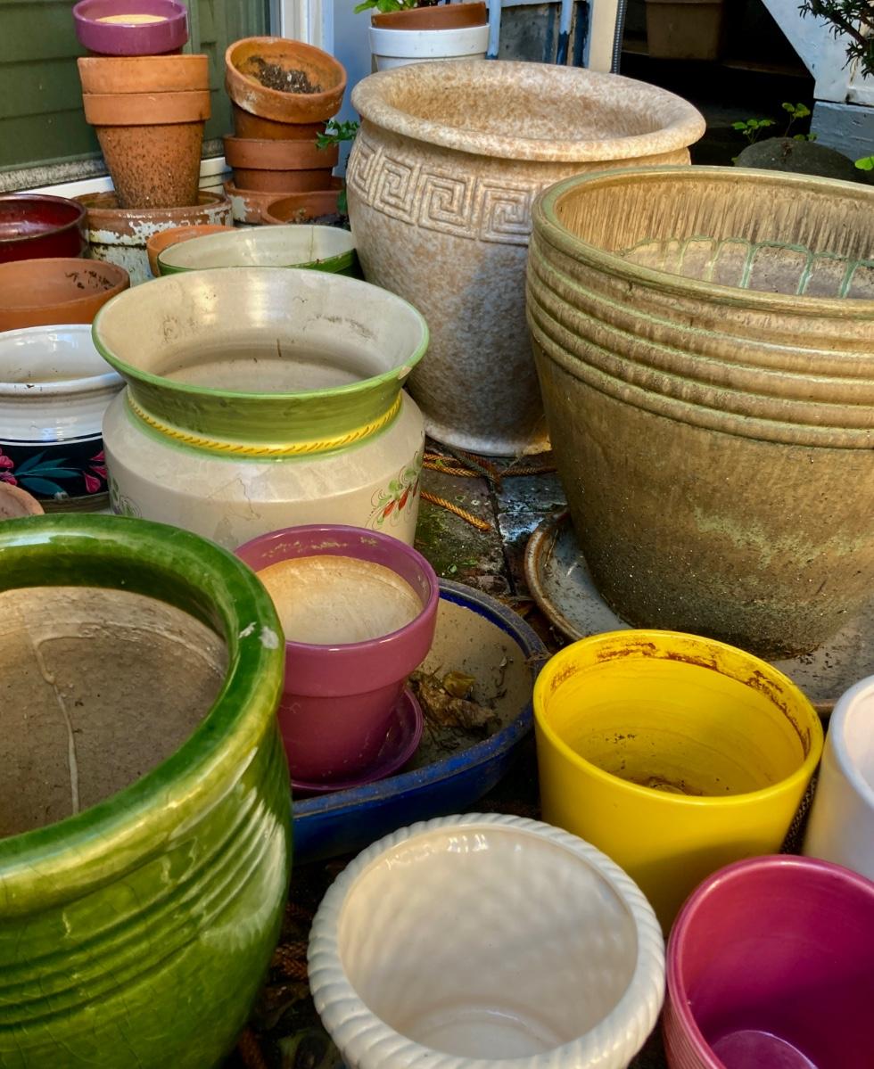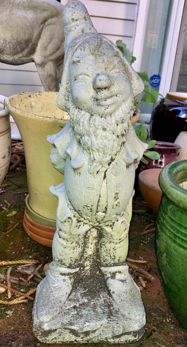 Large lot of pots and garden statuary including a concrete garden gnome and a resin deer. Approx. 65 pcs