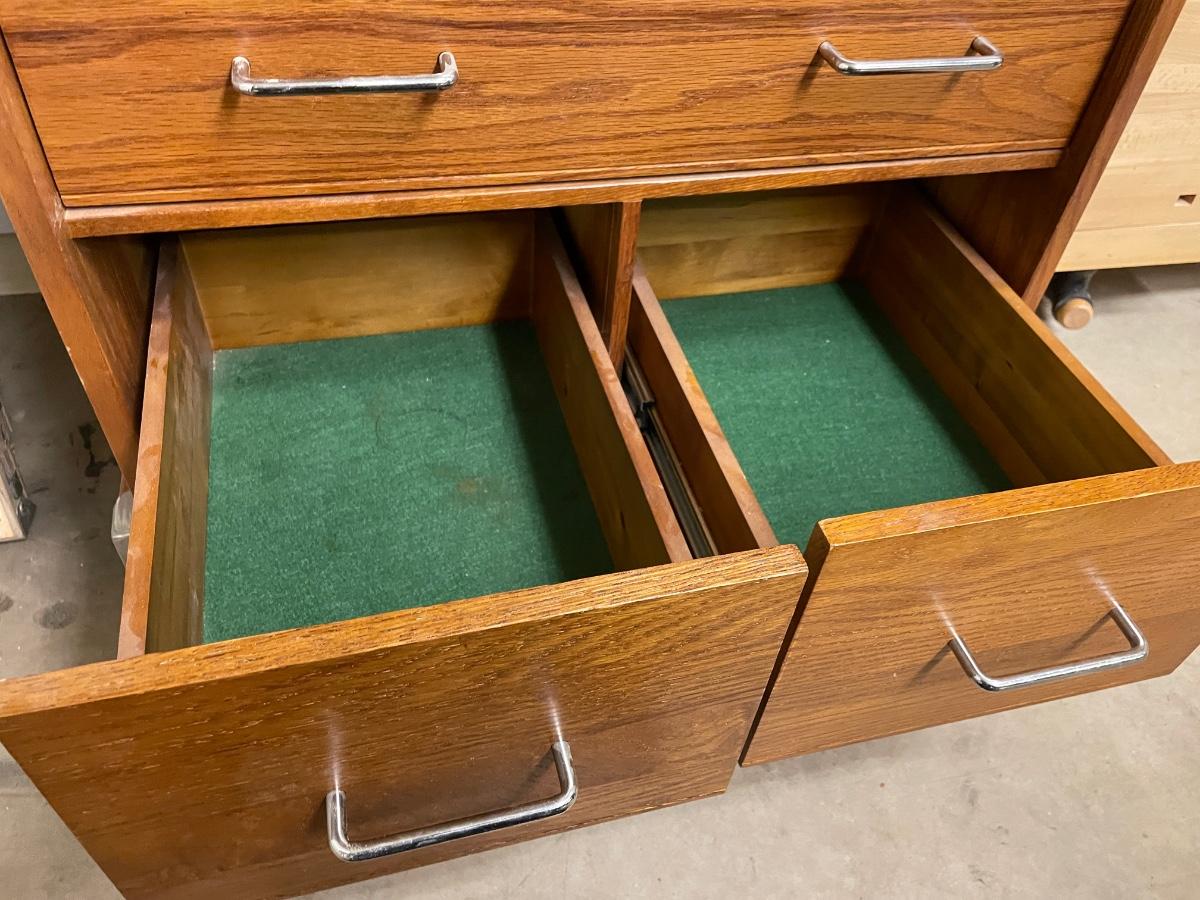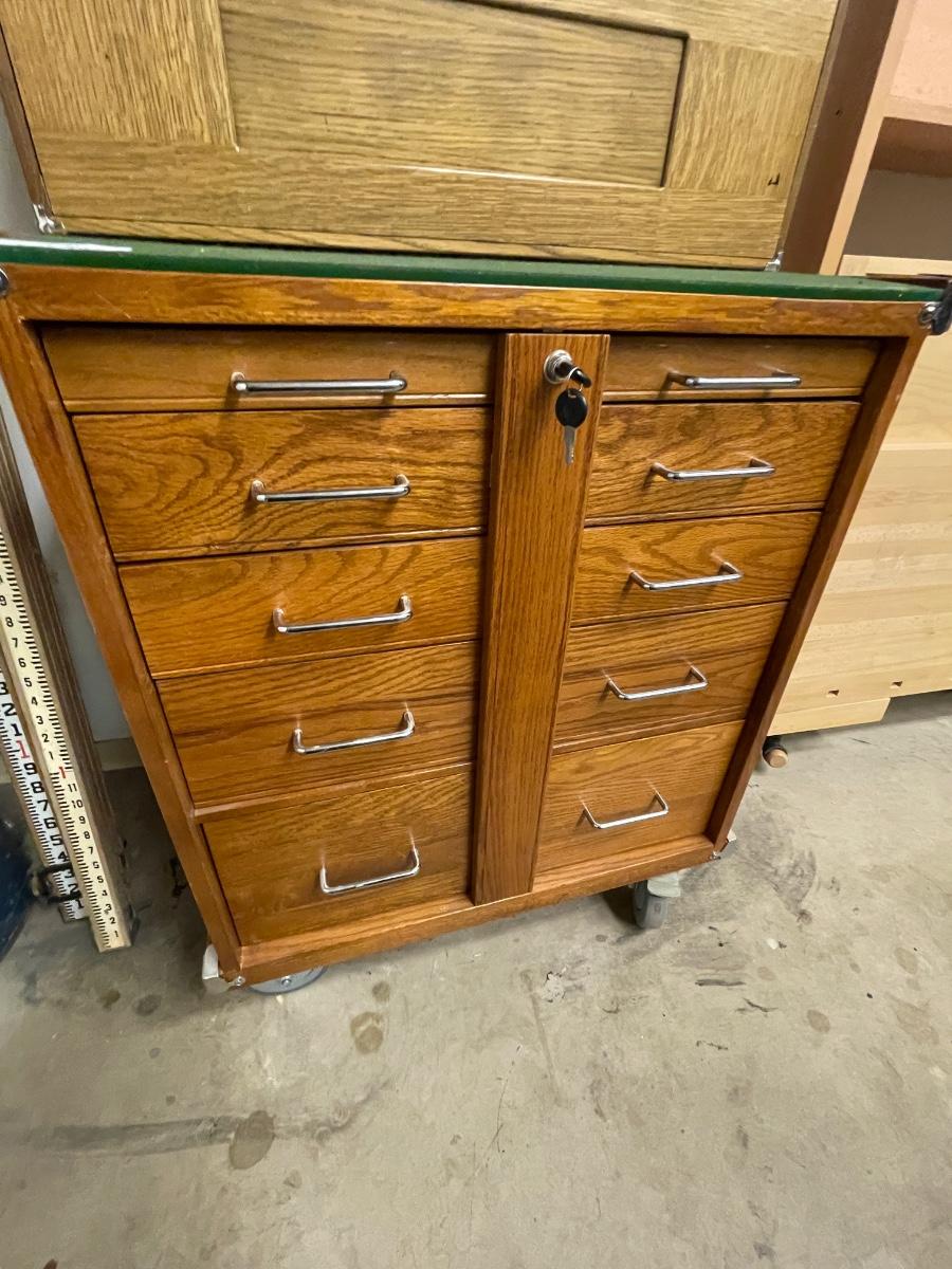 6 drawer rolling wood cabinet that locks with 2 keys on locking cross pieces.