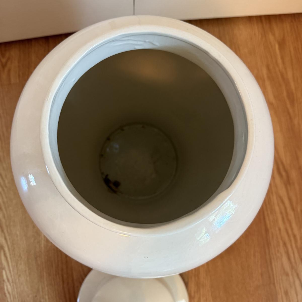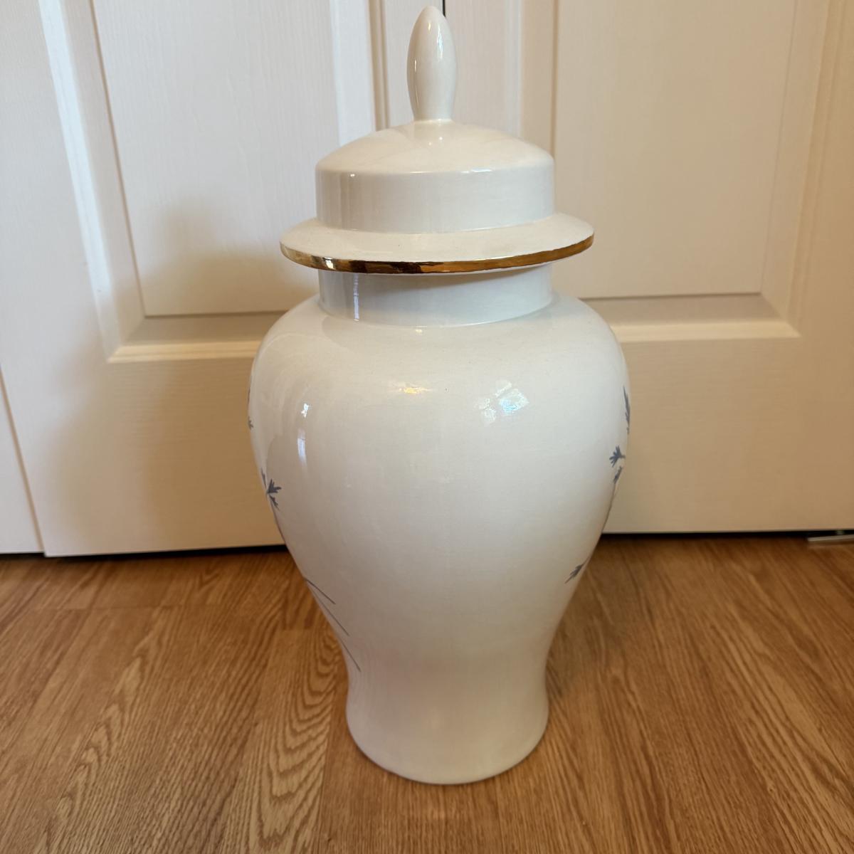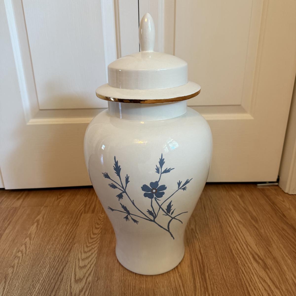 This lot contains a timeless large ceramic ginger jar. This large lidded vase measures approximately 10”D x 21”H. The base has a 6.5”D. It has a lovely floral and golden accents on the side, there is no signature. Shipping available.