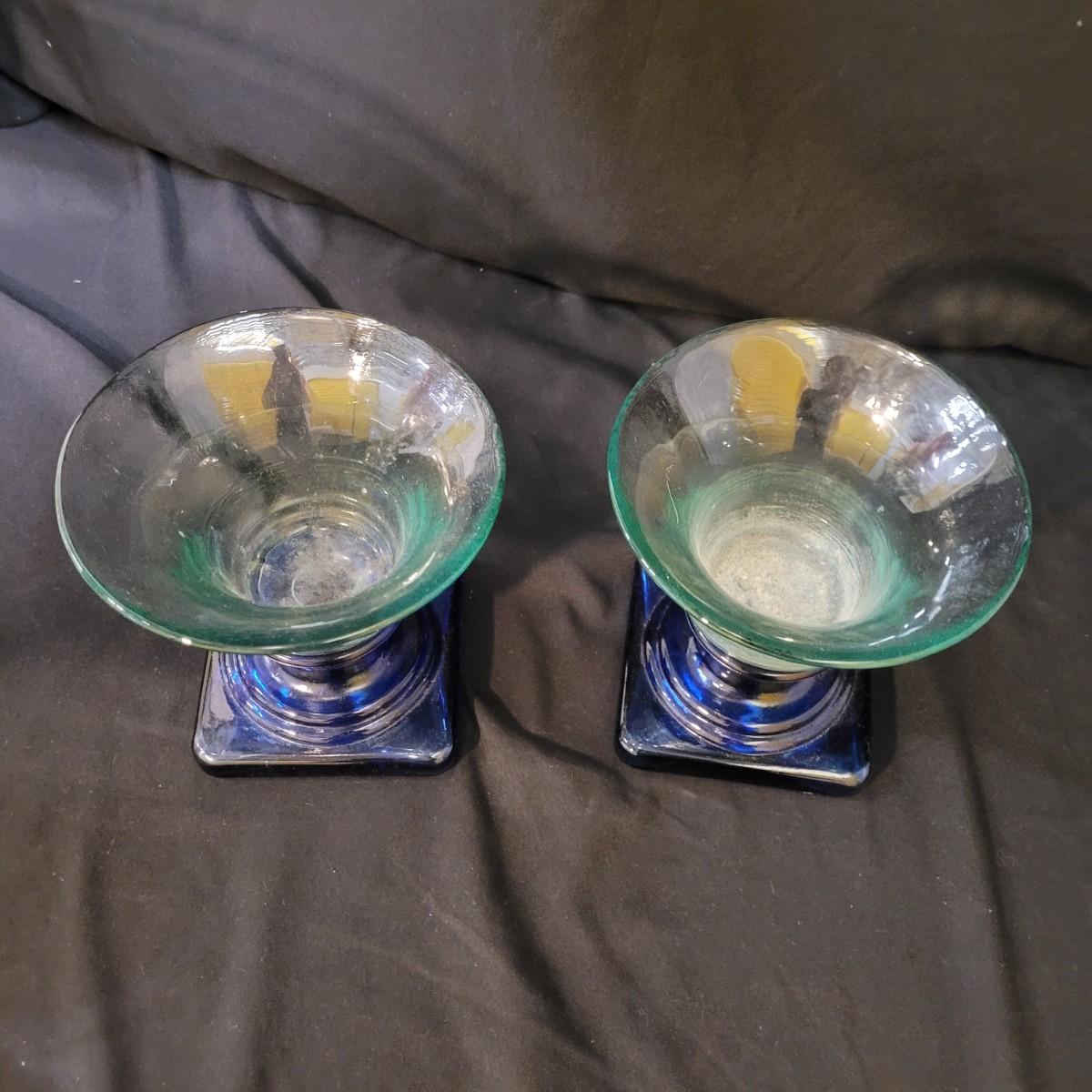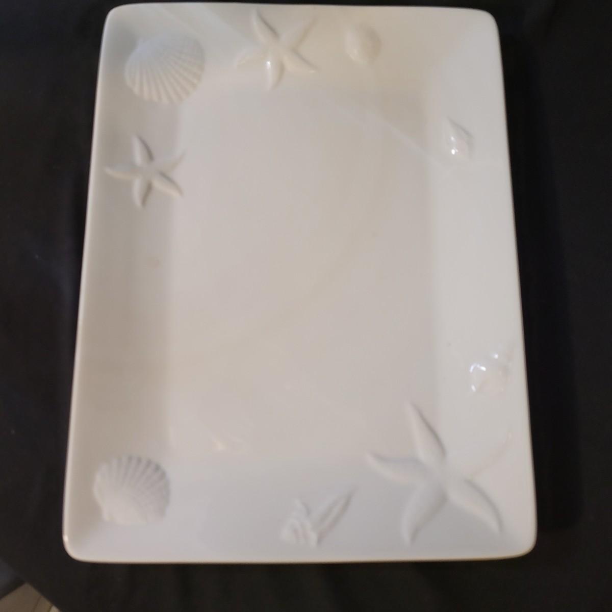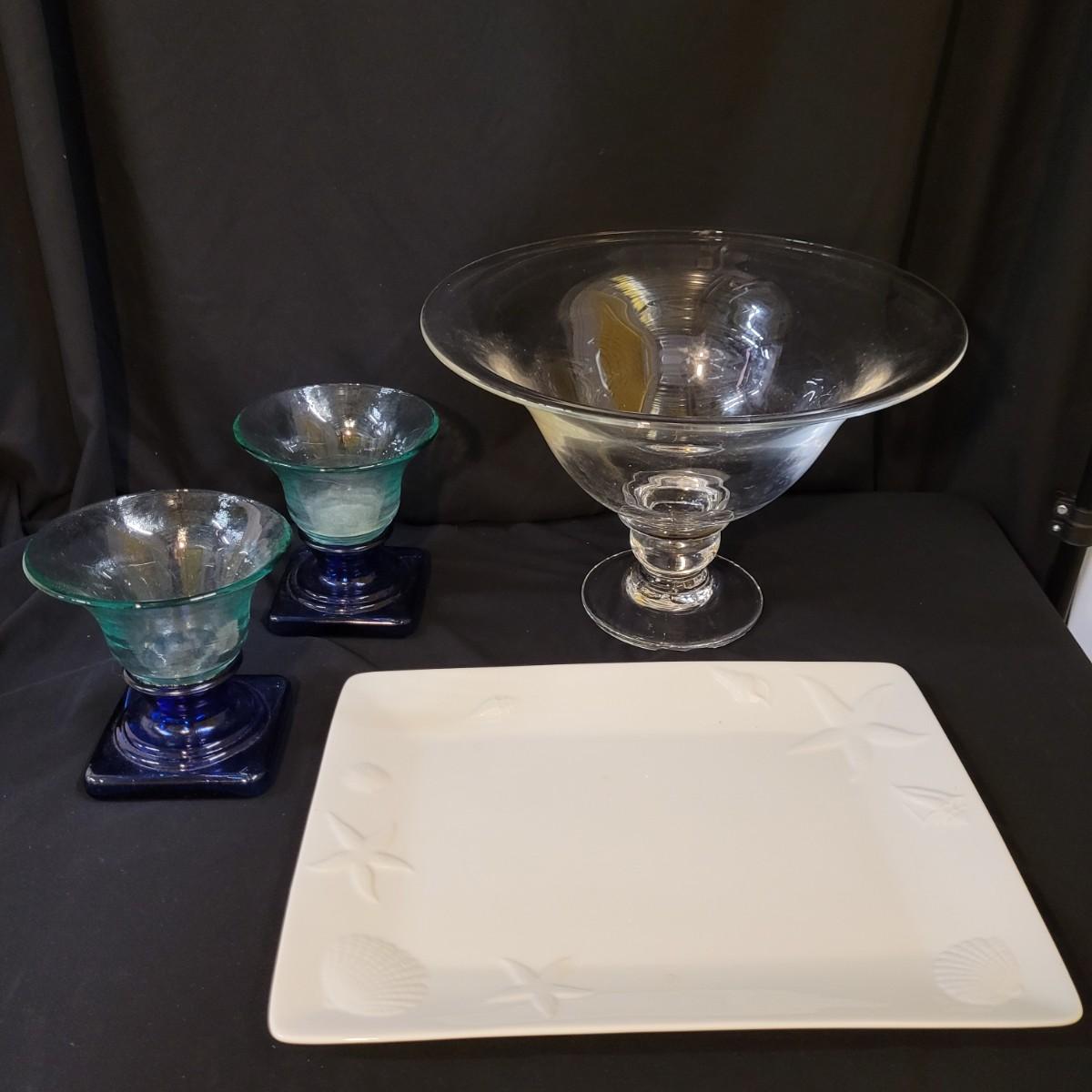 Very large glass bowl (likely made by Simon Pearce in Vermont).. also includes two smaller two toned blue bowls on sturdy, thick square bases. Large serving platter with seashell relief by Pottery Barn. Platter measures approximately 16.5"x12.5", large bowl 15.5"DIA x10"H. Shipping available.