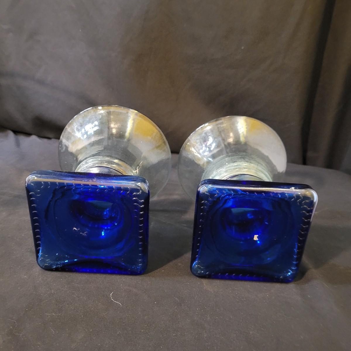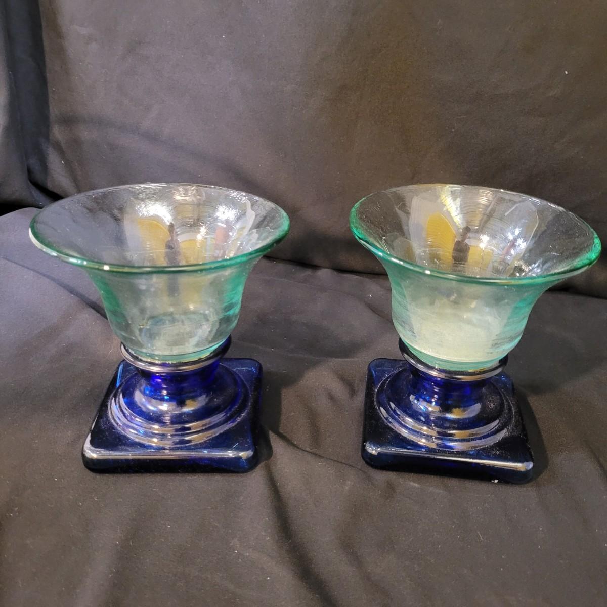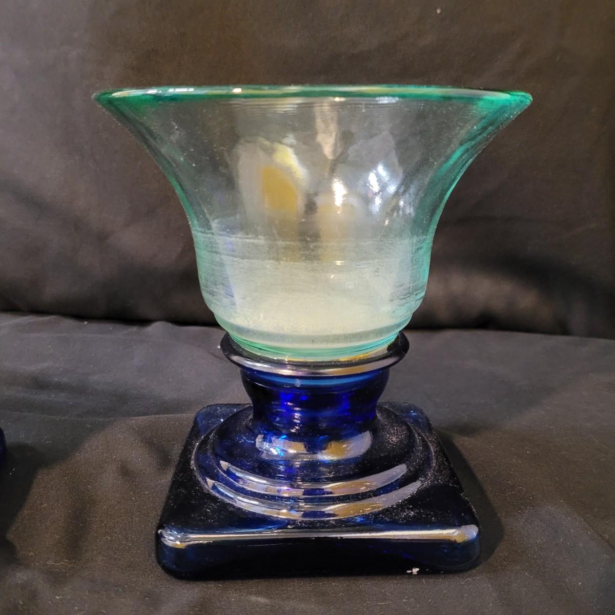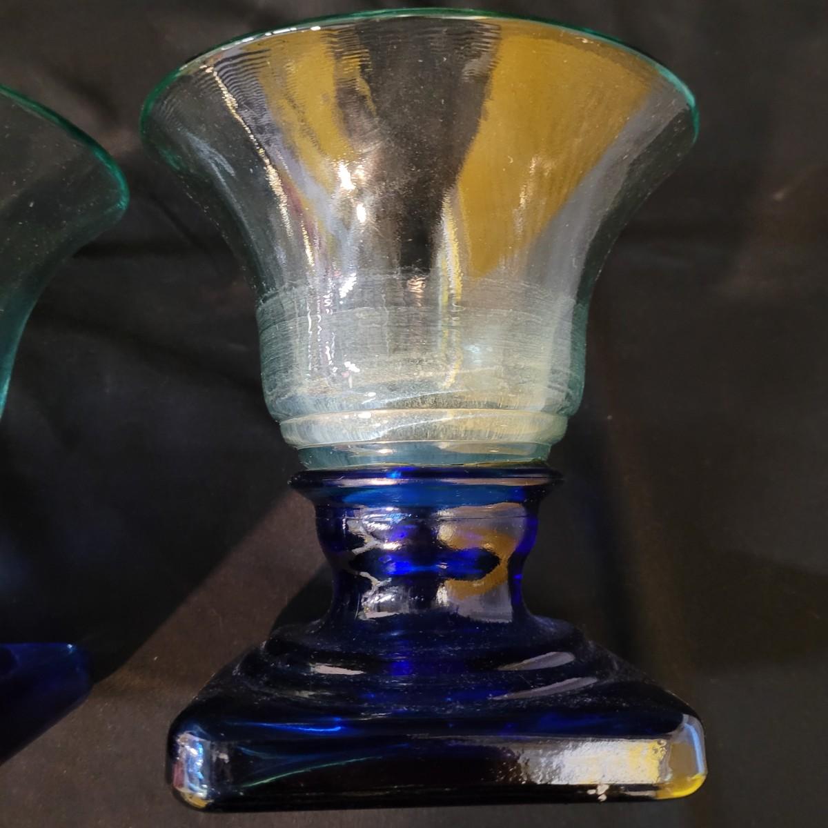 Very large glass bowl (likely made by Simon Pearce in Vermont).. also includes two smaller two toned blue bowls on sturdy, thick square bases. Large serving platter with seashell relief by Pottery Barn. Platter measures approximately 16.5"x12.5", large bowl 15.5"DIA x10"H. Shipping available.