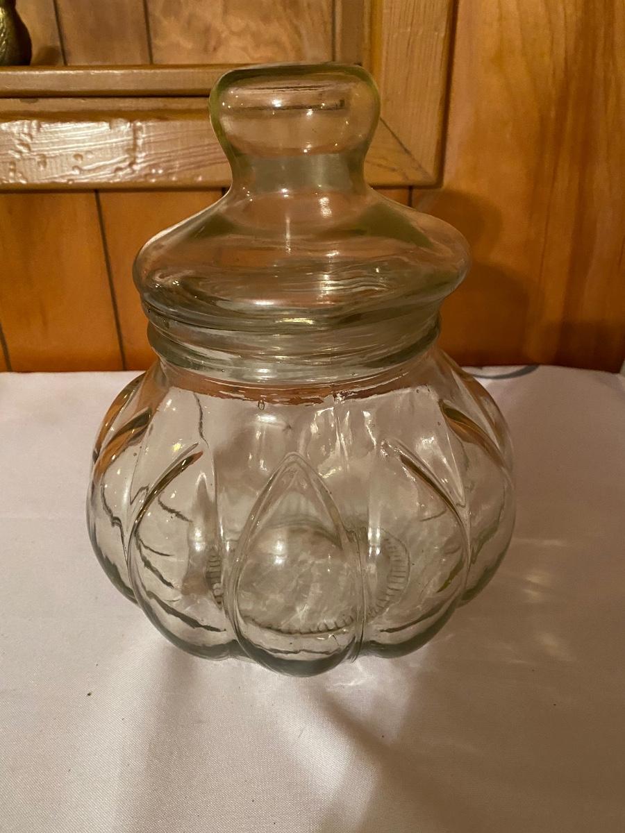 Large glass “bubble” jar with lid. Great for candy or display. Approx 10”h x 9”w