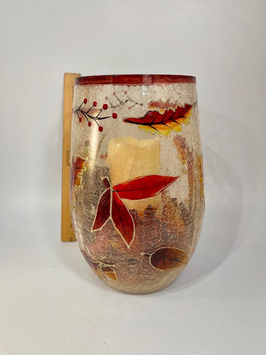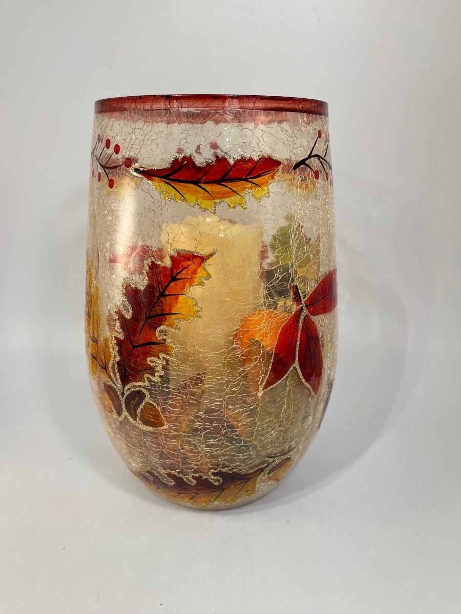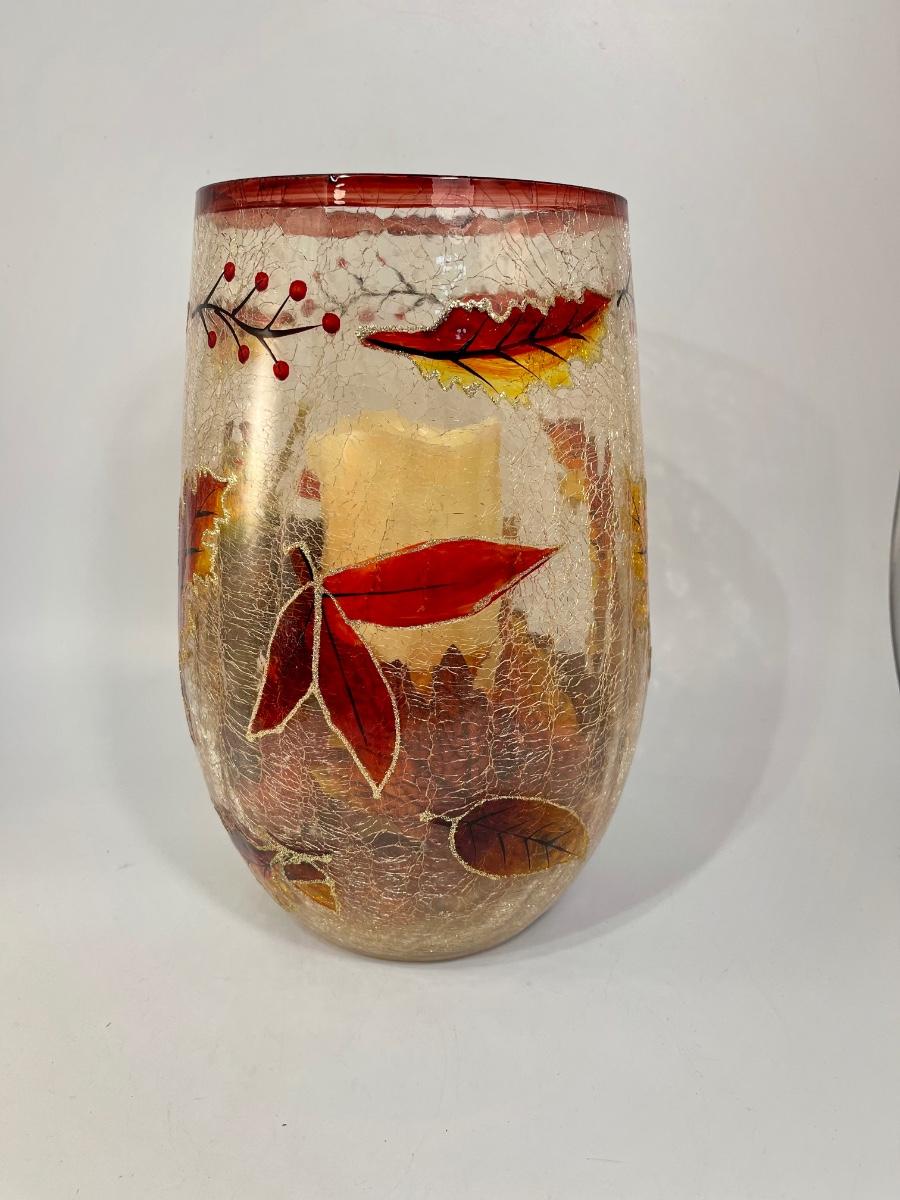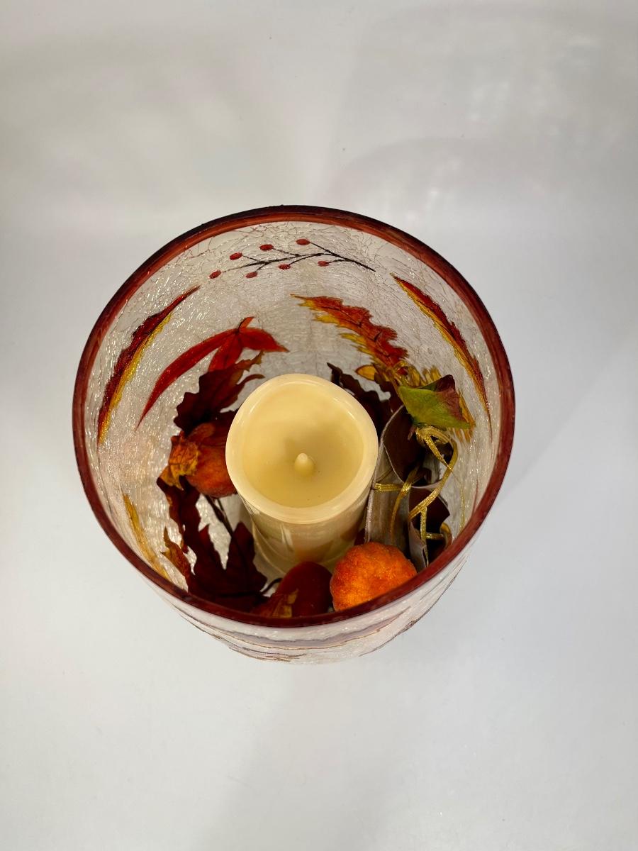 Large Glass Fall Christmas Holiday candle holder with faux candle and decor