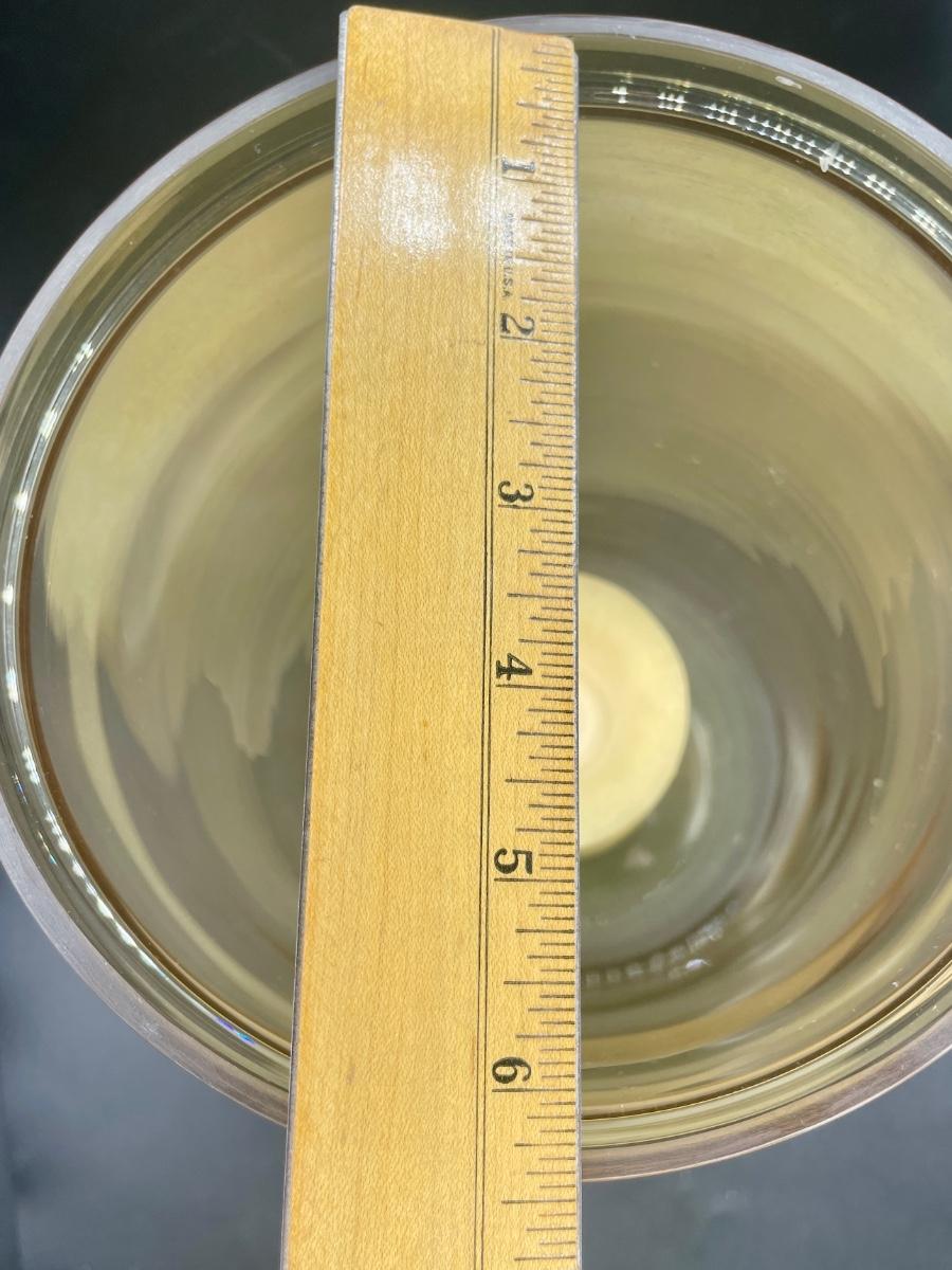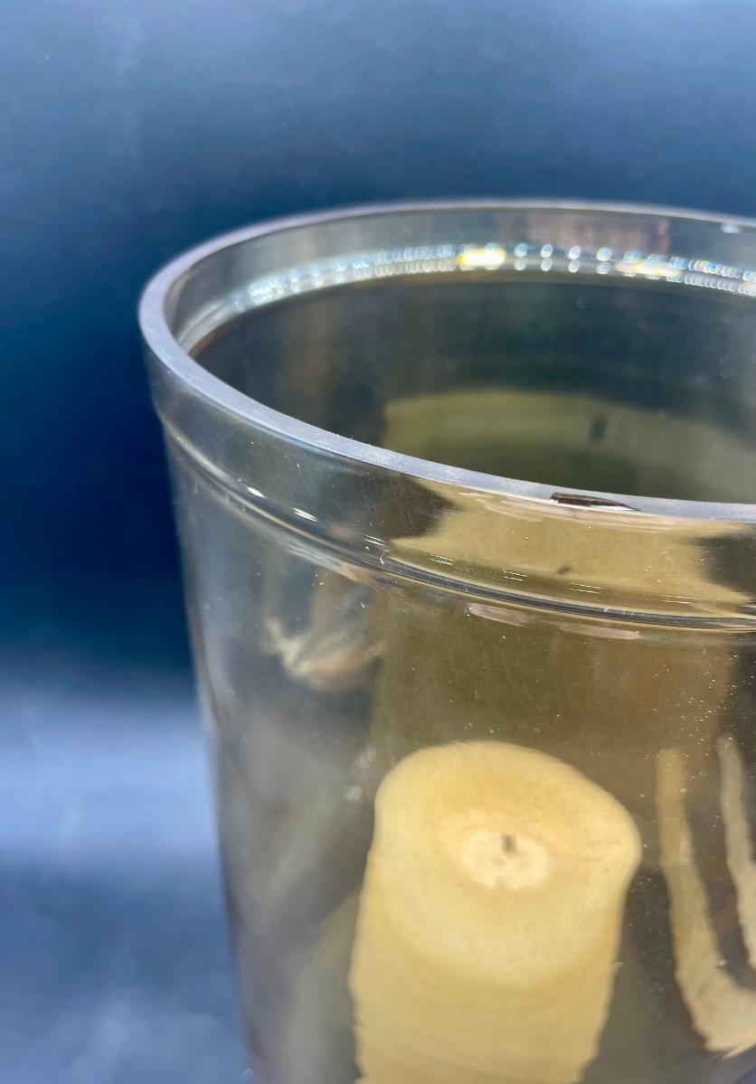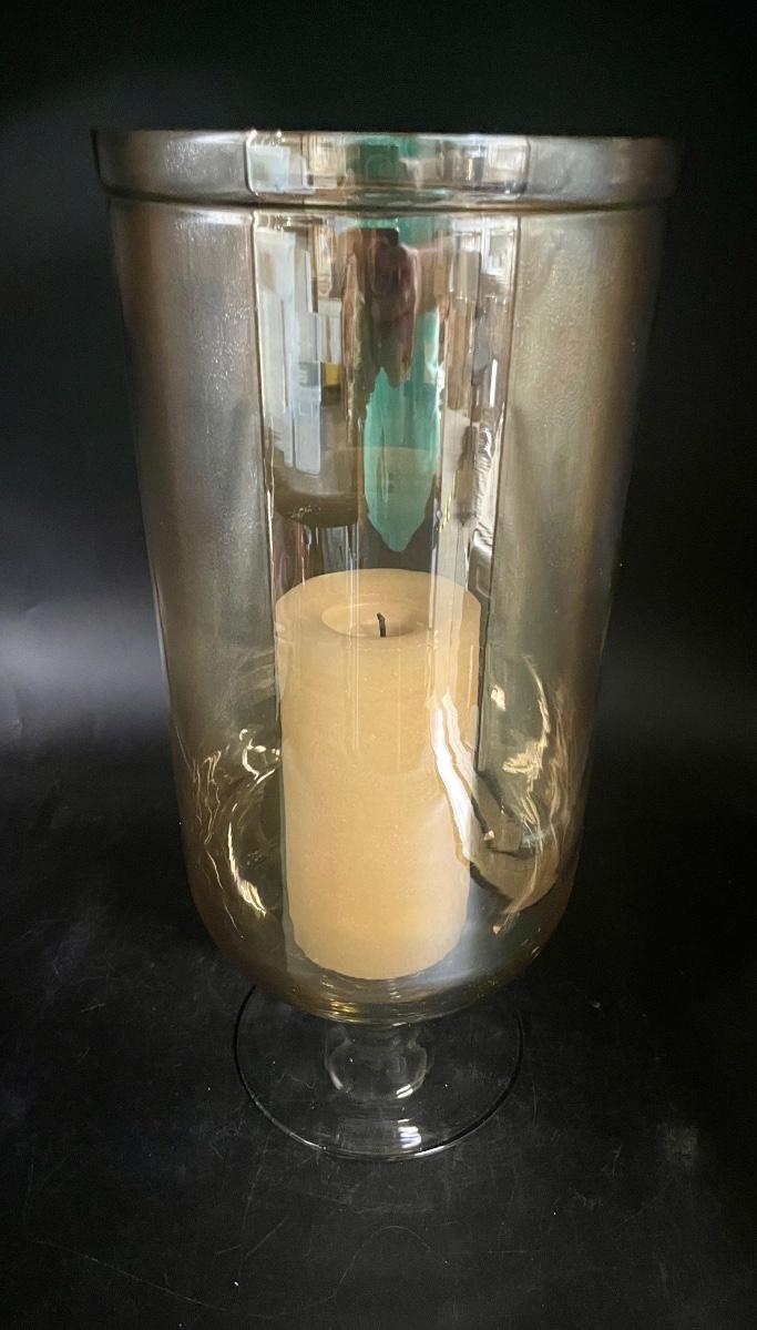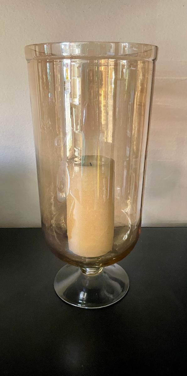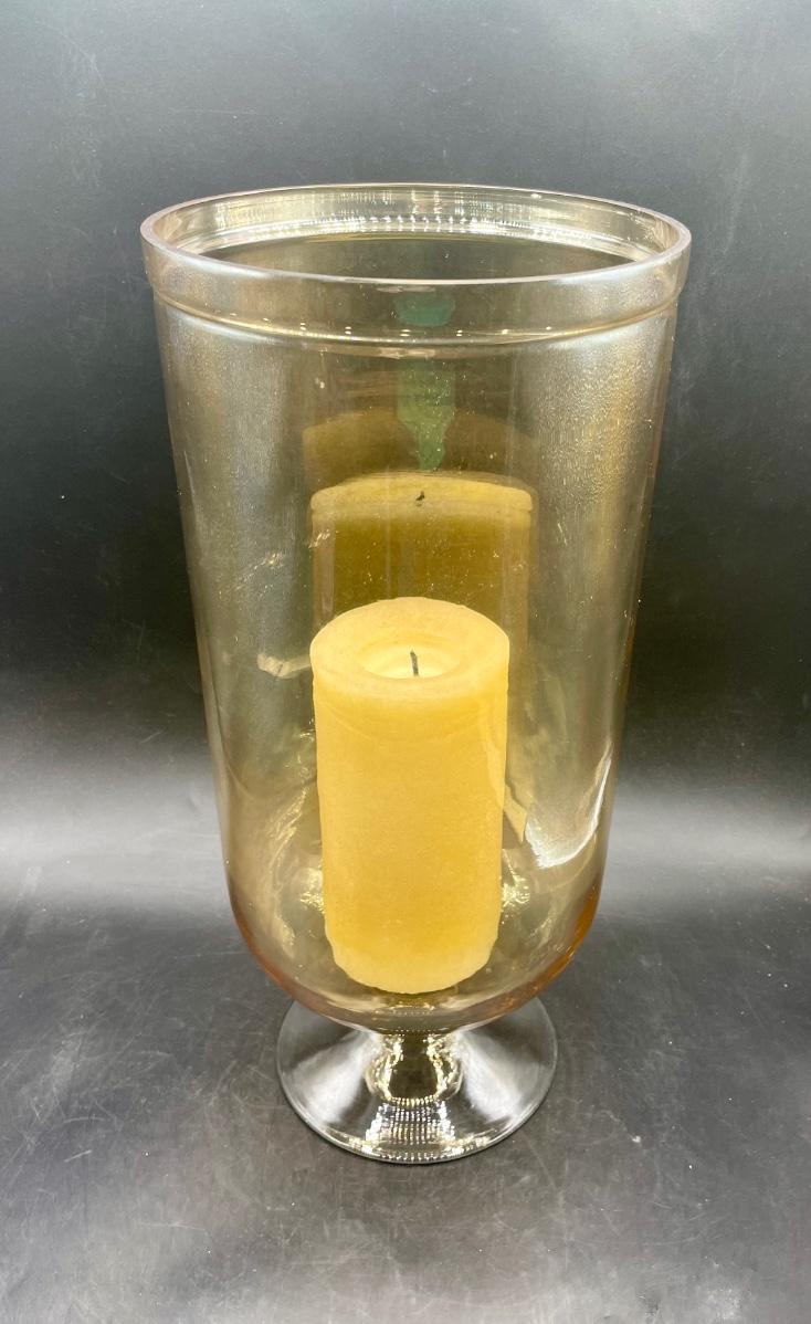 Amber Glass Large Footed 15" Glass Vase, approx. 6.5" diameter. Can easily hold a large candle. Good condition.