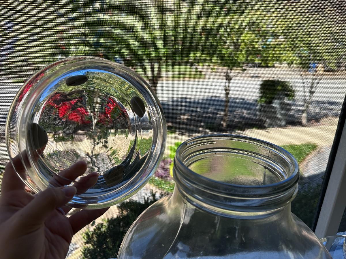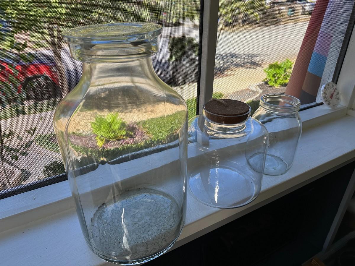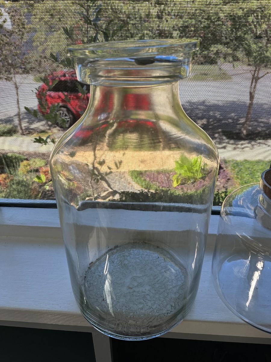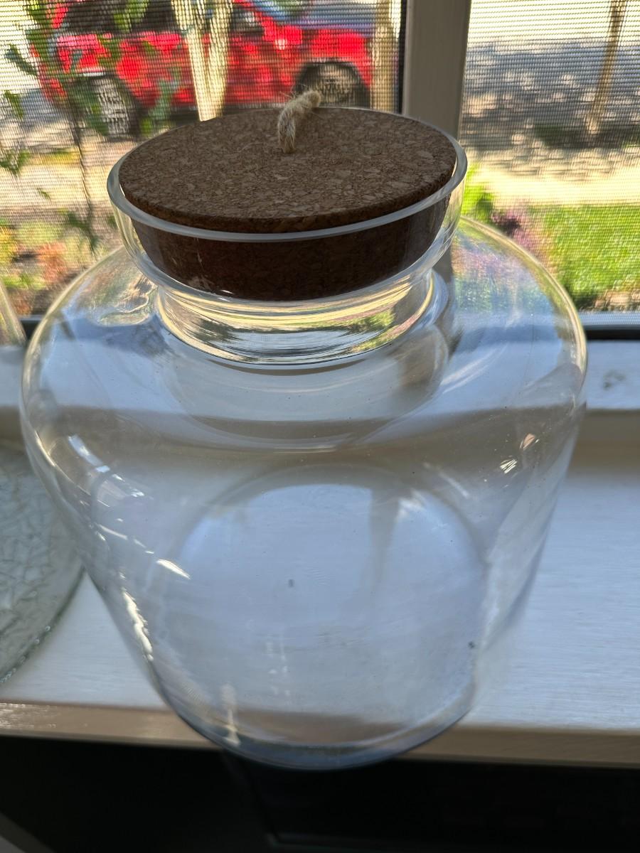 1 Xl Jar 19"H x 11"w w/Glass Lid. 1 11"h x 10"w w/Cork Lid, 1 10"h x 7"w with no lid.