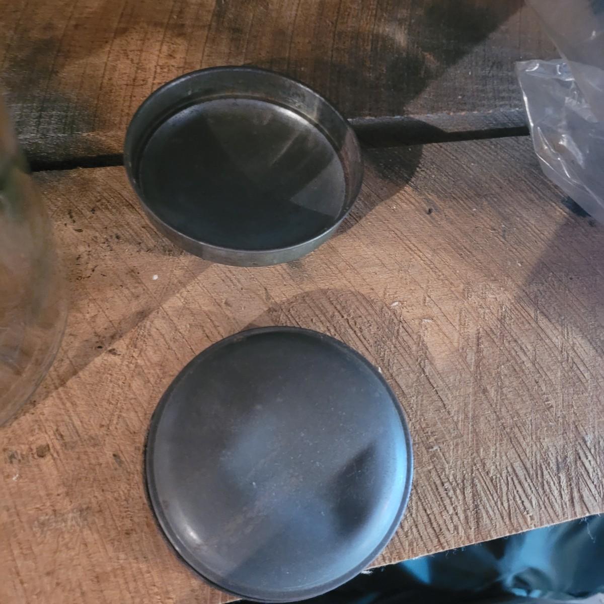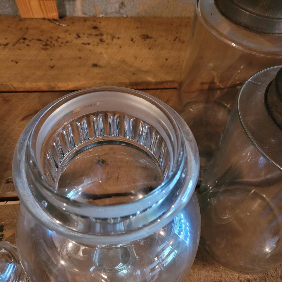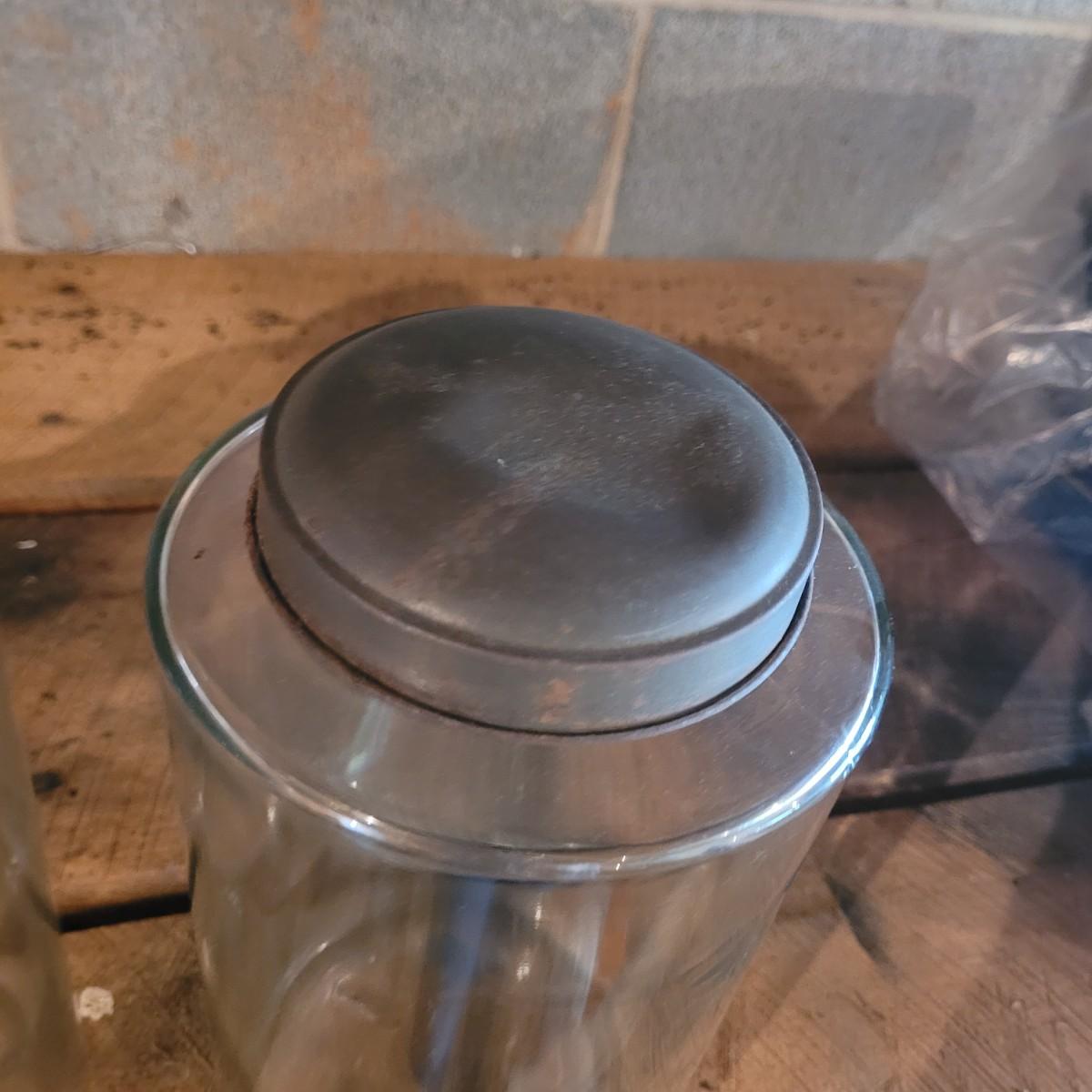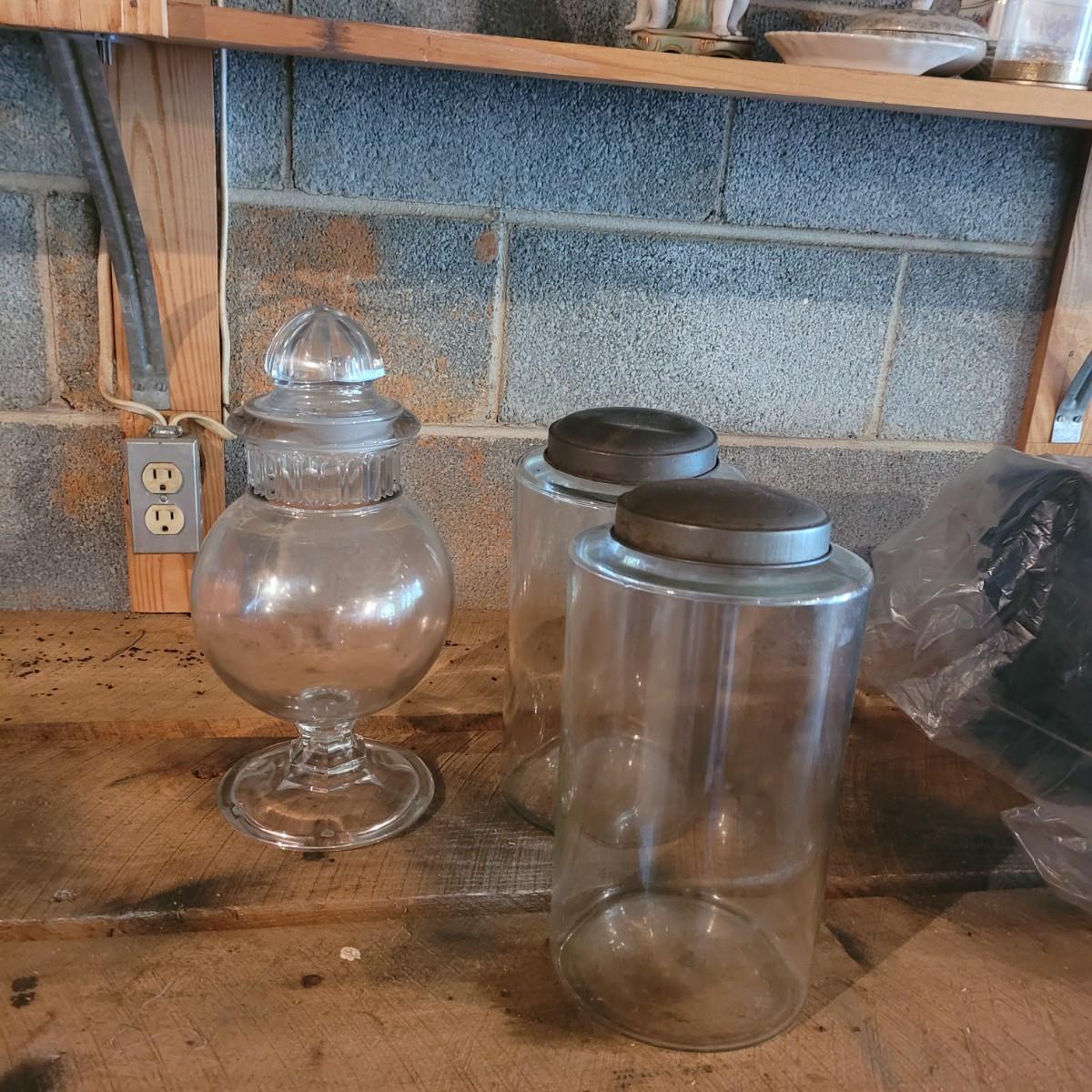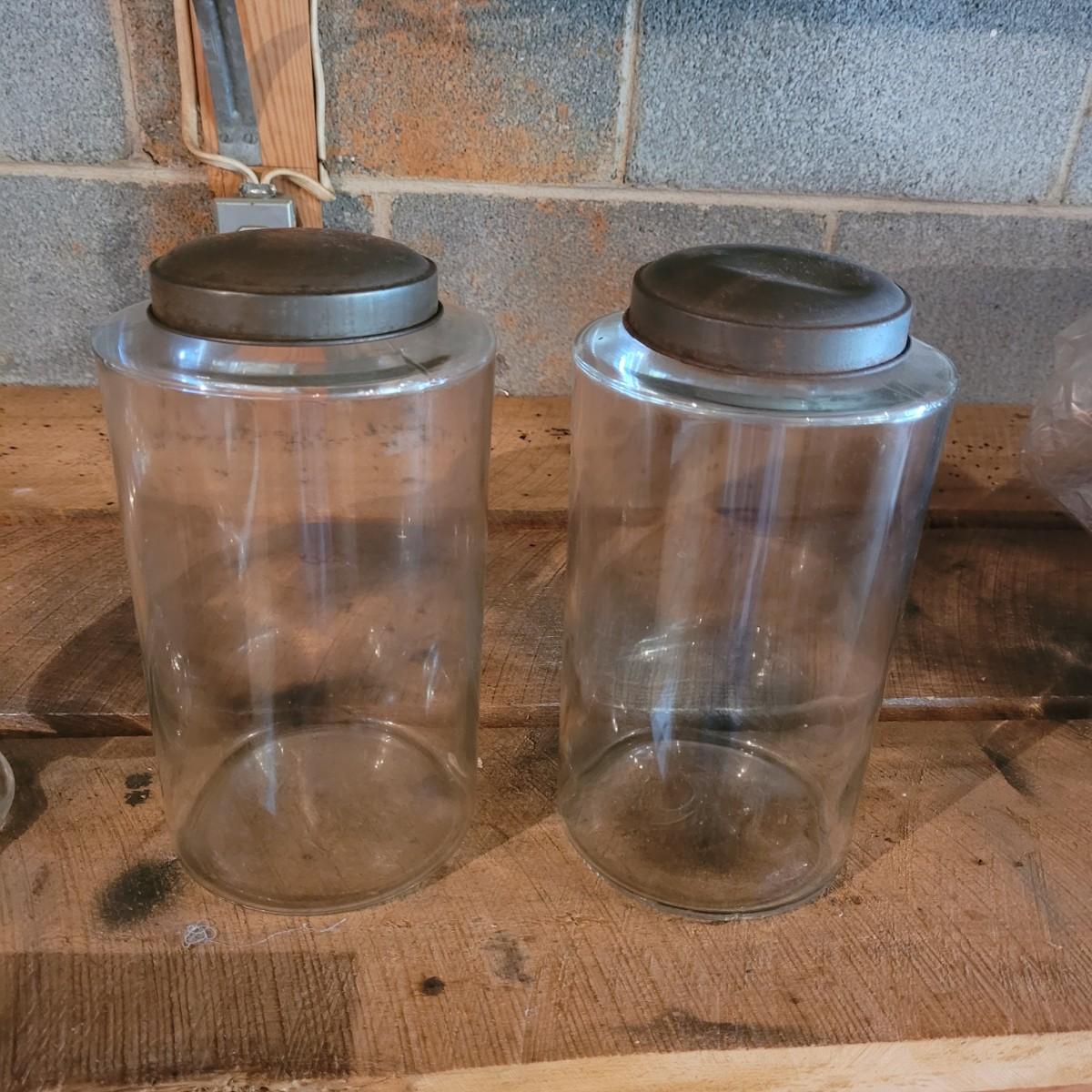 Collection of three large lidded jars. Rust accumulation on metal lids and some chipping at the mouth (see photos). Cylindrical jars measure approximately 6"D at base, 4"D at mouth, and 12"H. Shipping available.