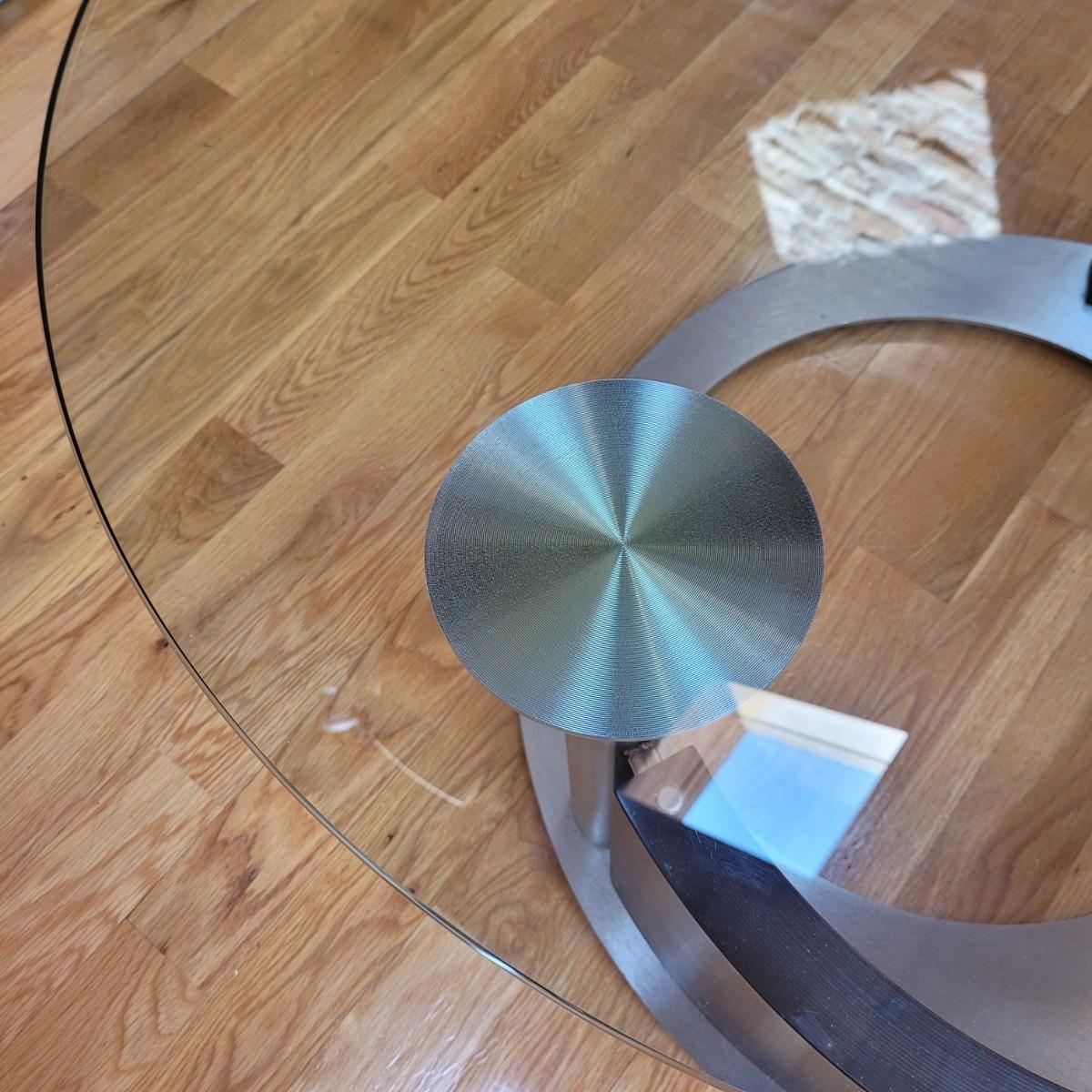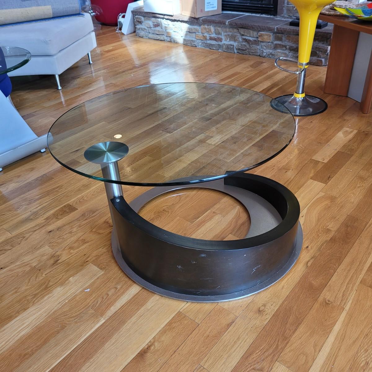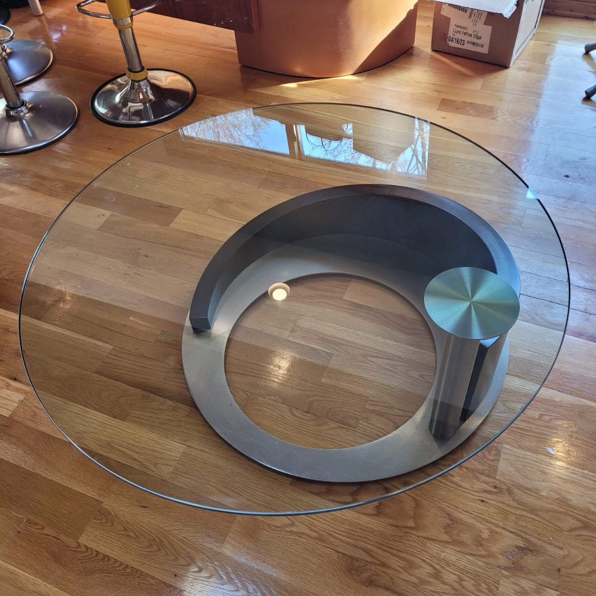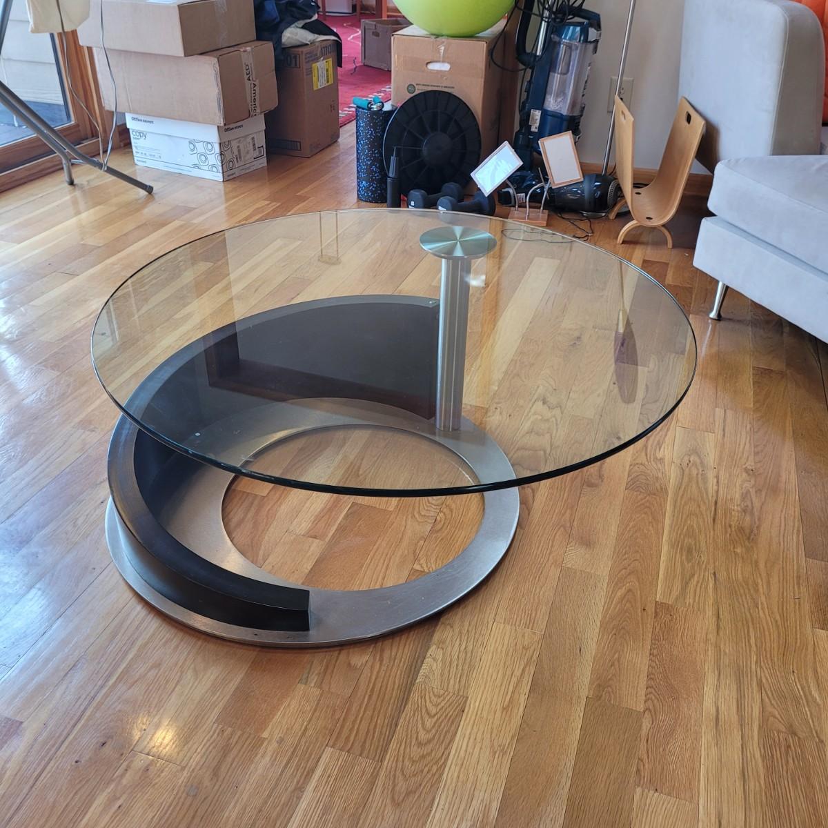 Large glass top coffee table with swivel top has a wide metal base with sloping rounded wooden accent piece. Some light scratches throughput (see photos). Measures approximately 36"D x 17.5"H. Local pickup only. Winning bidder must bring assistance to help move and load this item due to its weight and size.