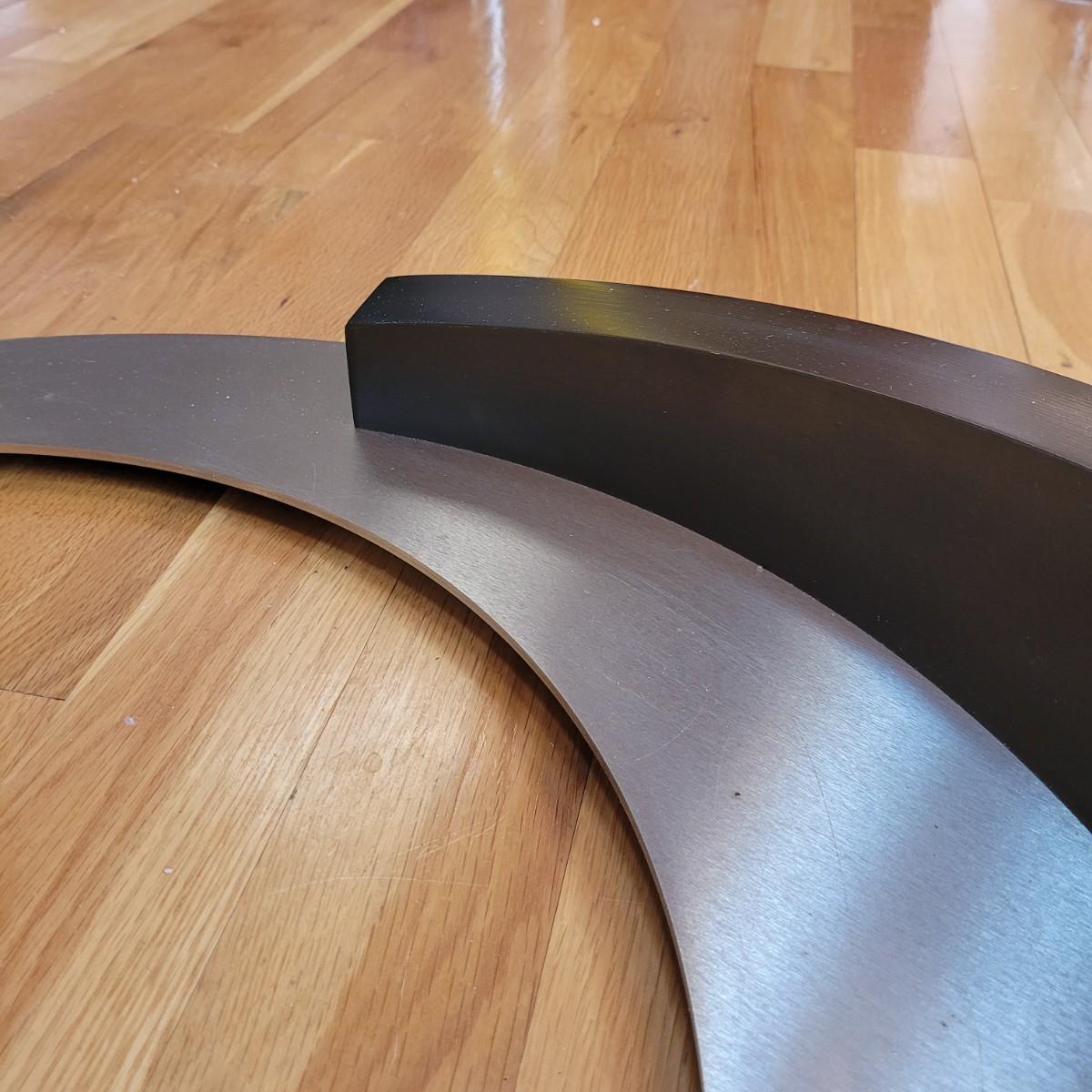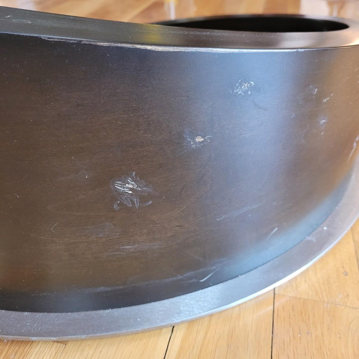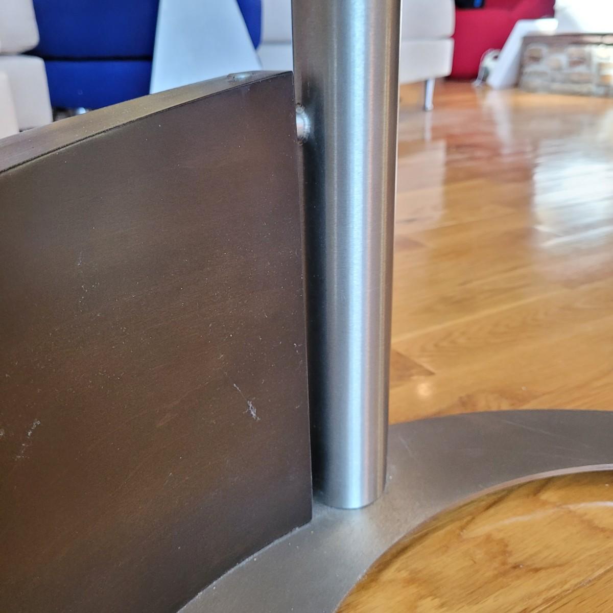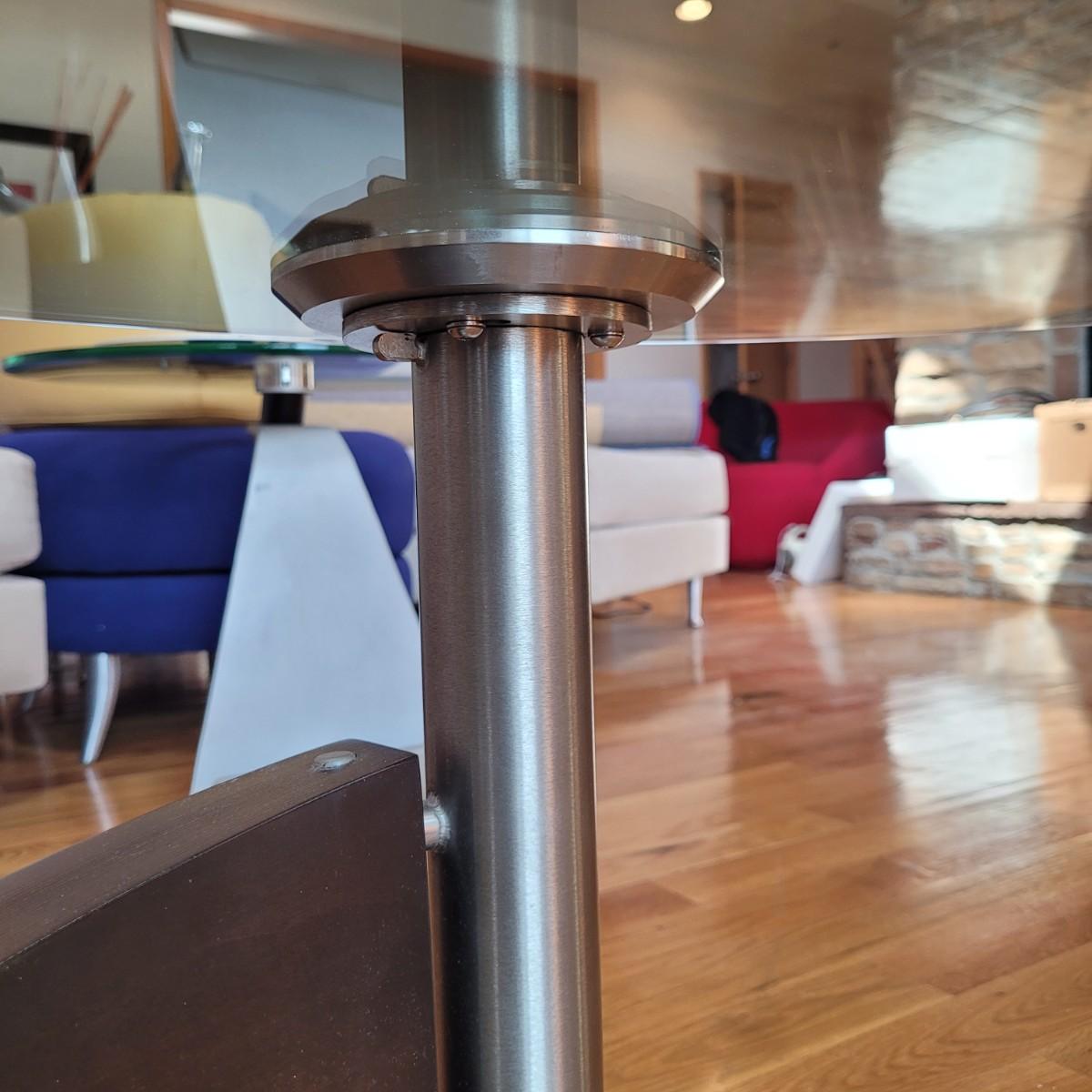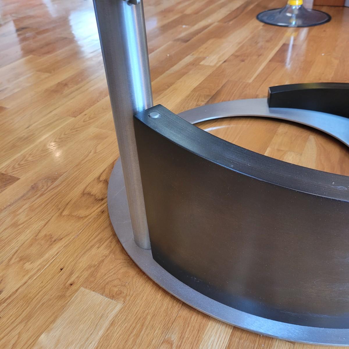 Large glass top coffee table with swivel top has a wide metal base with sloping rounded wooden accent piece. Some light scratches throughput (see photos). Measures approximately 36"D x 17.5"H. Local pickup only. Winning bidder must bring assistance to help move and load this item due to its weight and size.