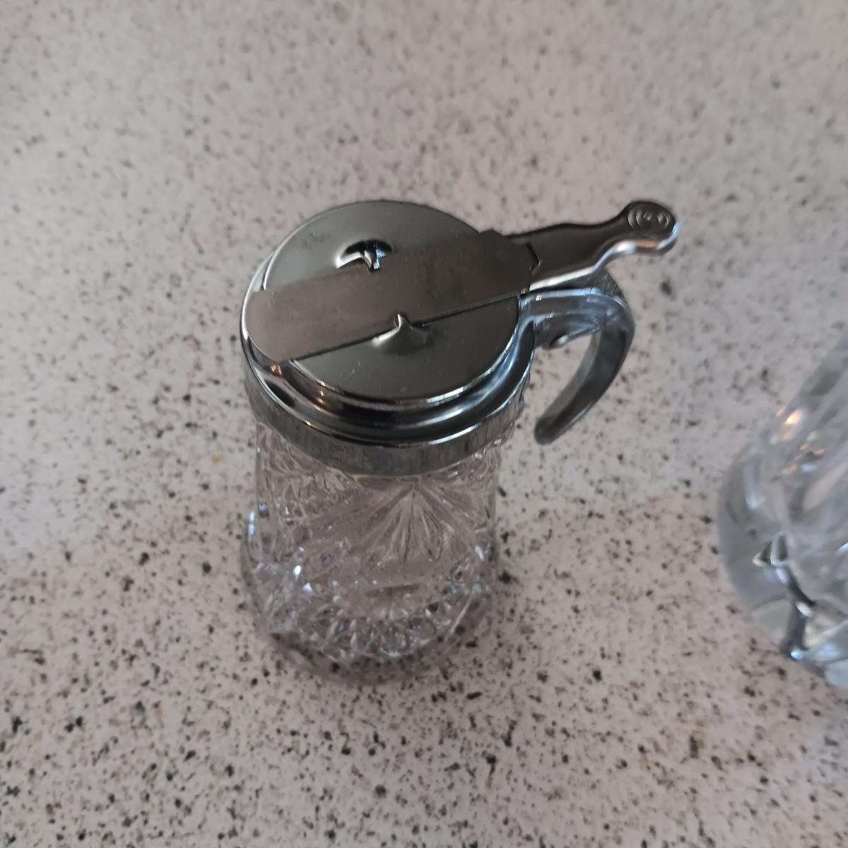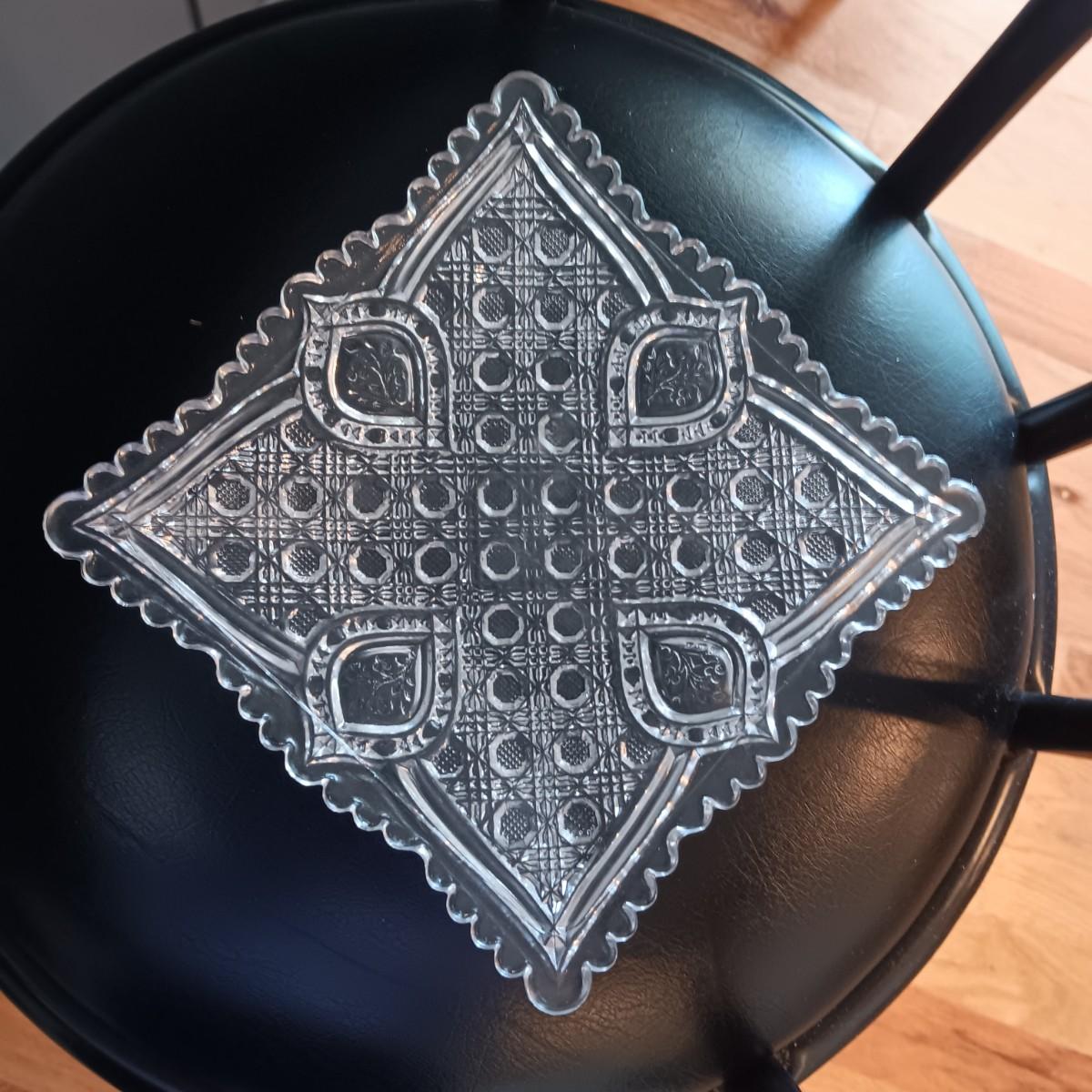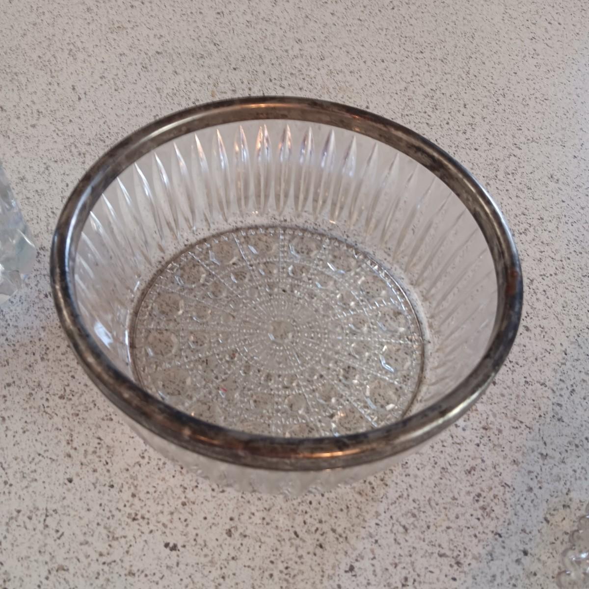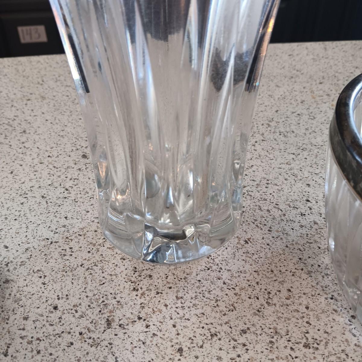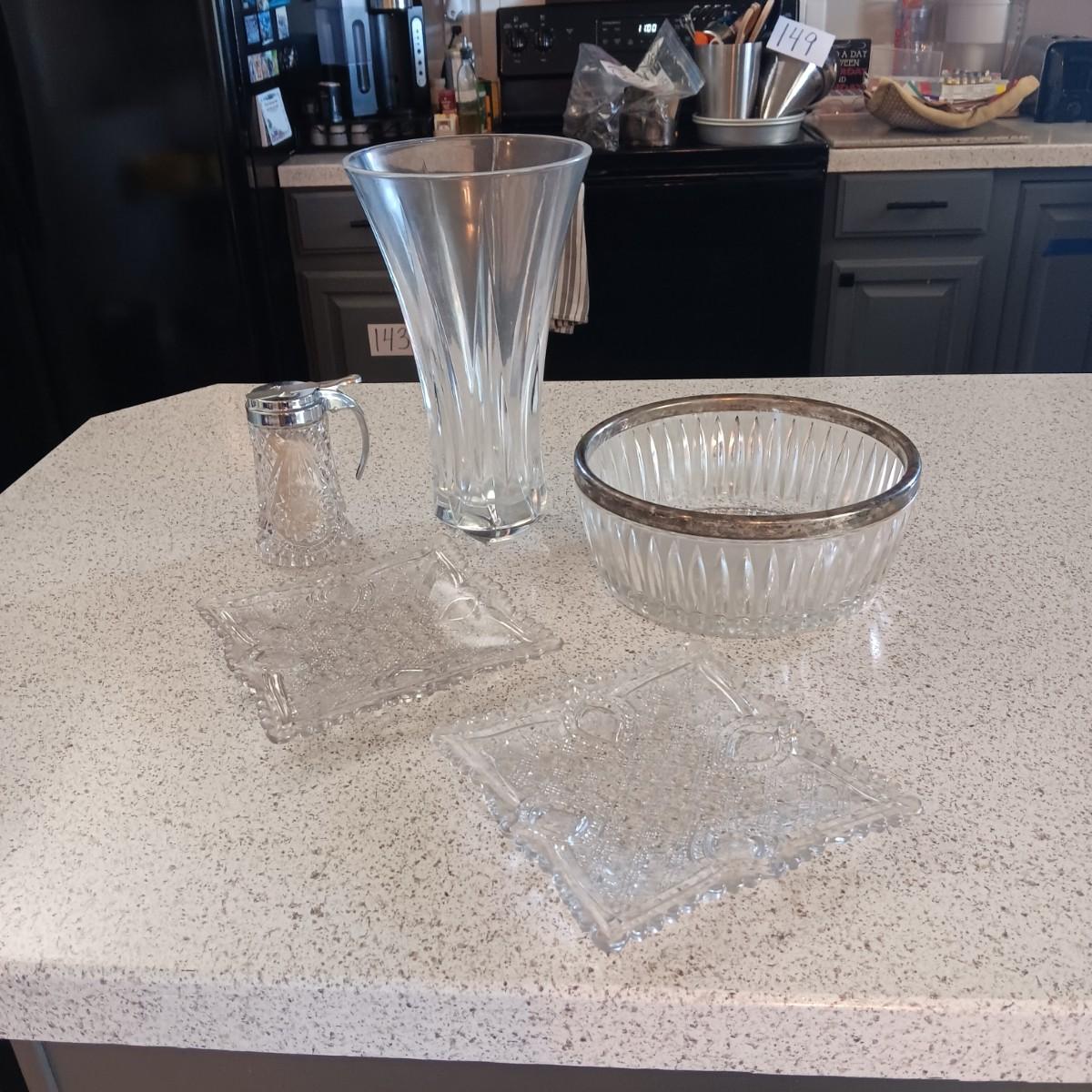 LARGE GLASS VASE, SERVING BOWL, SUGAR CONTAINER AND 2 OLD CUT GLASS PLATES