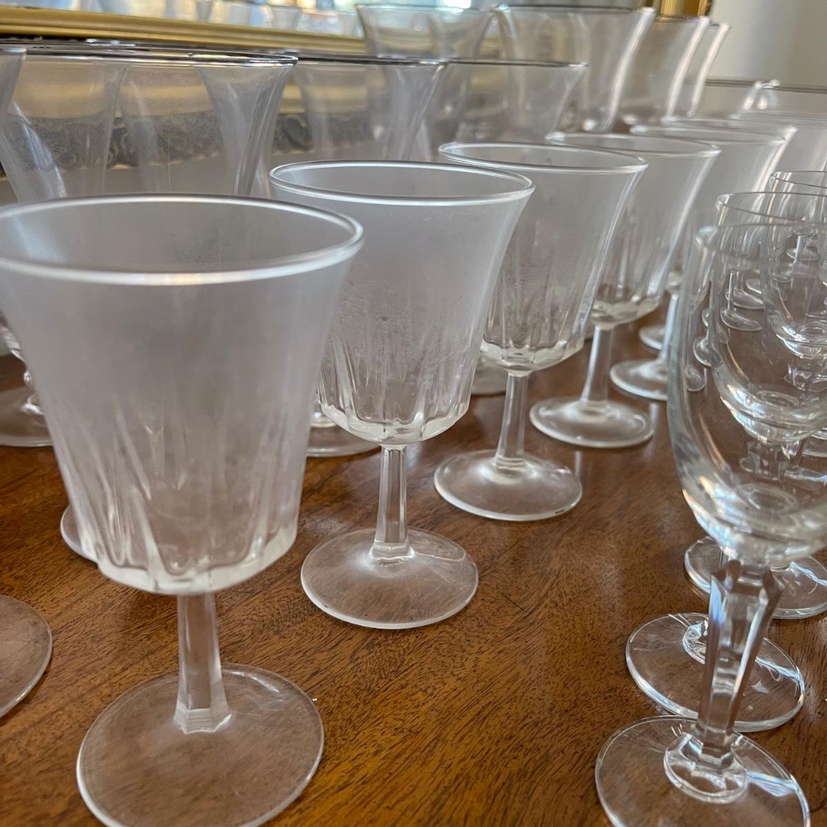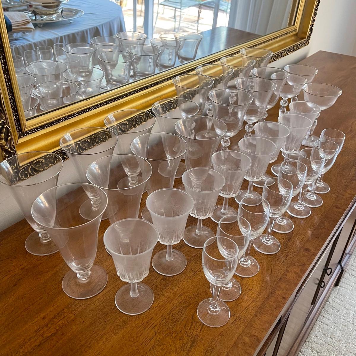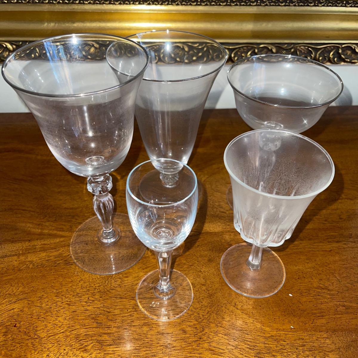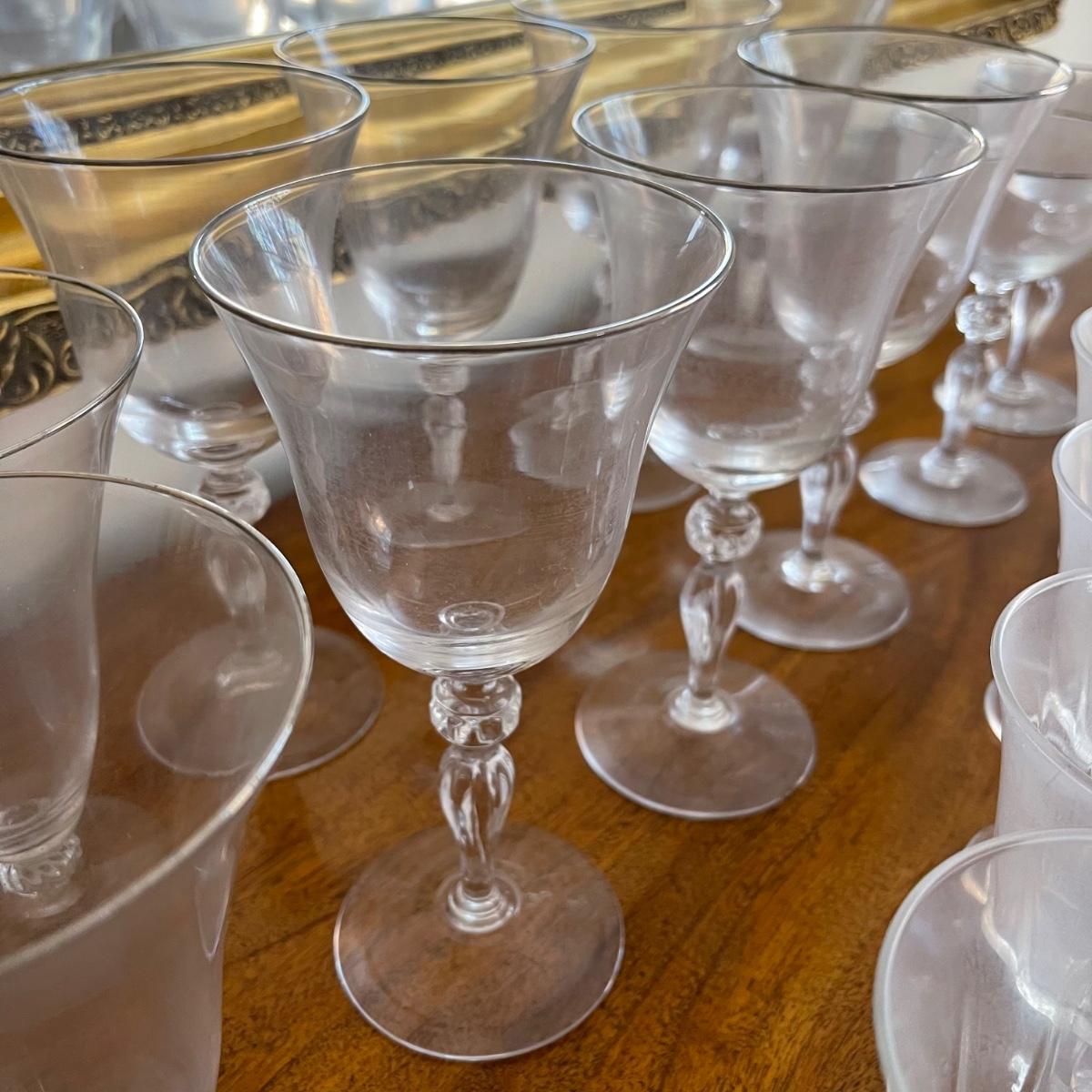 This large collection of glassware includes eight cups, seven wine glasses, three coupe glasses, eight sour glasses, and eight aperitif