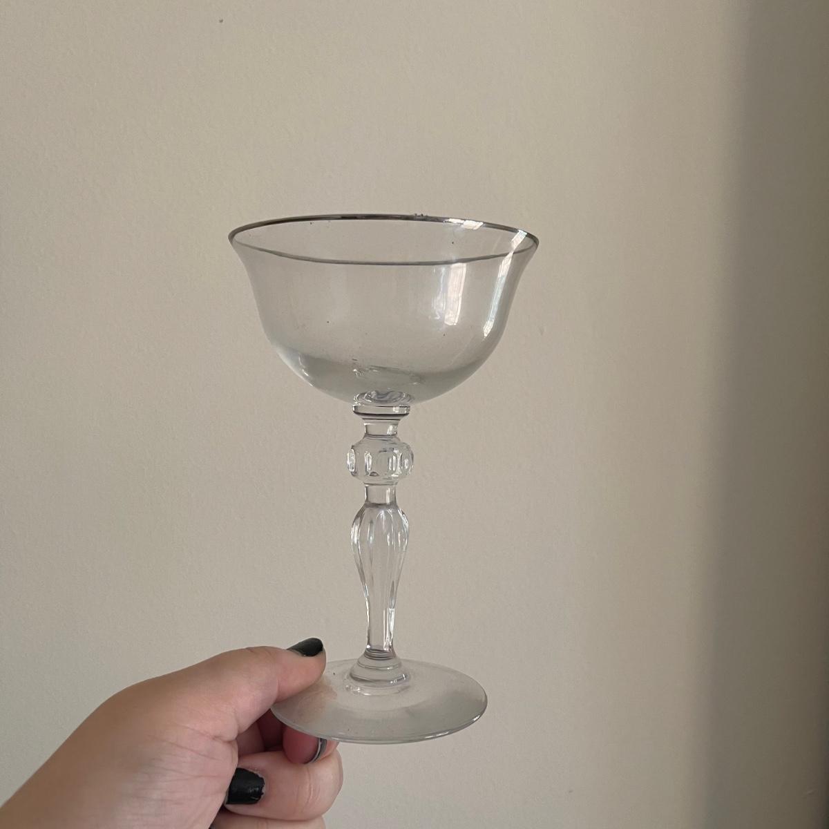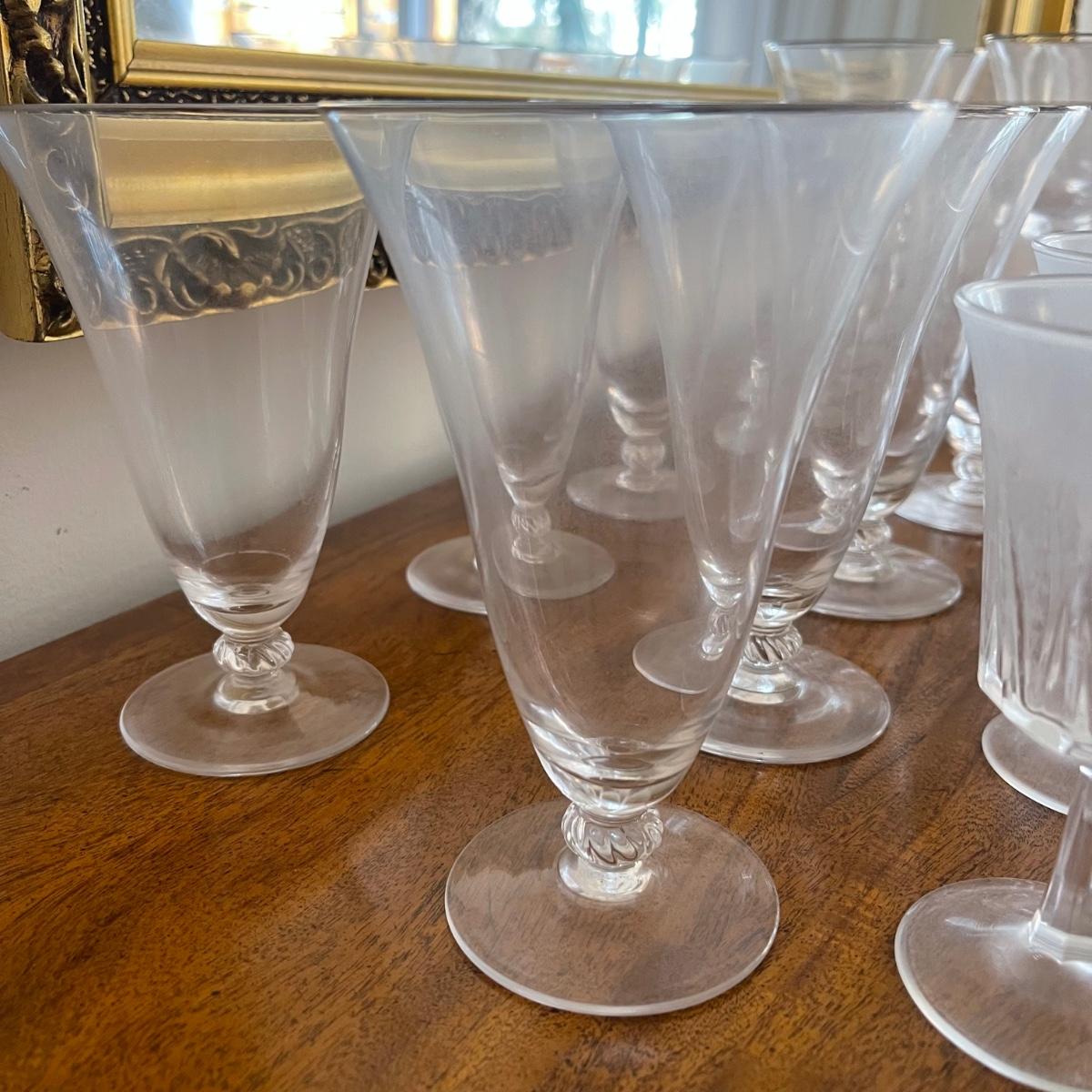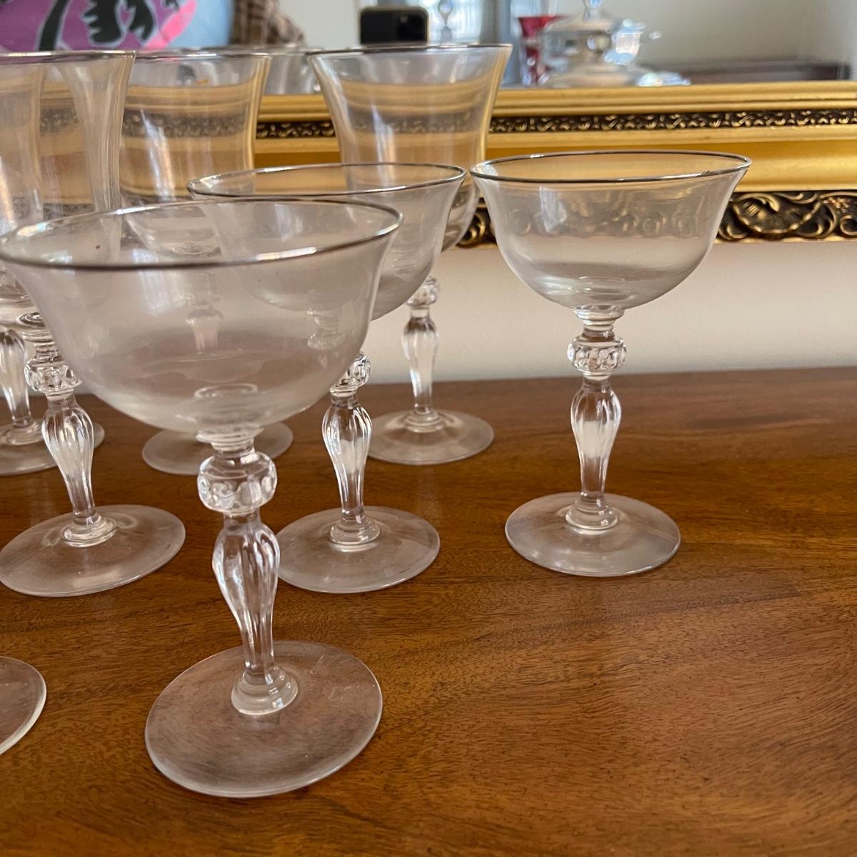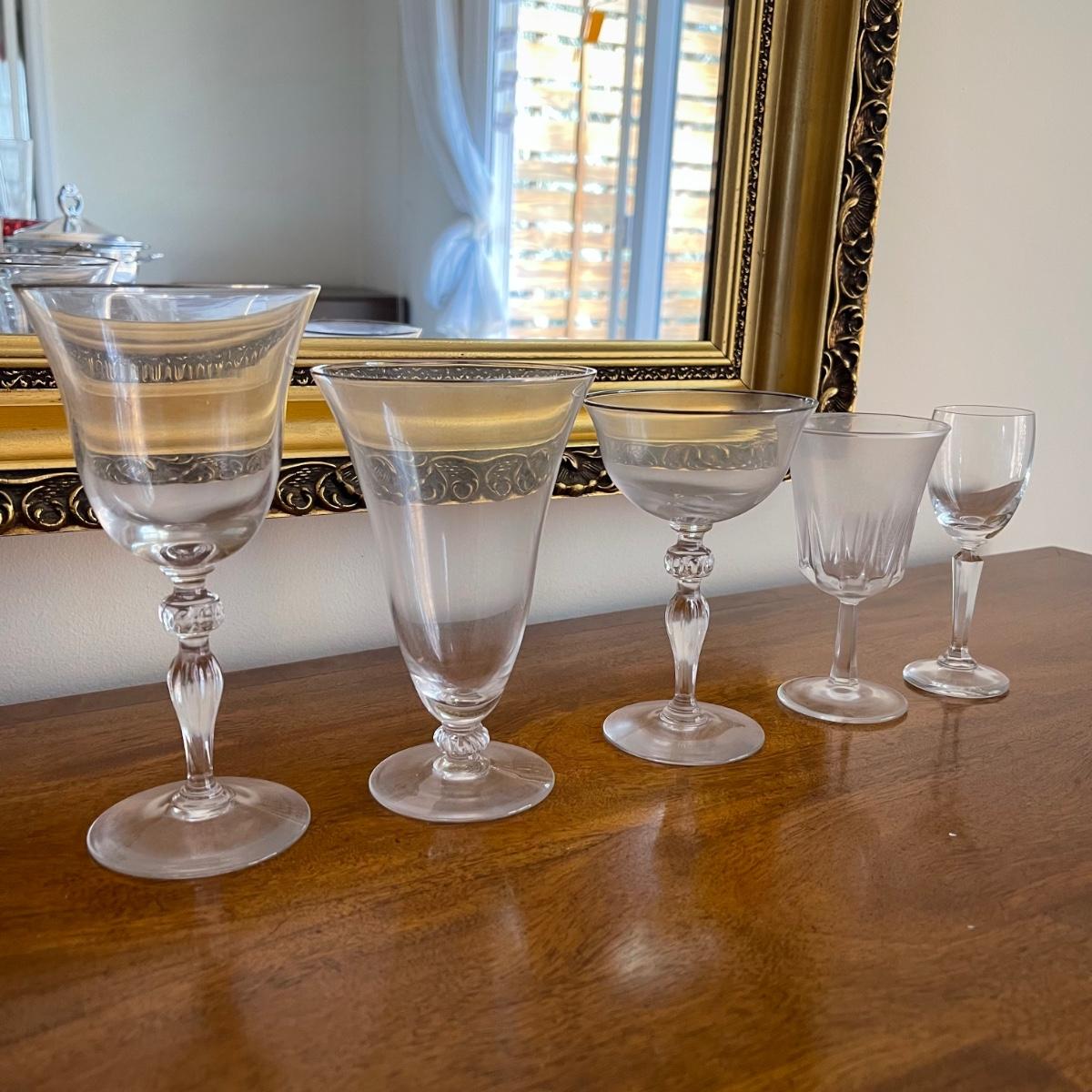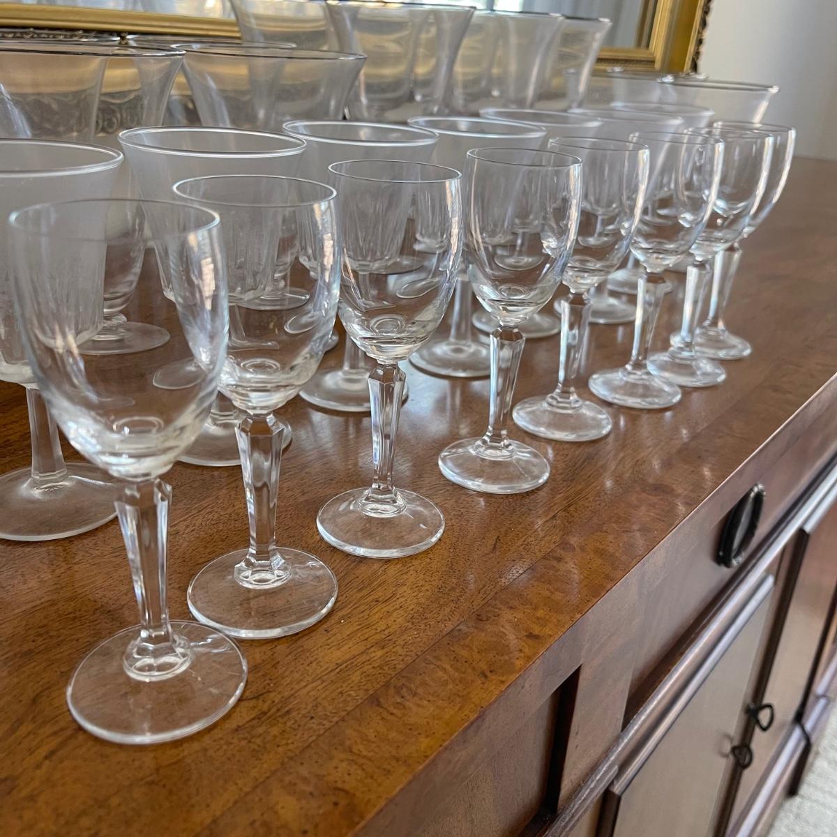 This large collection of glassware includes eight cups, seven wine glasses, three coupe glasses, eight sour glasses, and eight aperitif