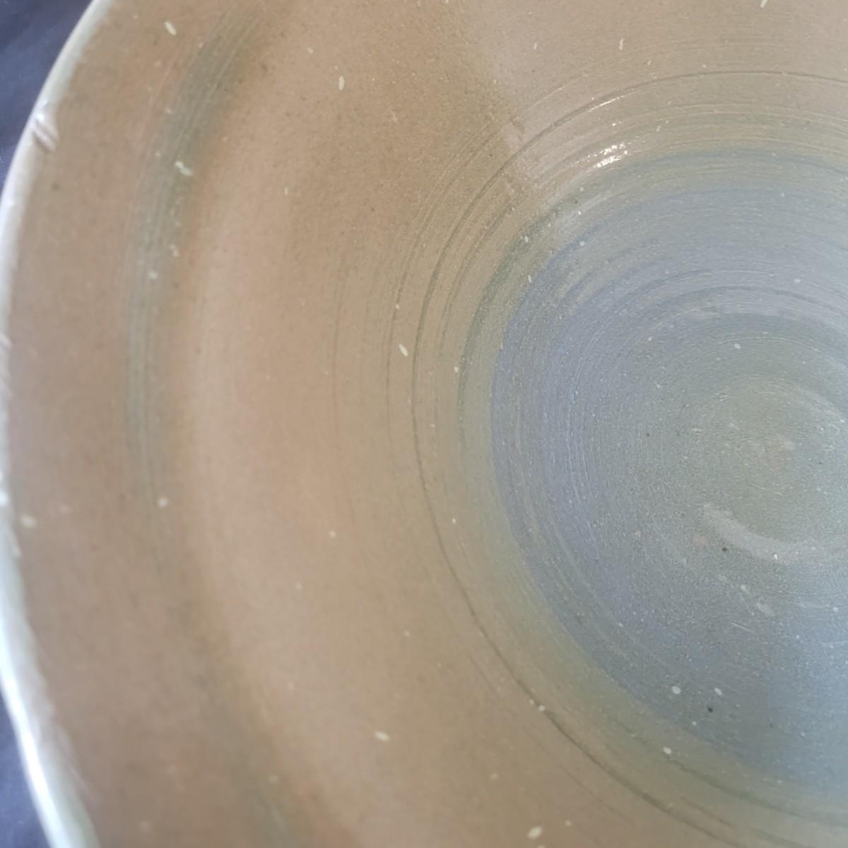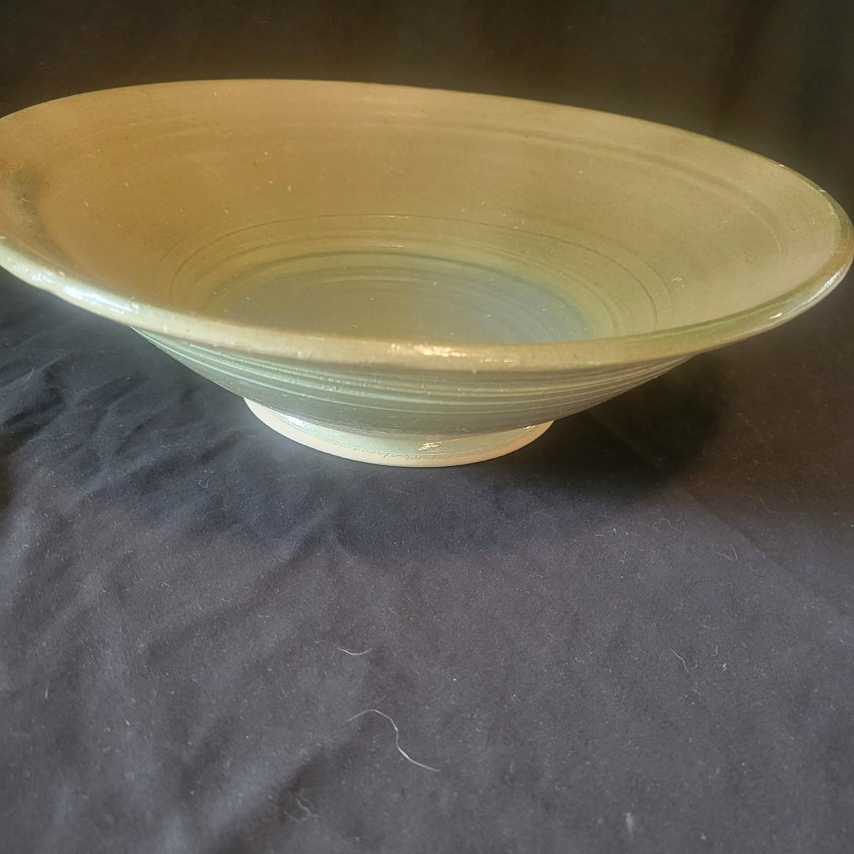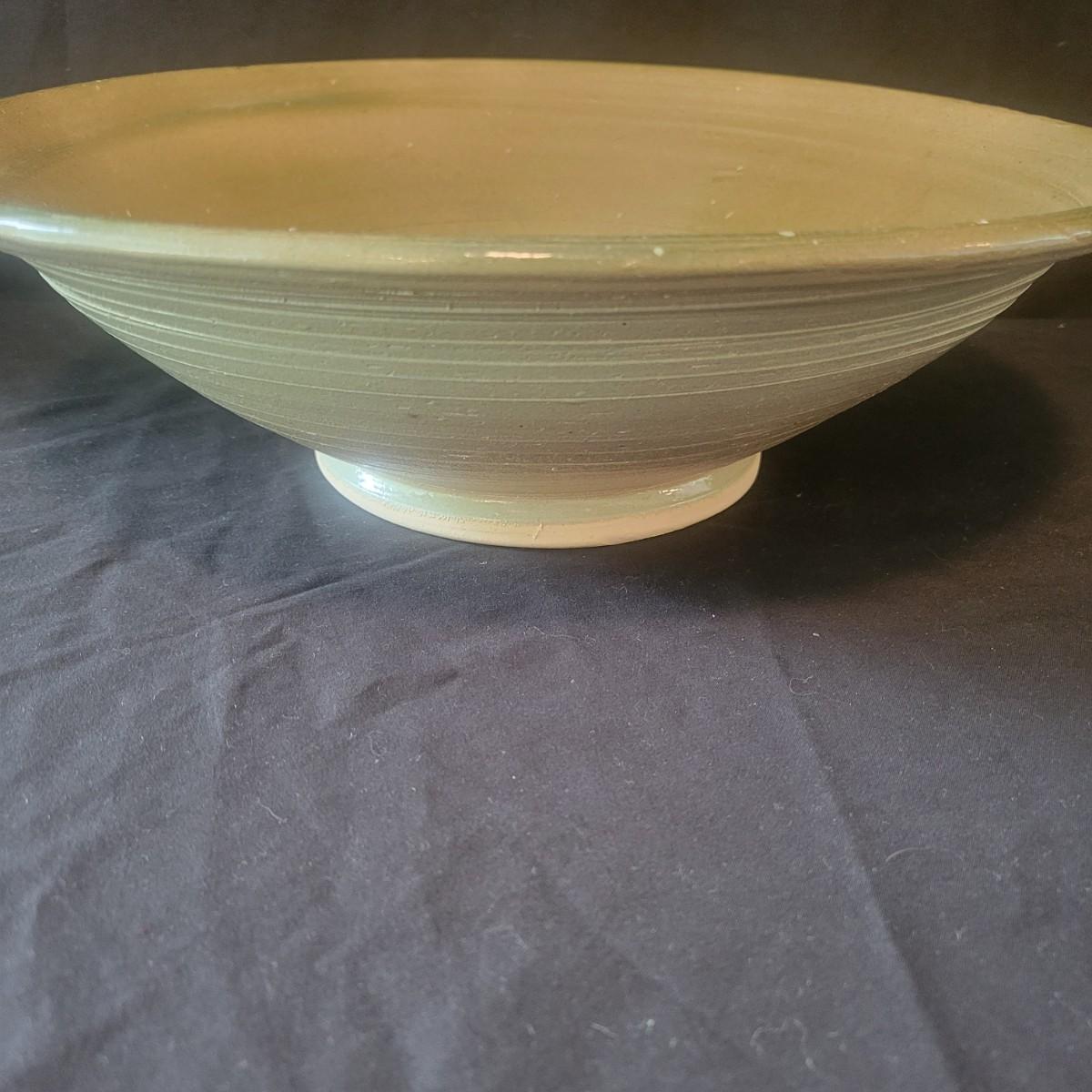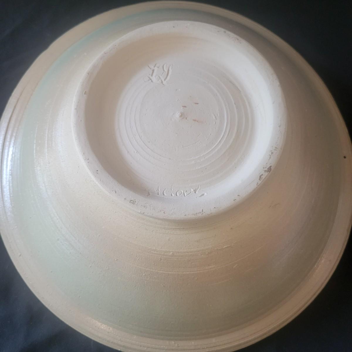 Large bowl of custom pottery with a subtle glaze of light green with blue accents. Bowl is in excellent condition with no damage and is a signed piece. Measures approximately 14.5" x 4" Shipping available