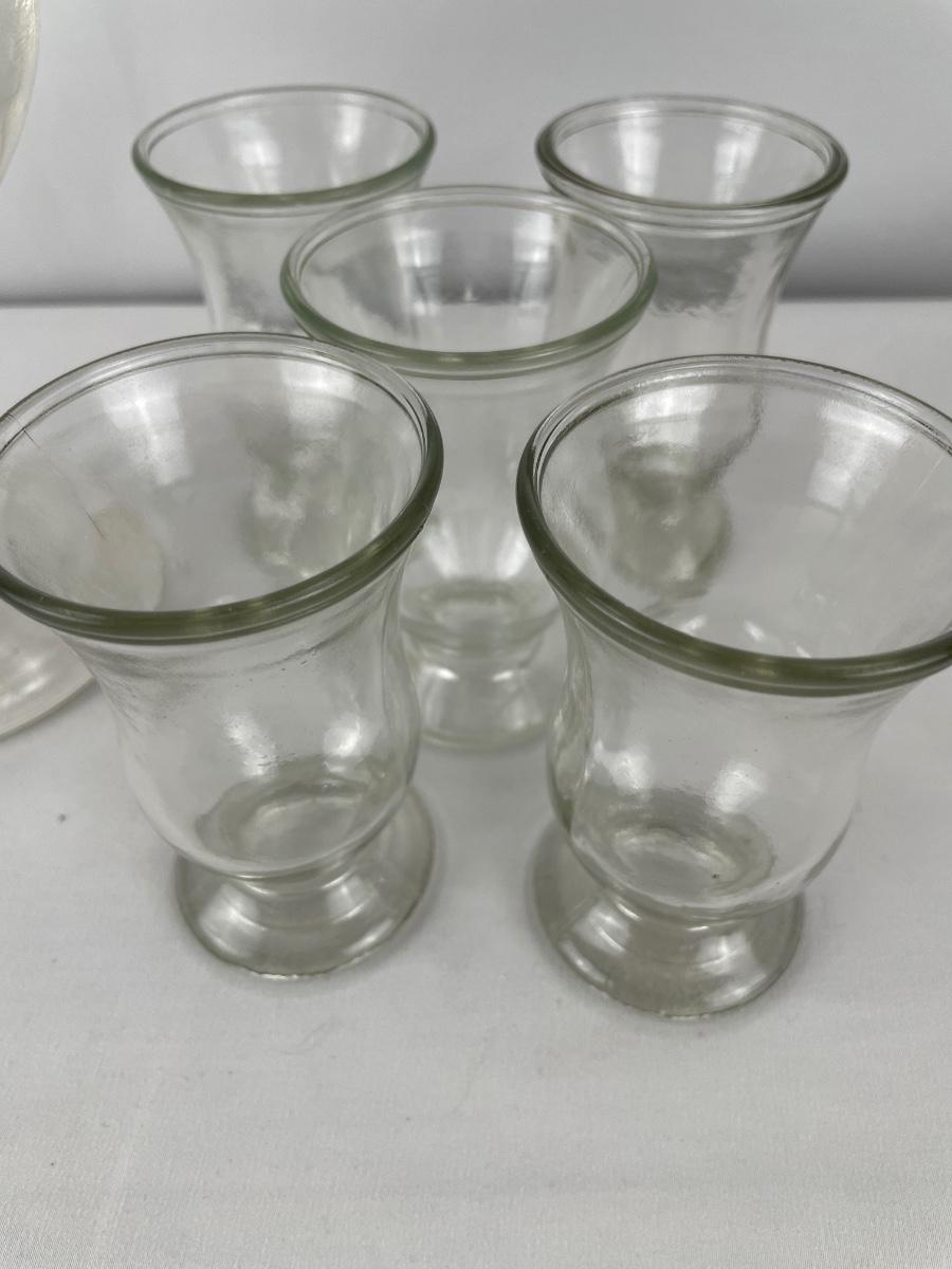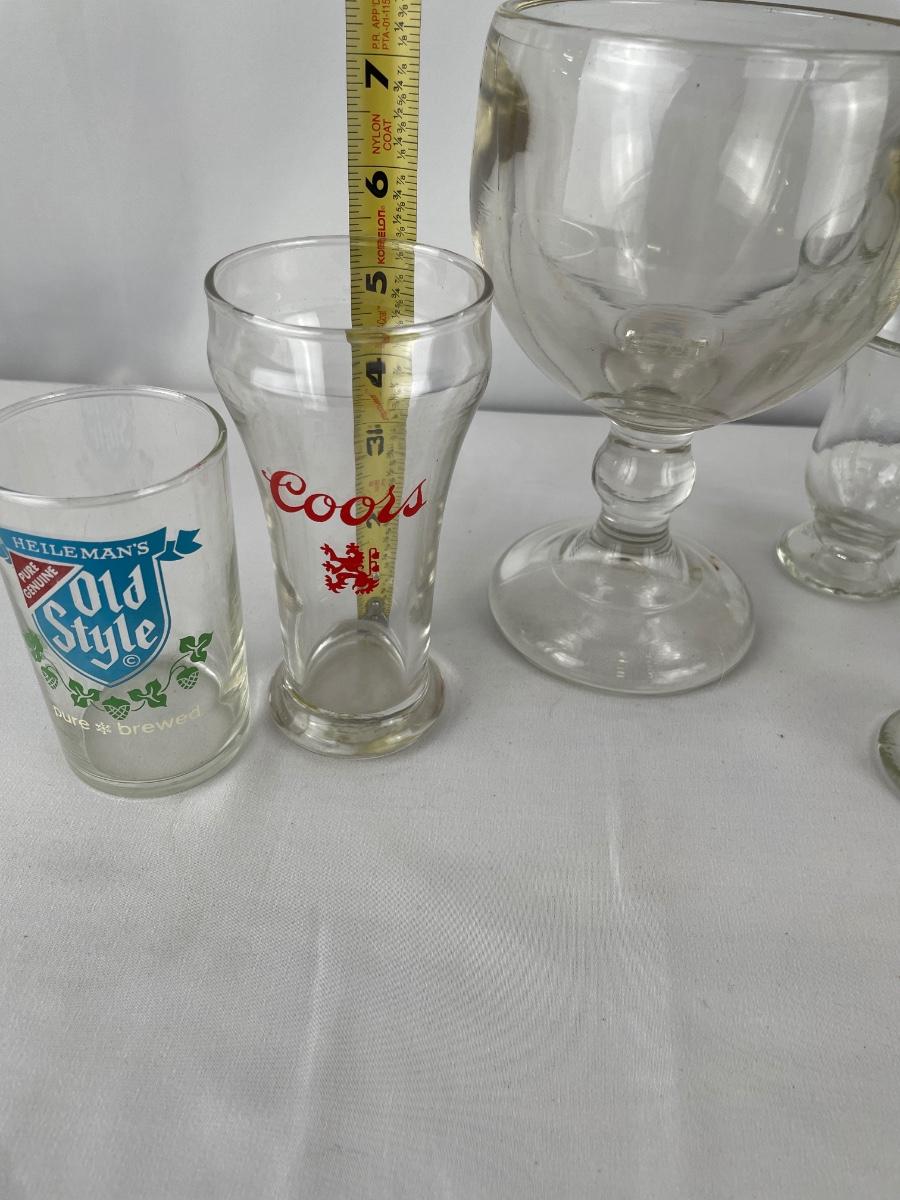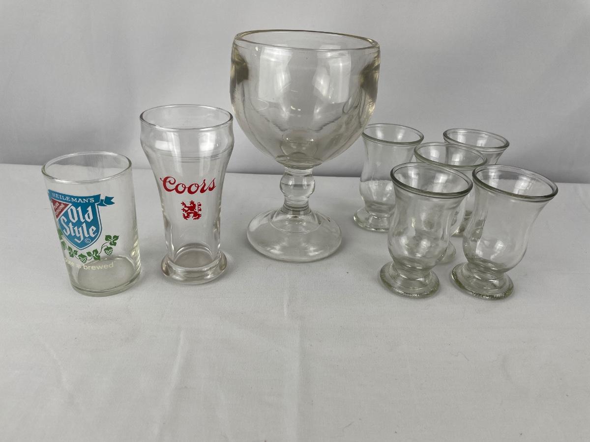 Large goblet, 5 small clear glasses with 2 vintage beer glasses