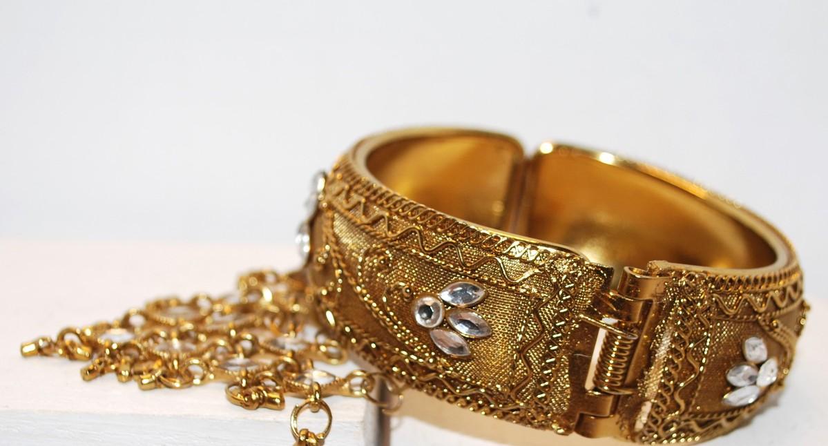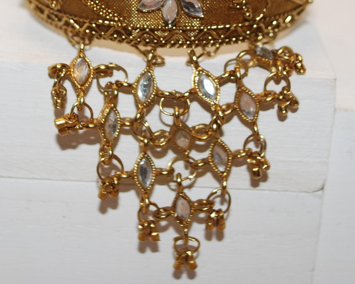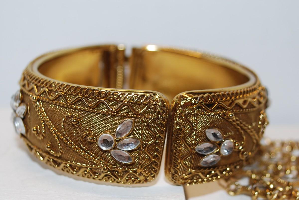 Large Gold Cuff Bracelet with Clear Stones Band & Dangles 2½" circ.