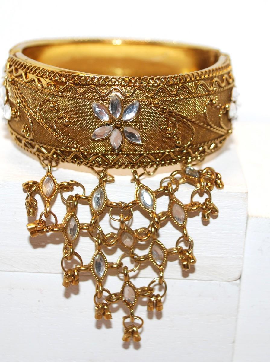Victorian Styled Large Gold Cuff Bracelet with Clear Stones Band & Dangles 2½" circ.