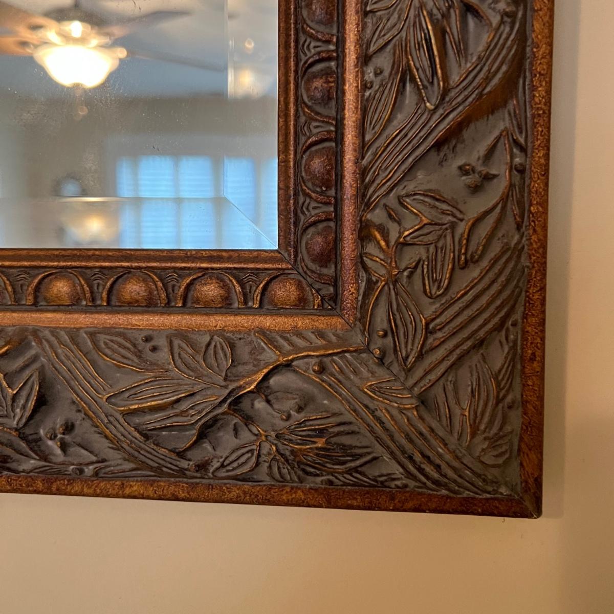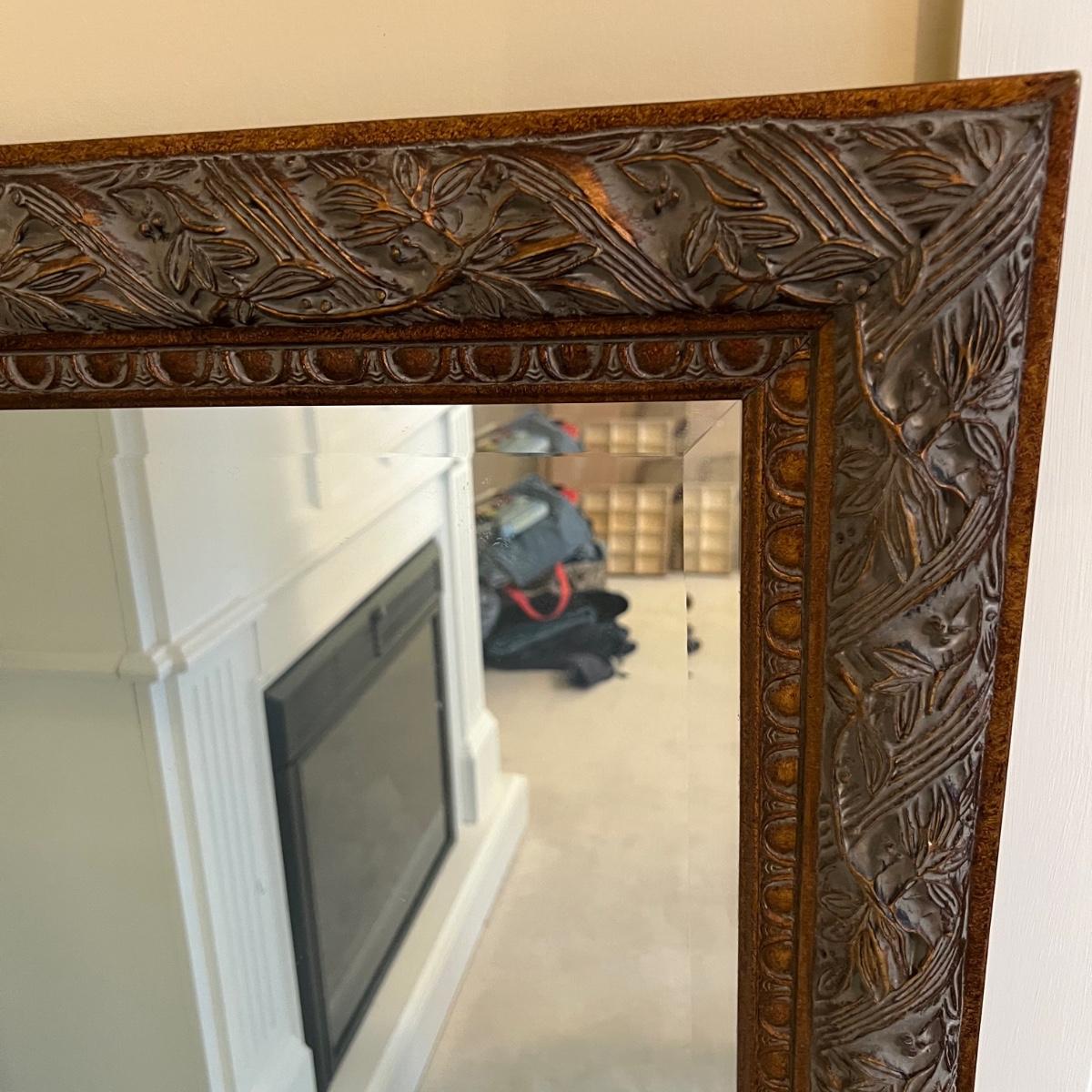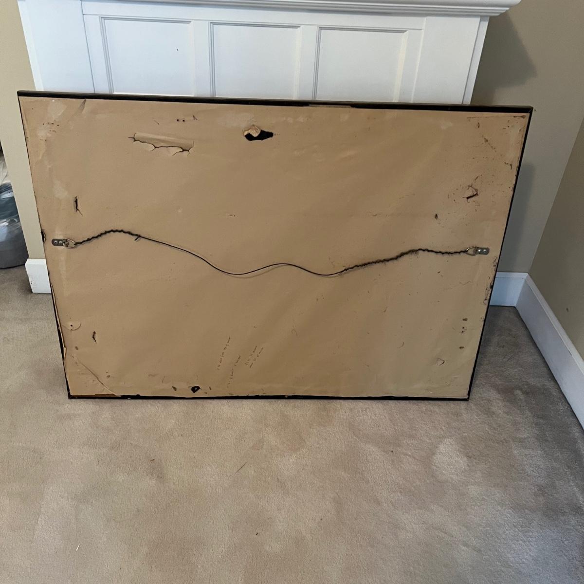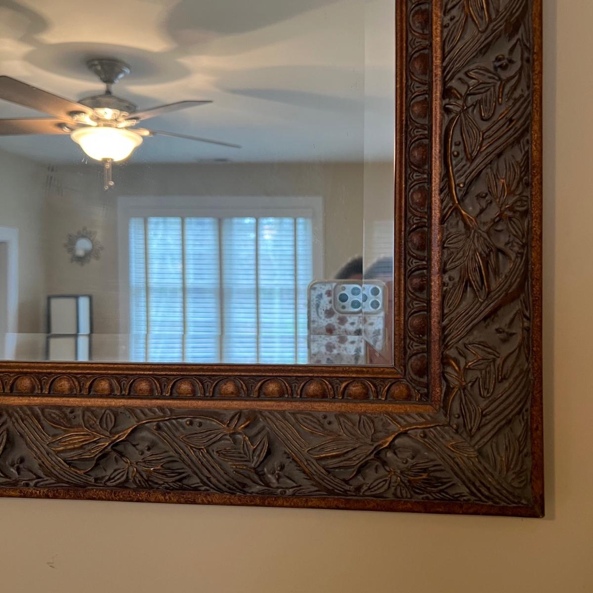 Large gold framed mirror. No apparent manufacture or markings. Frame is constructed of wood with an antique gold finish. Measures 43”D x 31”H x 1”W. Local pickup only.