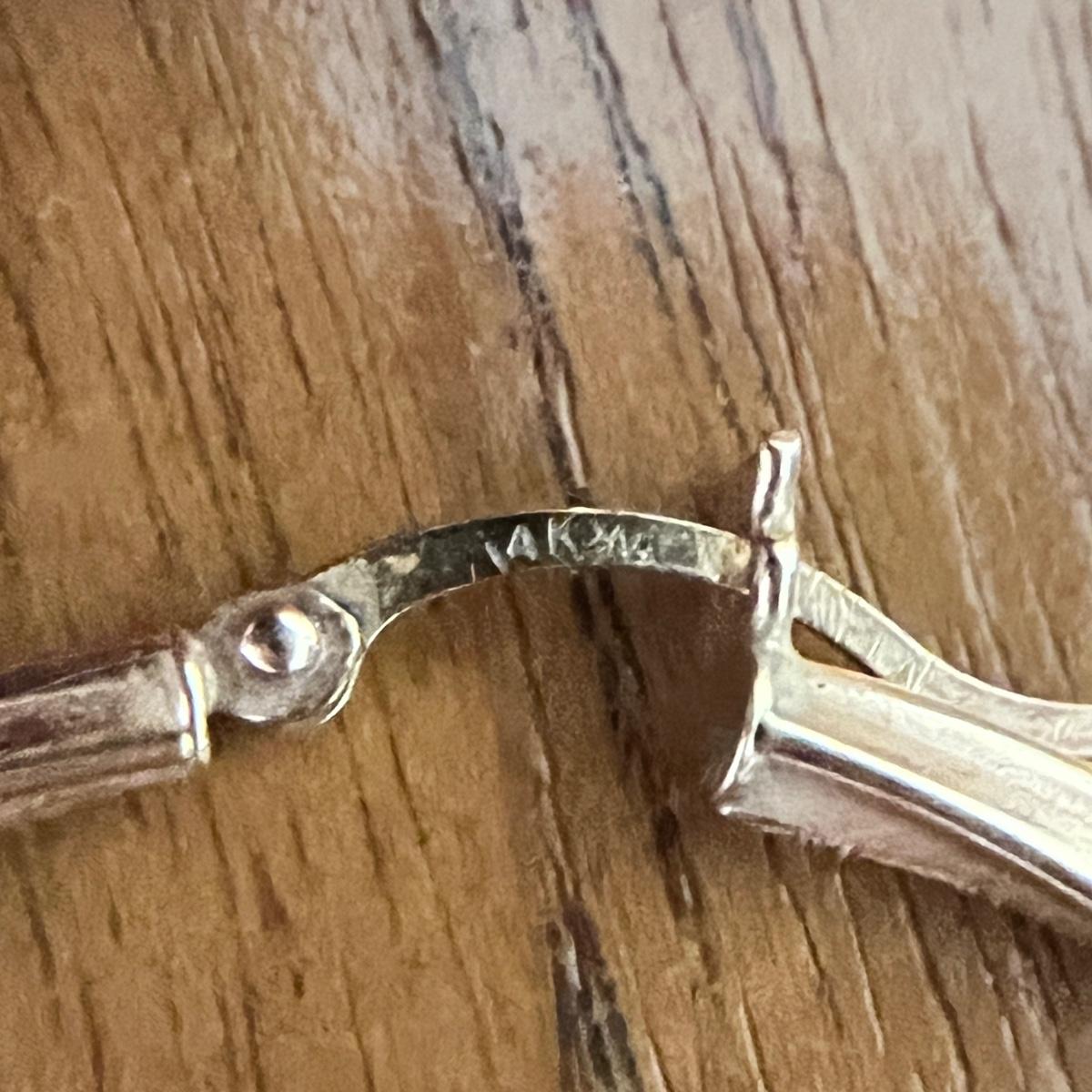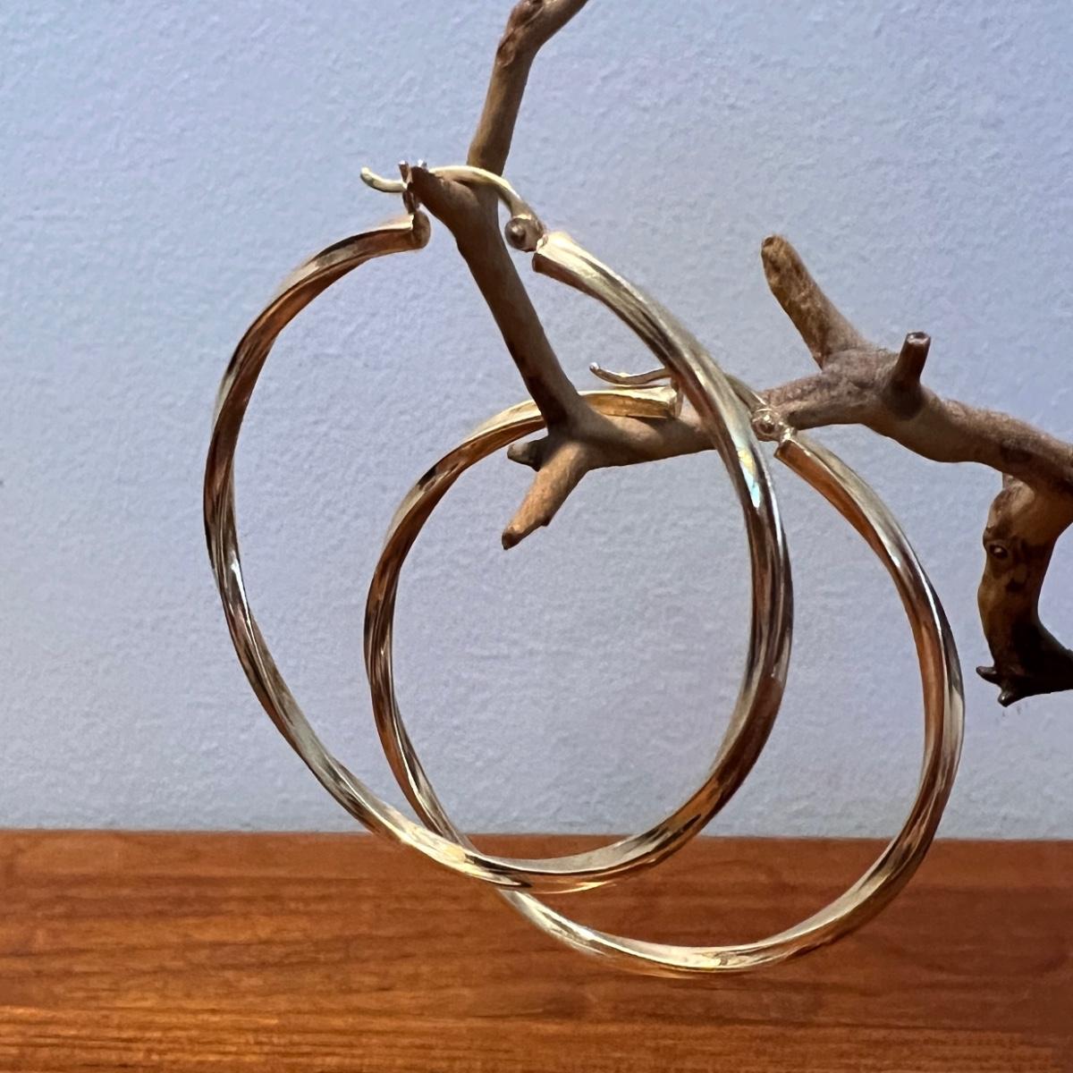 Twisted gold hoop earrings marked 14K and hallmarked with an N with an arrow through it. Weighs 4.77 grams. See all pics for details.
