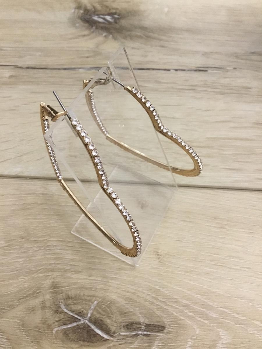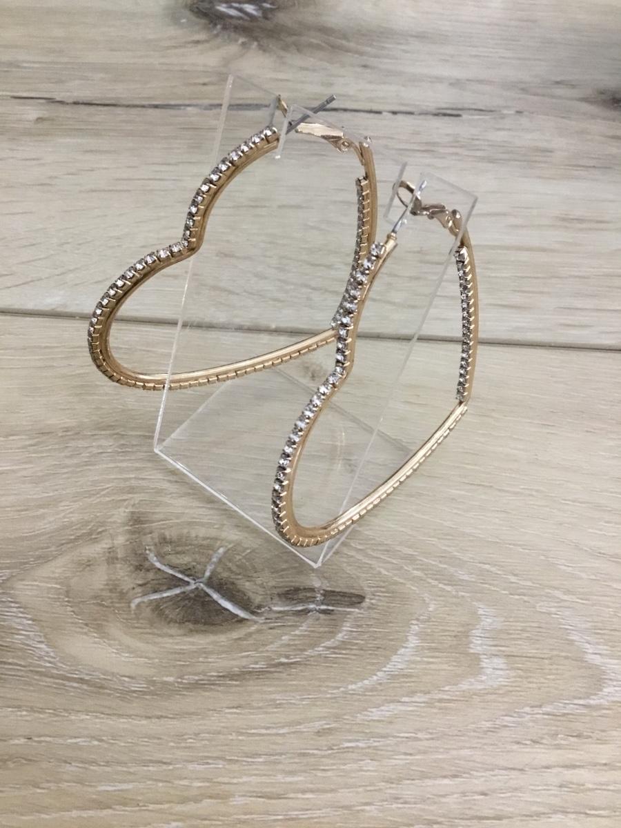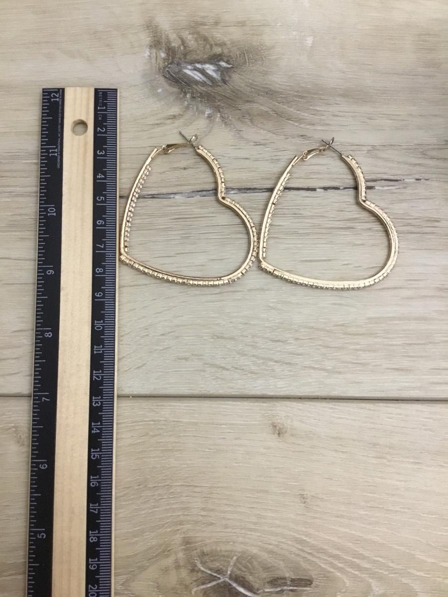Large gold tone clear rhinestone heart, hoop, statement, earrings
