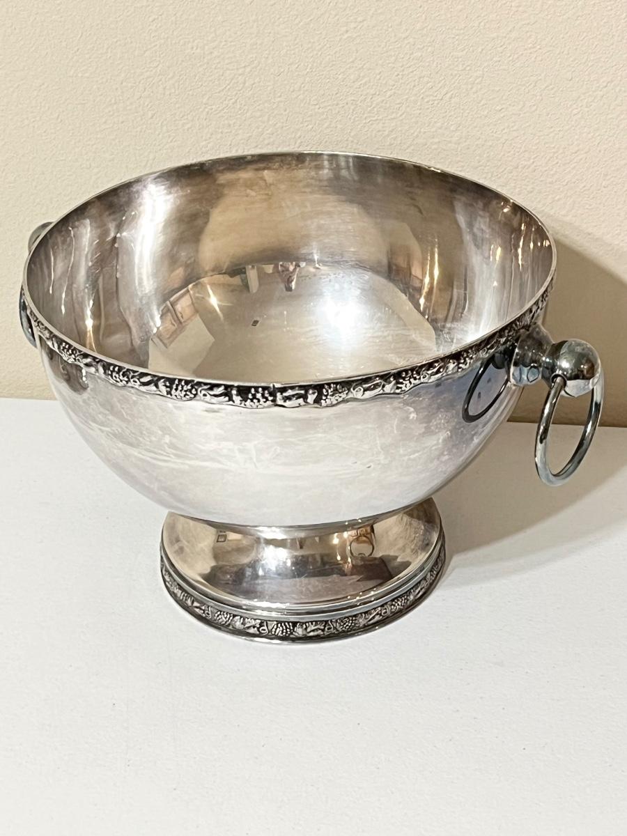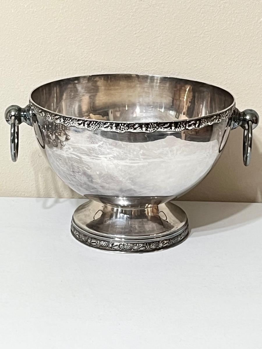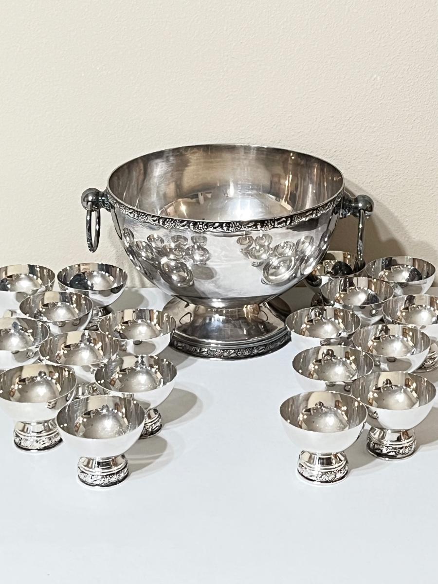 Silver metal ~ (1) 9” H x 12” Round Punch bowl ~ (18) 3” H x 3 3/4” Round Cups ~ Bowl needs polishing ~ No Ladle