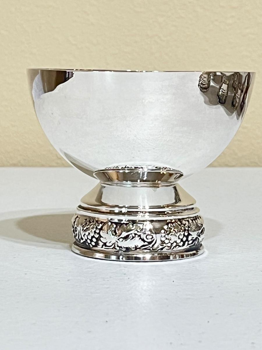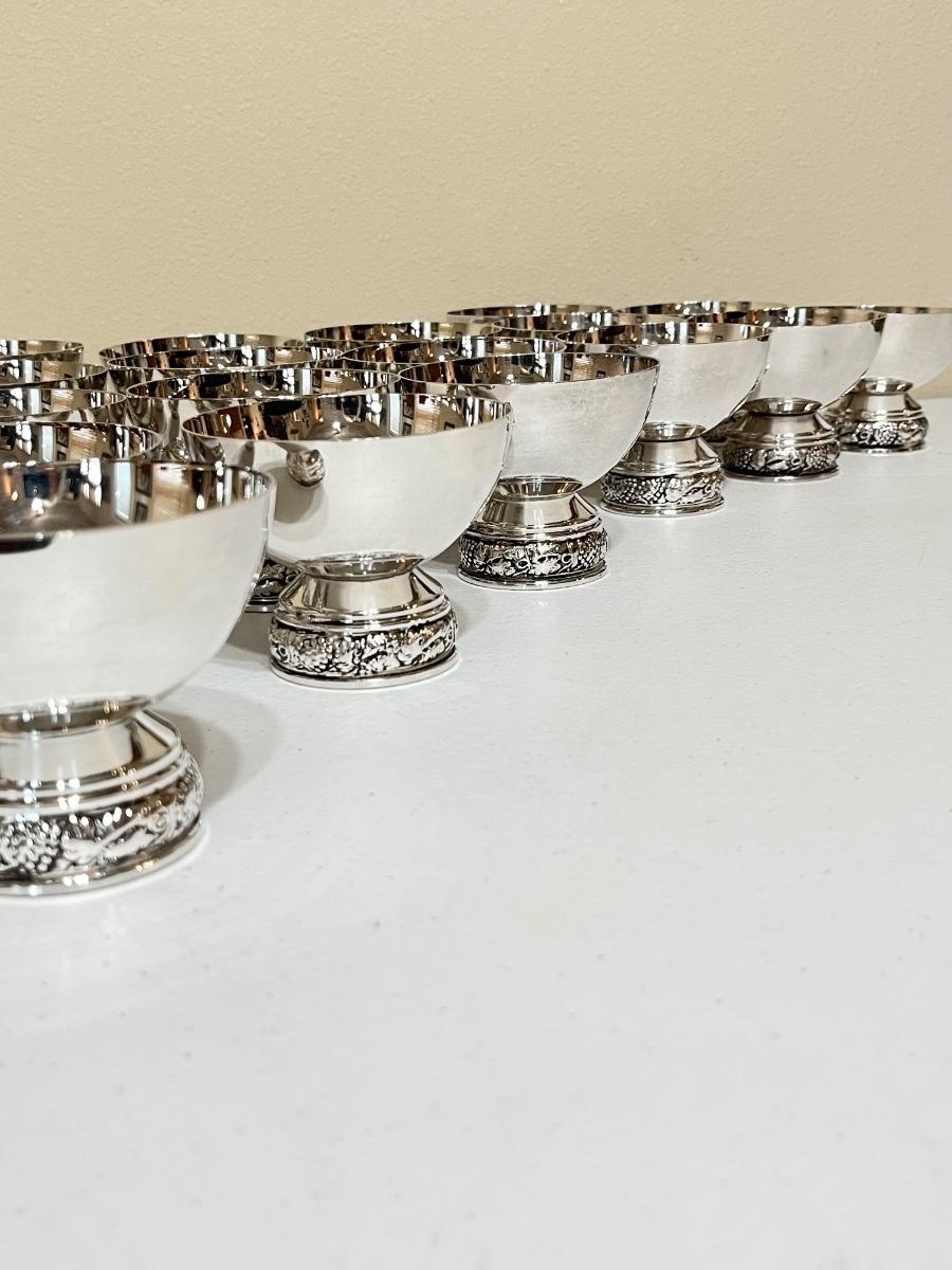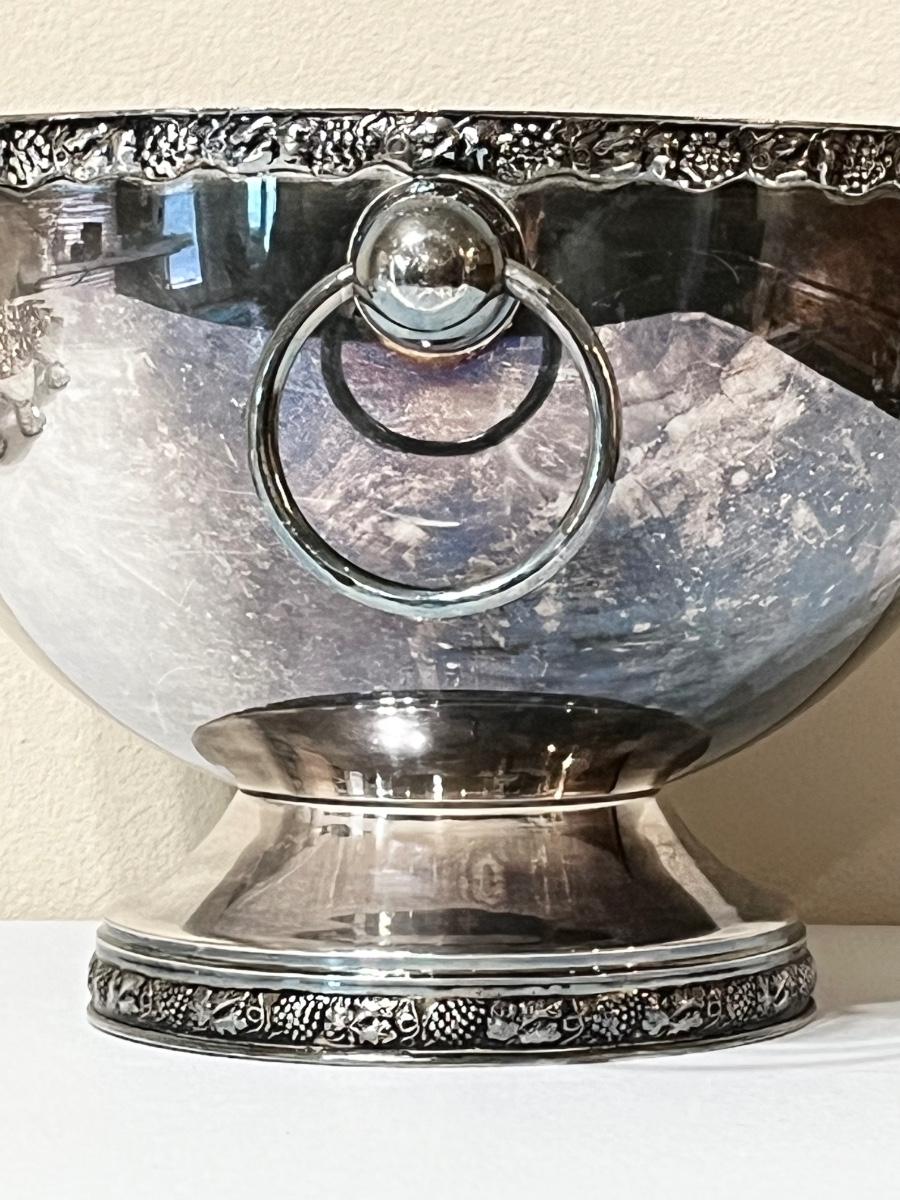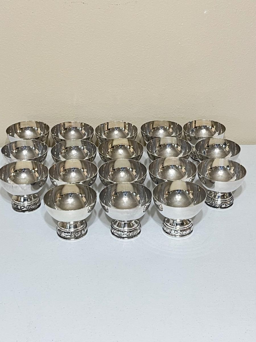 Silver metal ~ (1) 9” H x 12” Round Punch bowl ~ (18) 3” H x 3 3/4” Round Cups ~ Bowl needs polishing ~ No Ladle