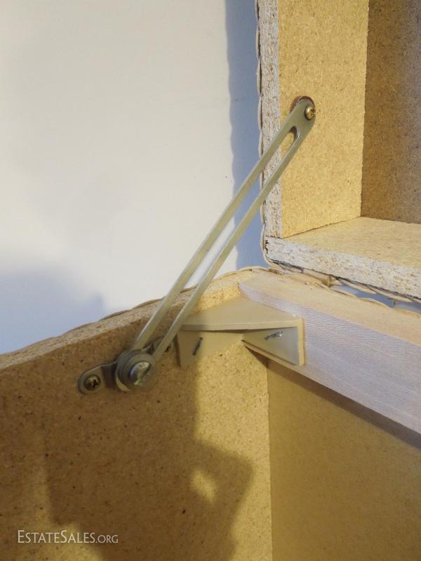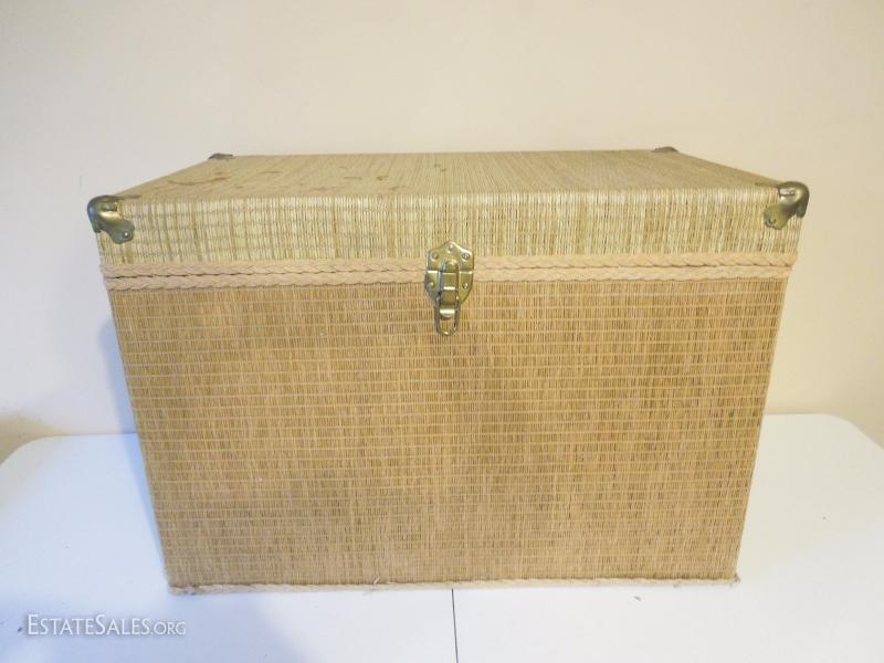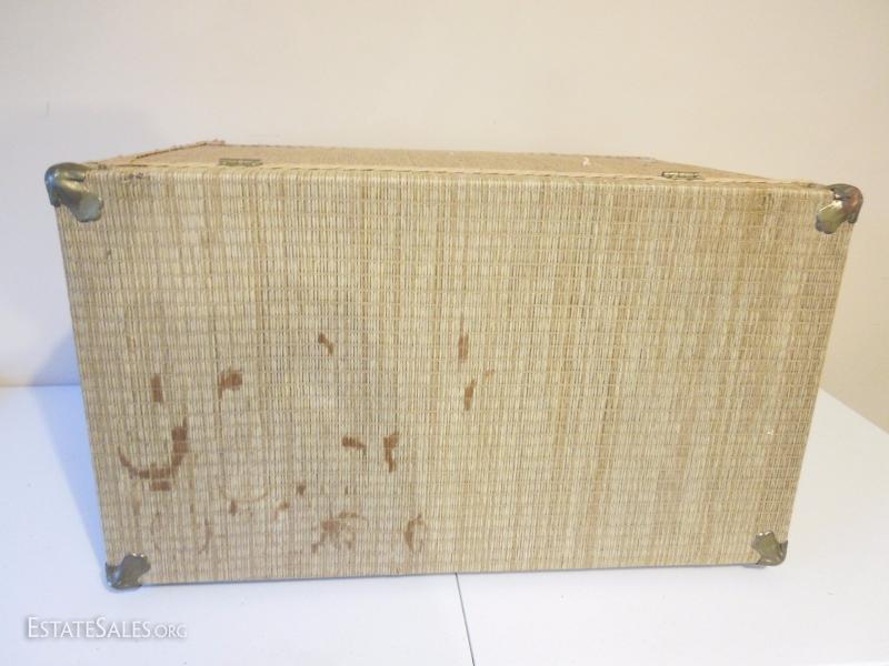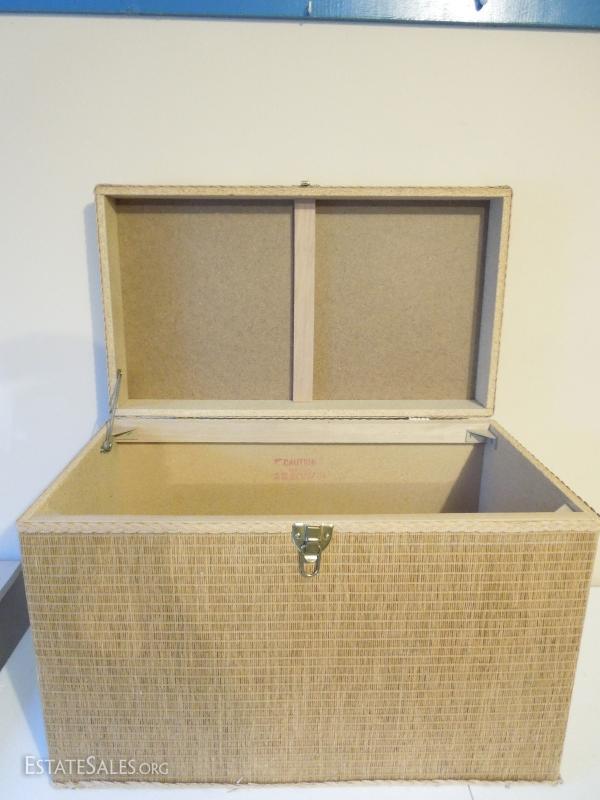 Hinged top will remain open. Brass hardware. Composite board interior. Top is stained. 28x19x16