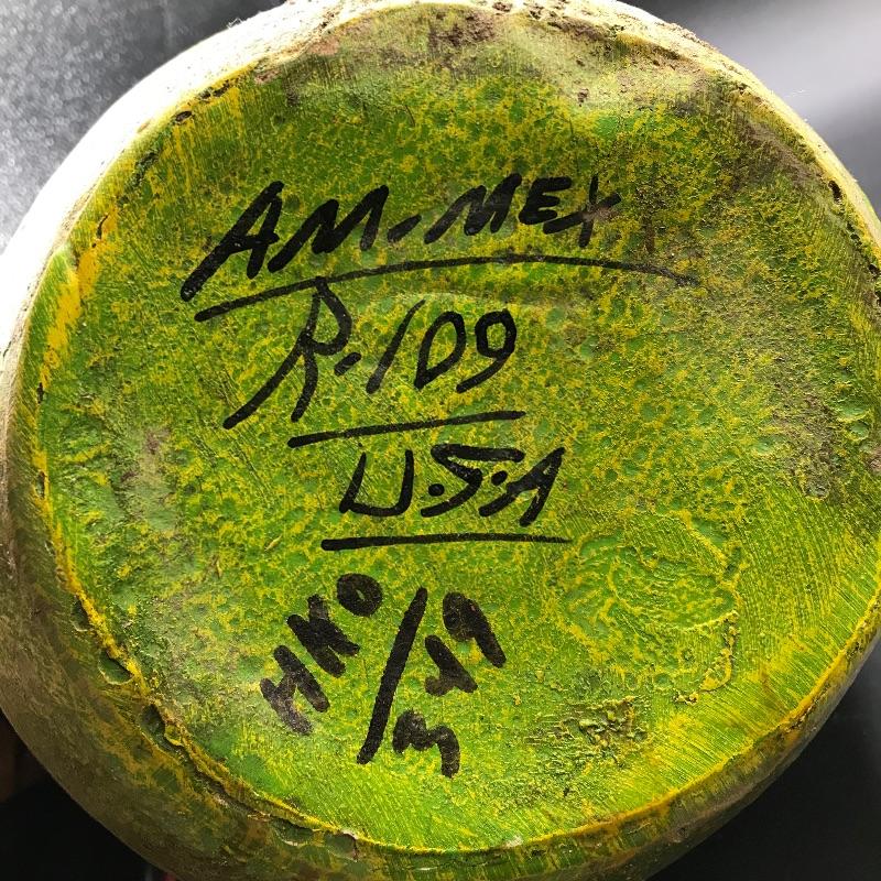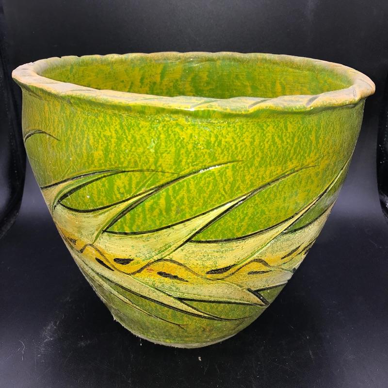 Appears to be made of some type of compressed fiber material. It feels like a papier-mâché consistency in the hand. Pot stands 9.25“ tall.