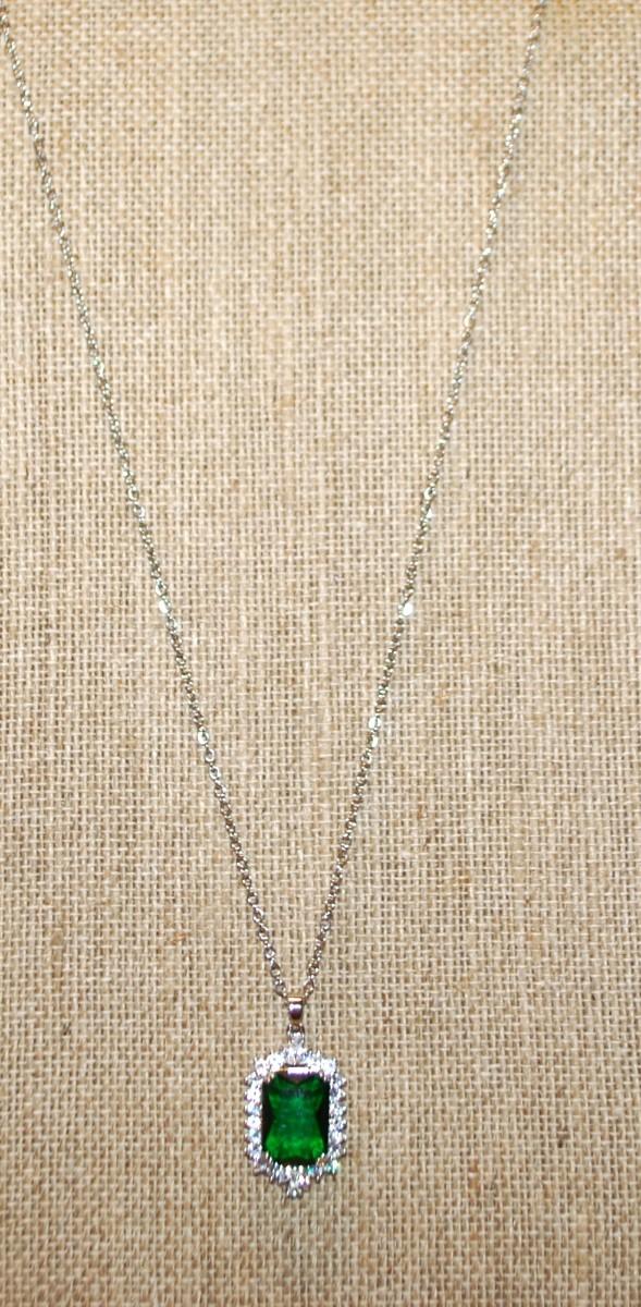 Large Green Rectangle Main Stone PENDANT (1¼" x ¾") with Full Surround on a Silver Tone Necklace Chain 18" L