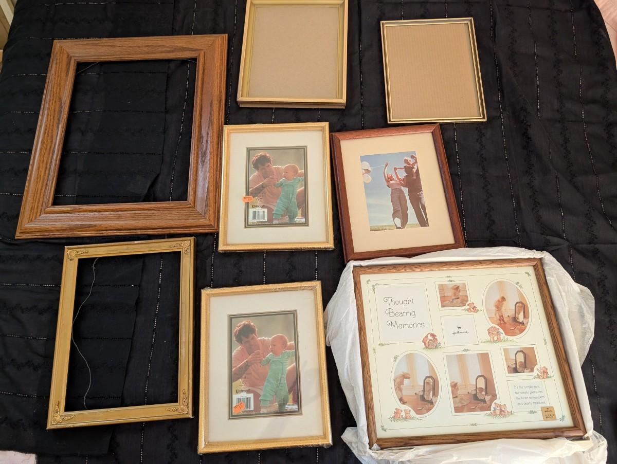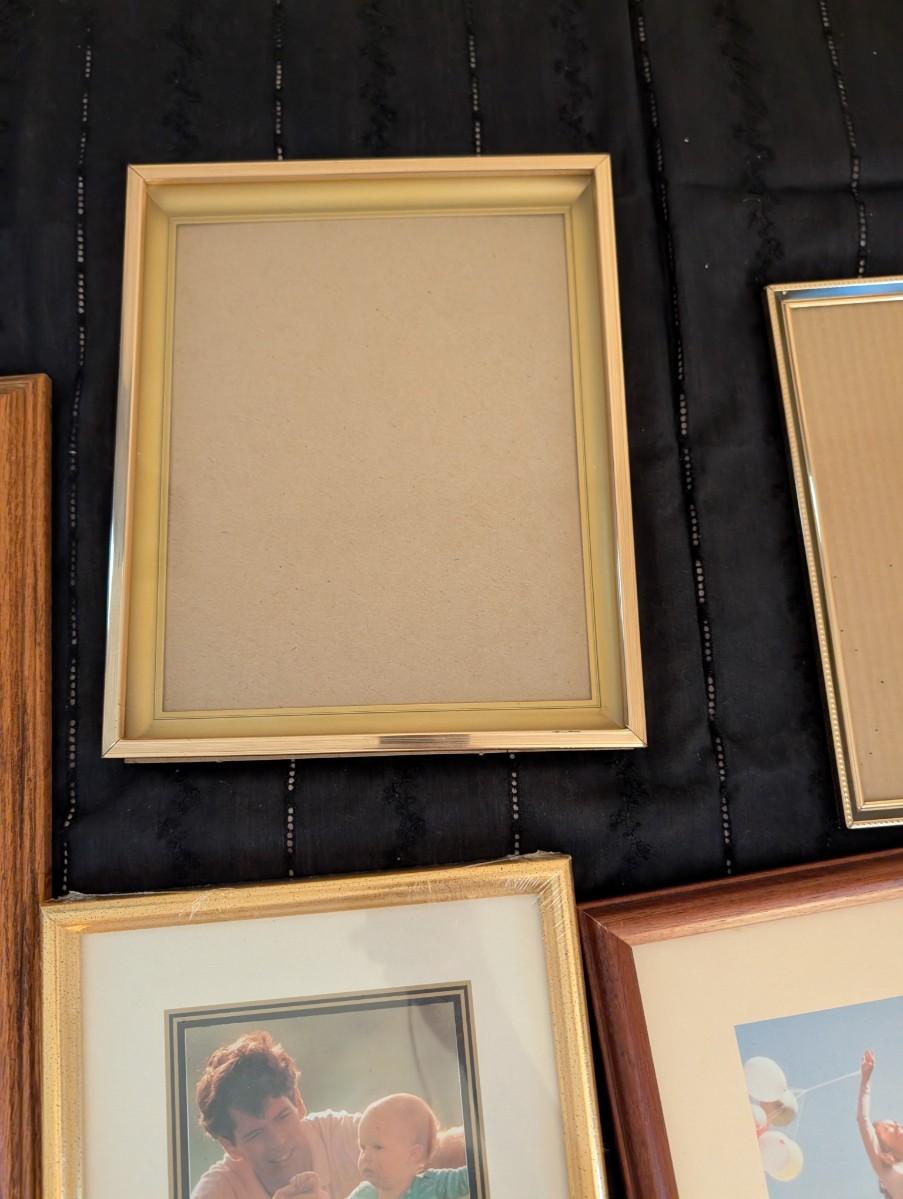 Large group of nice picture frames, gold in color, and some wooden ones to select from.