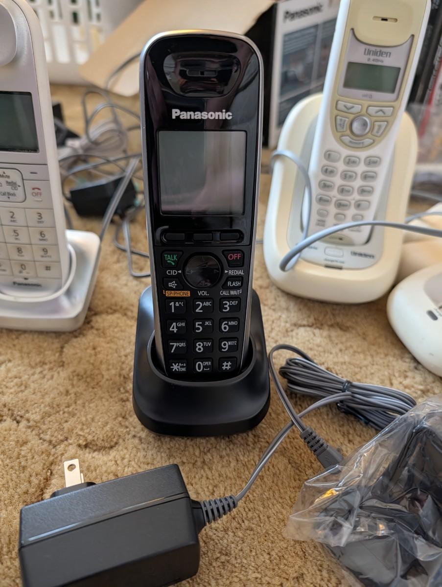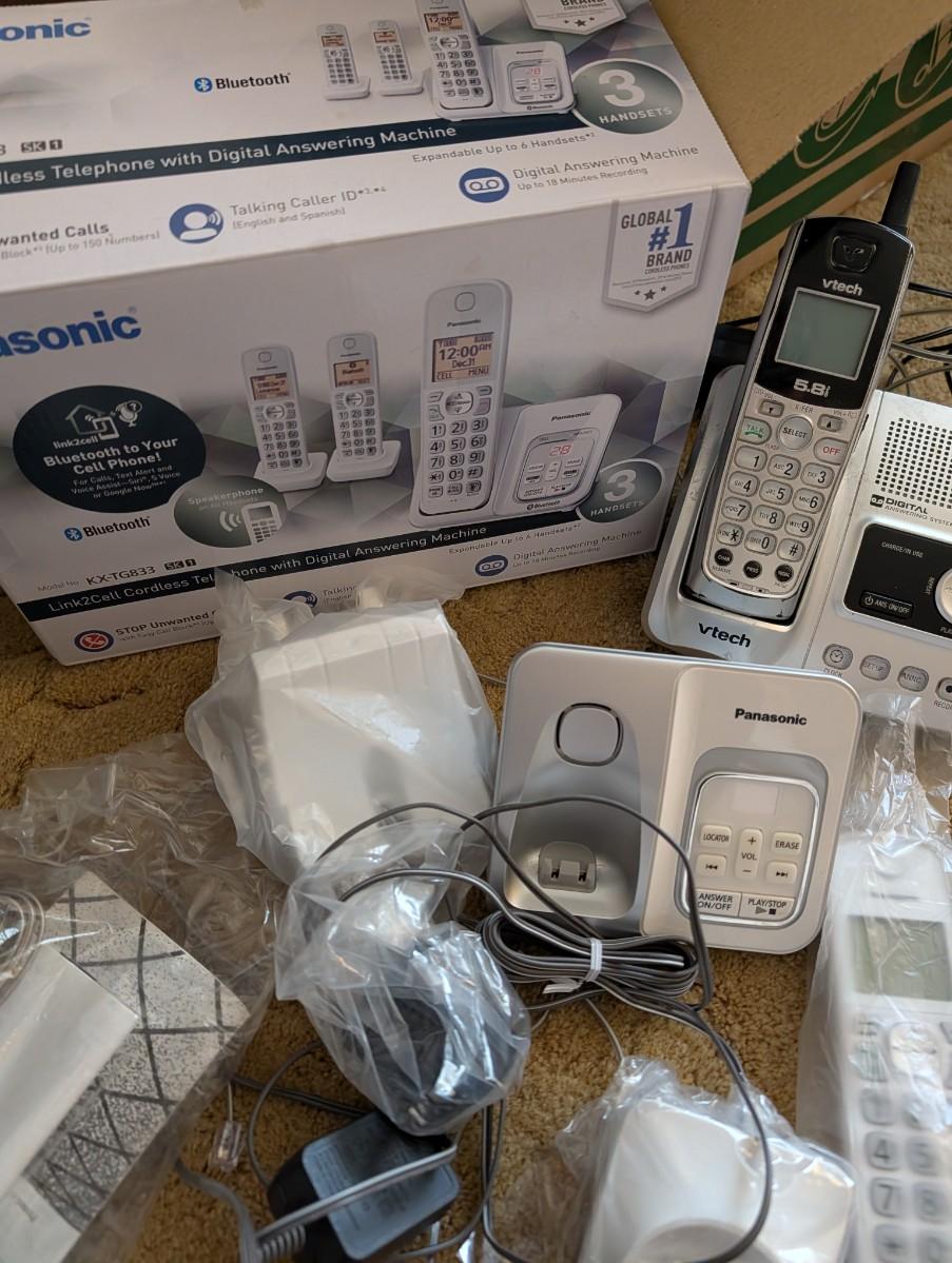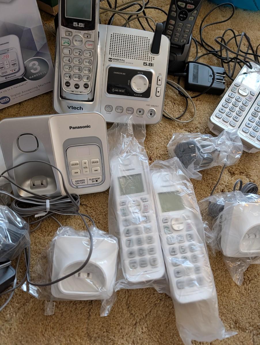 Big lot of V-Tech, Panasonic, and Uniden brands of phones, bases and an answering machine.