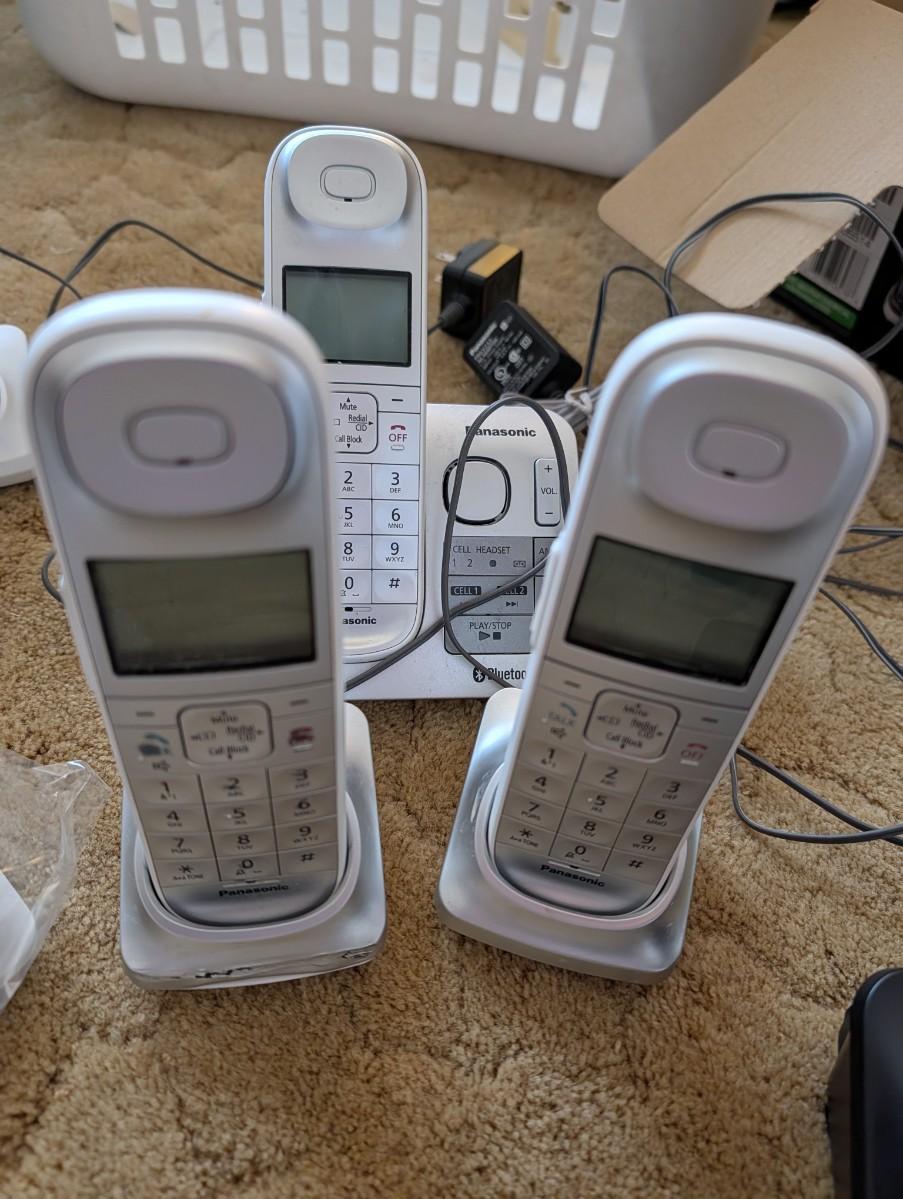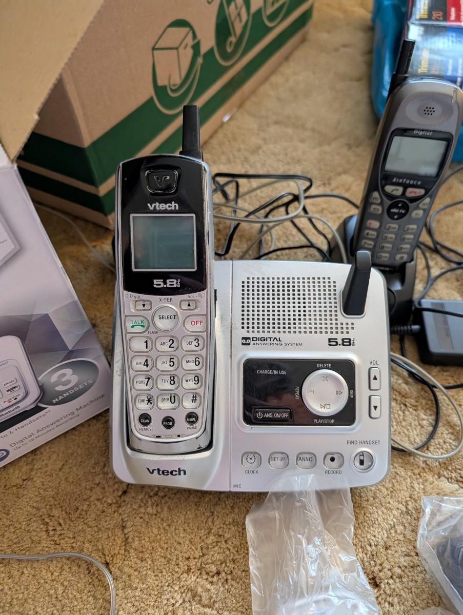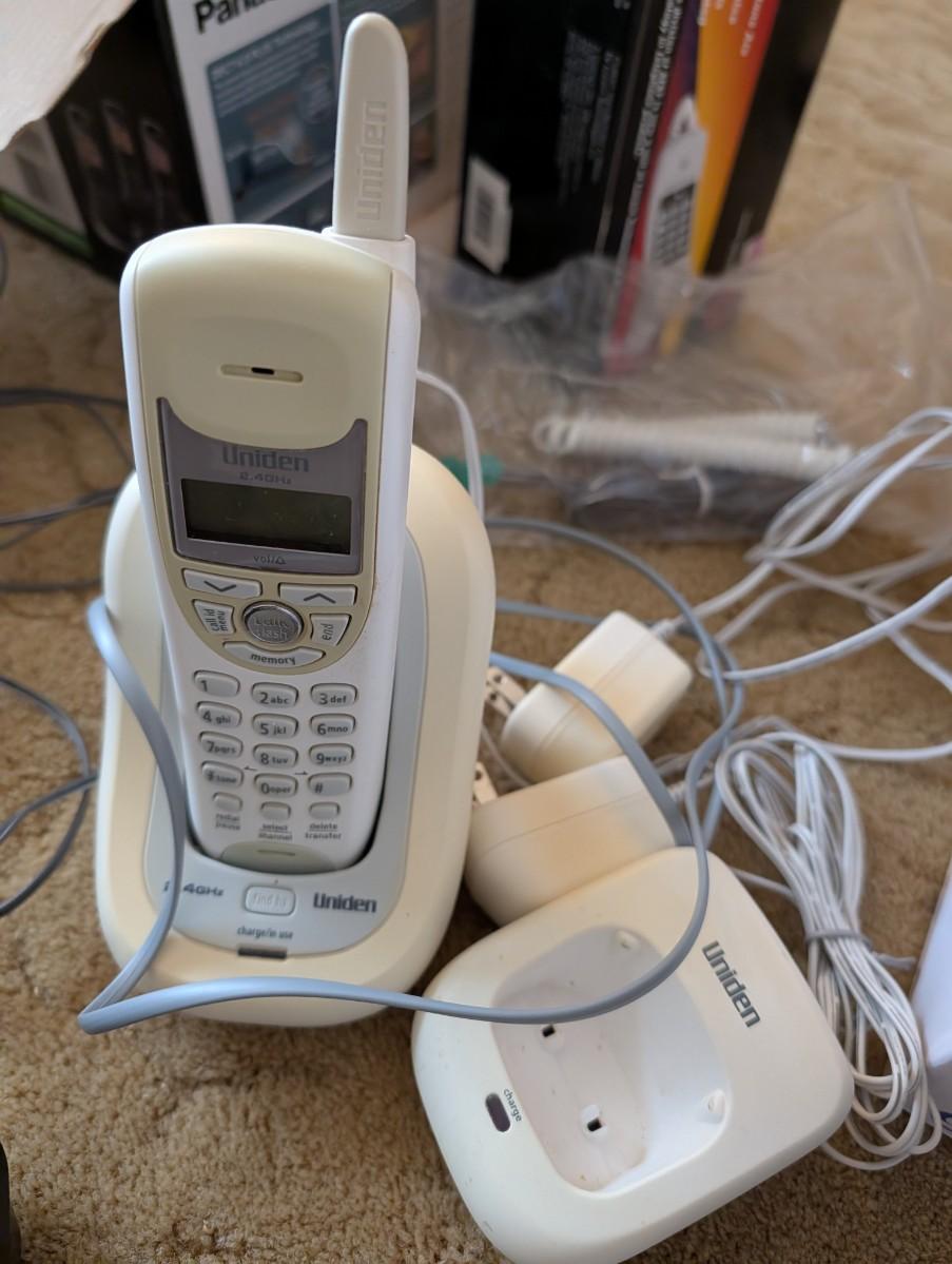 Big lot of V-Tech, Panasonic, and Uniden brands of phones, bases and an answering machine.