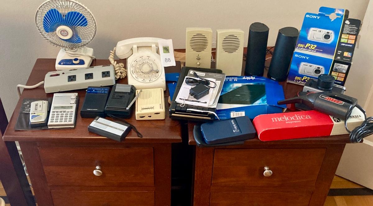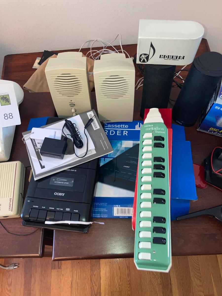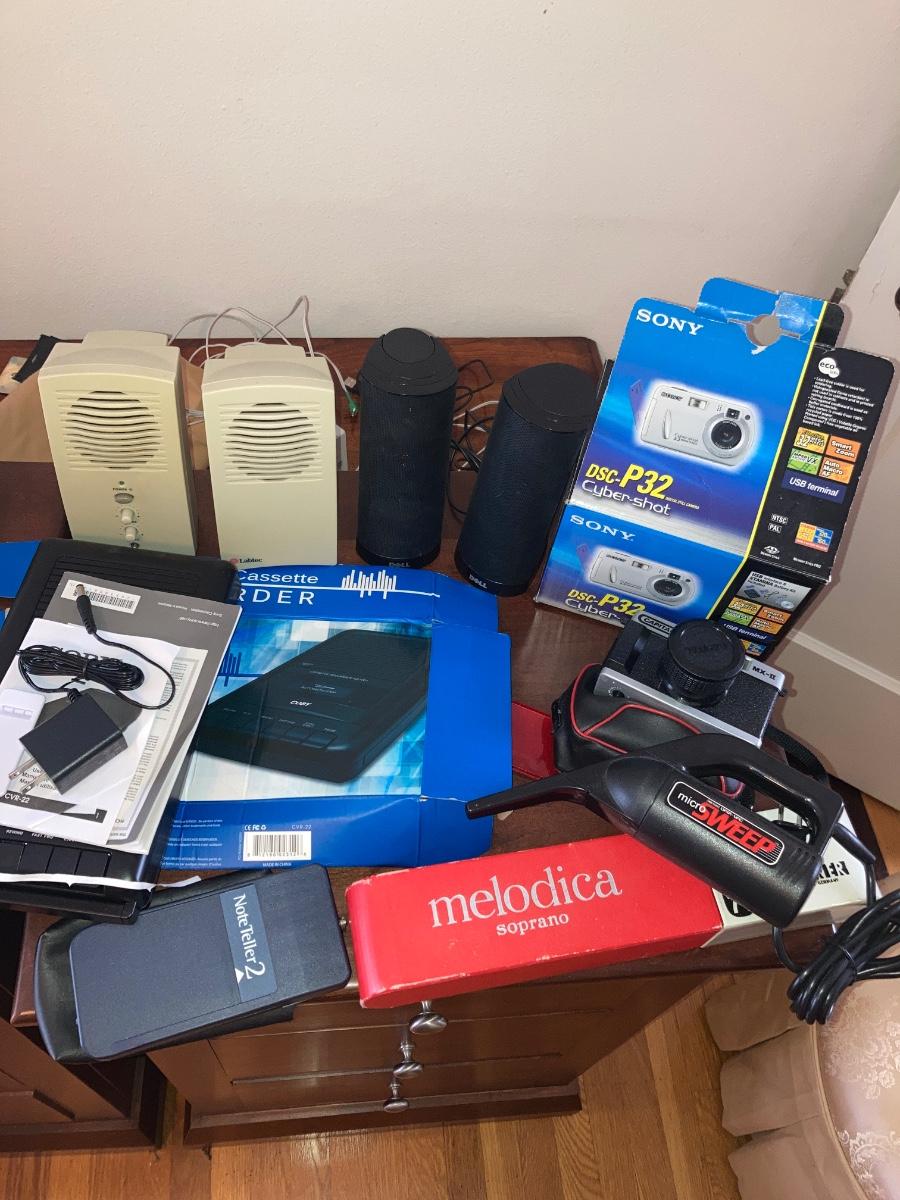 Items included in this lot: small tan, 4 am fm radios, rotary telephone 2 pair computer speakers tape recorder micro sweep , cyber shot camera capital max-II, Hohner melodica Soprano surge protector power strip.