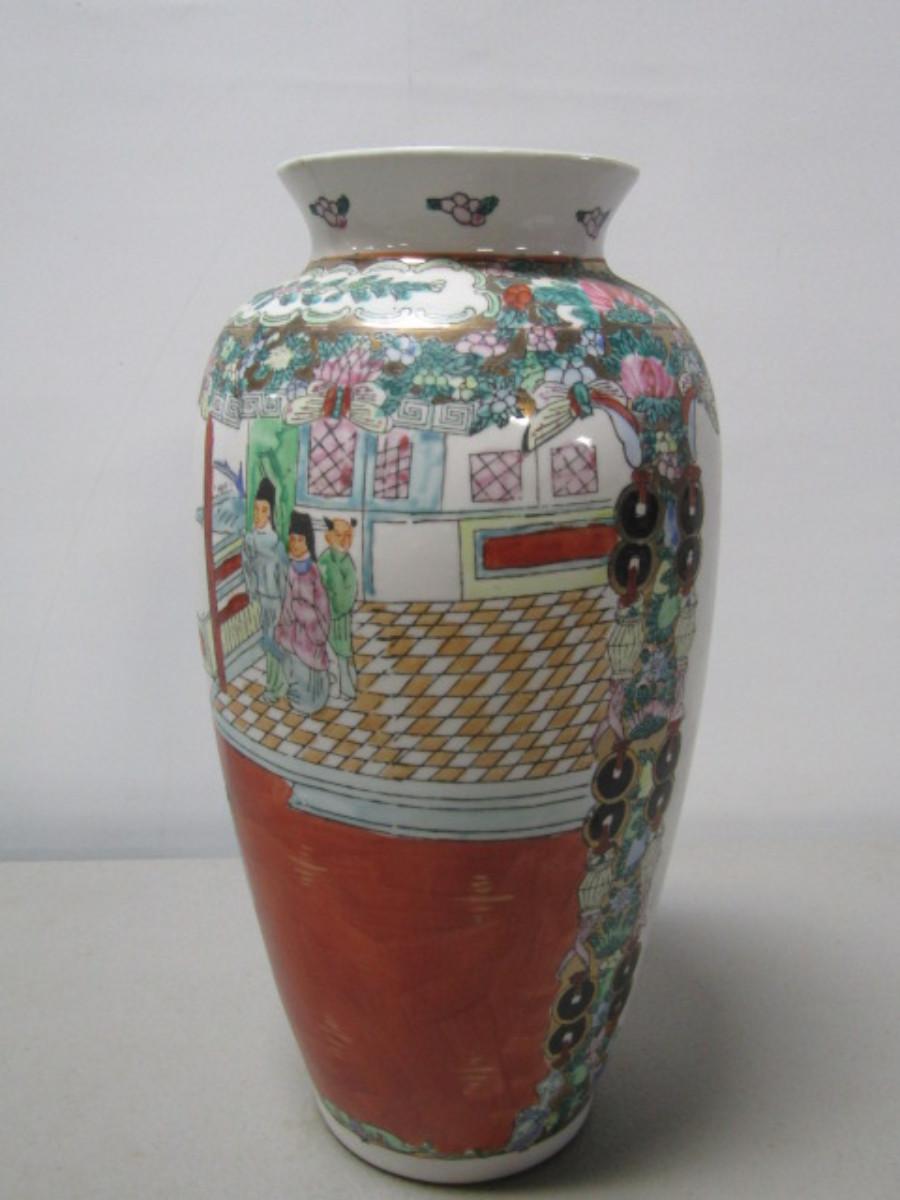 Large Hand Painted Ceramic Asian Theme Vase- Approx. 14" Tall- Stamped on Bottom (#1 of 2). Stamp is a bit smudged.