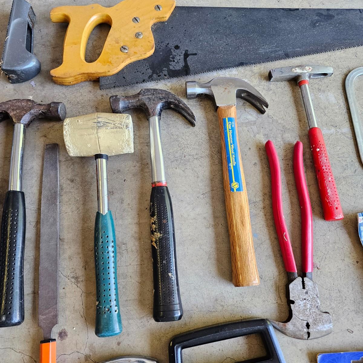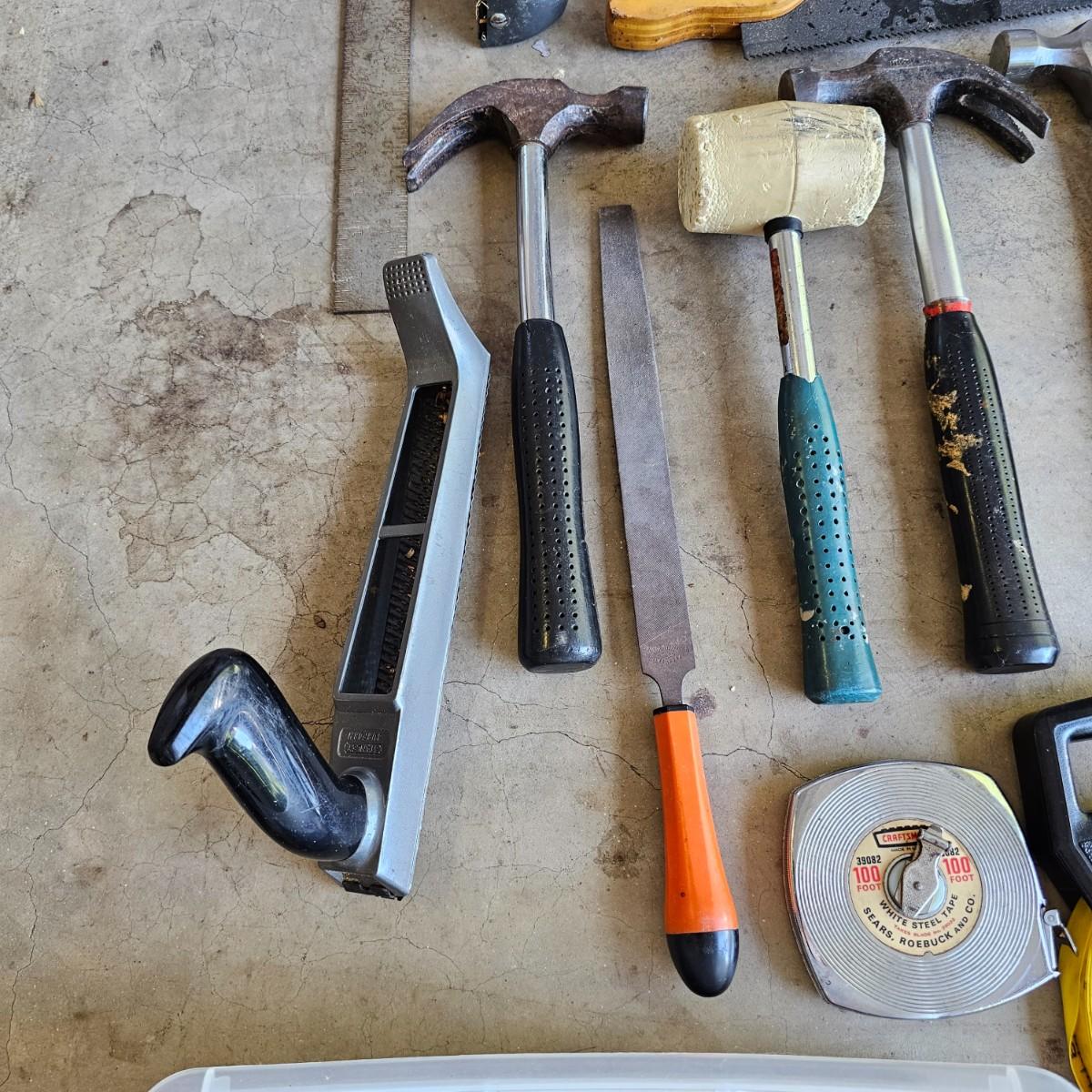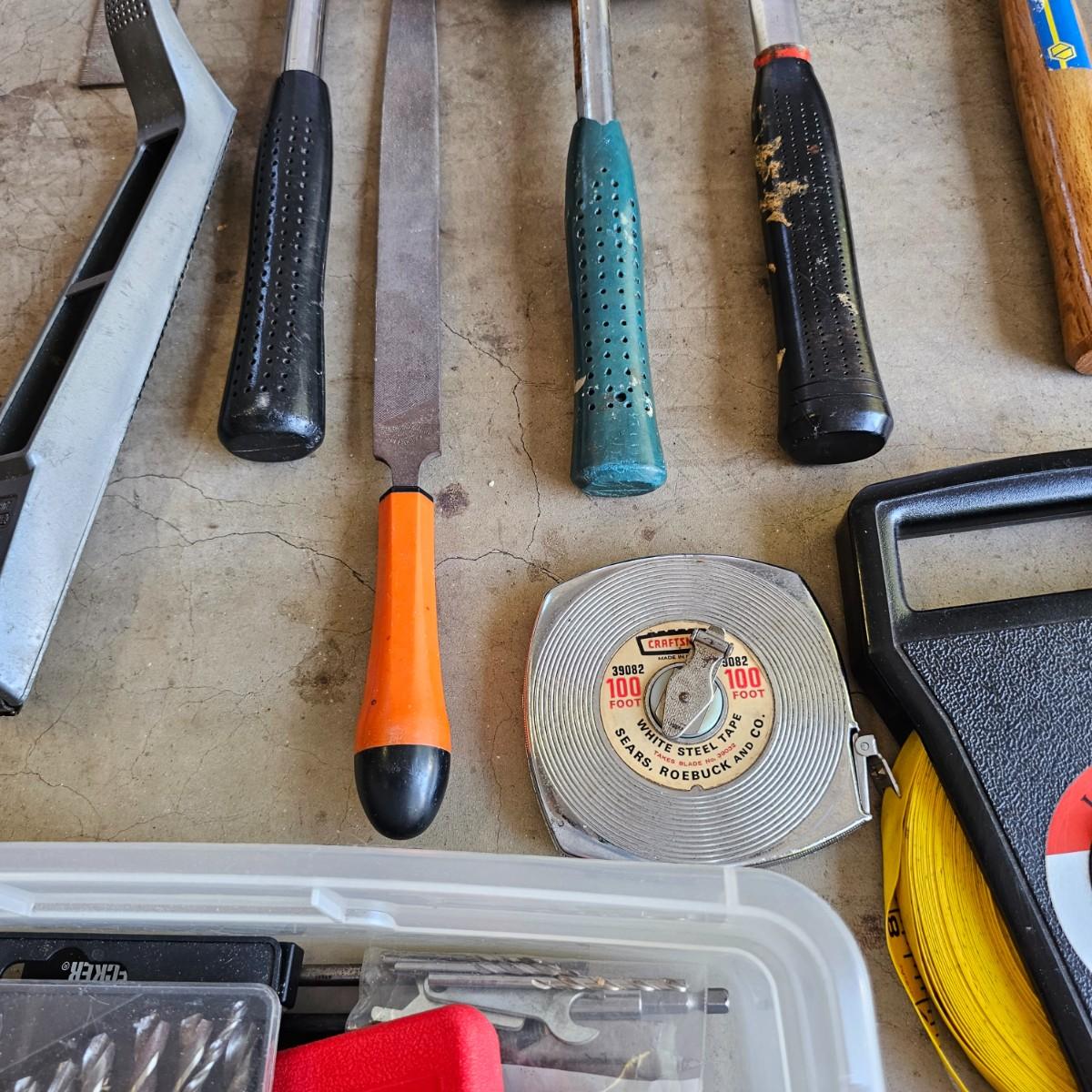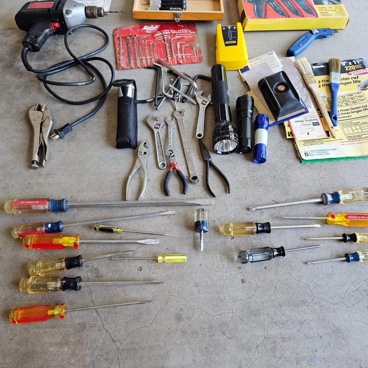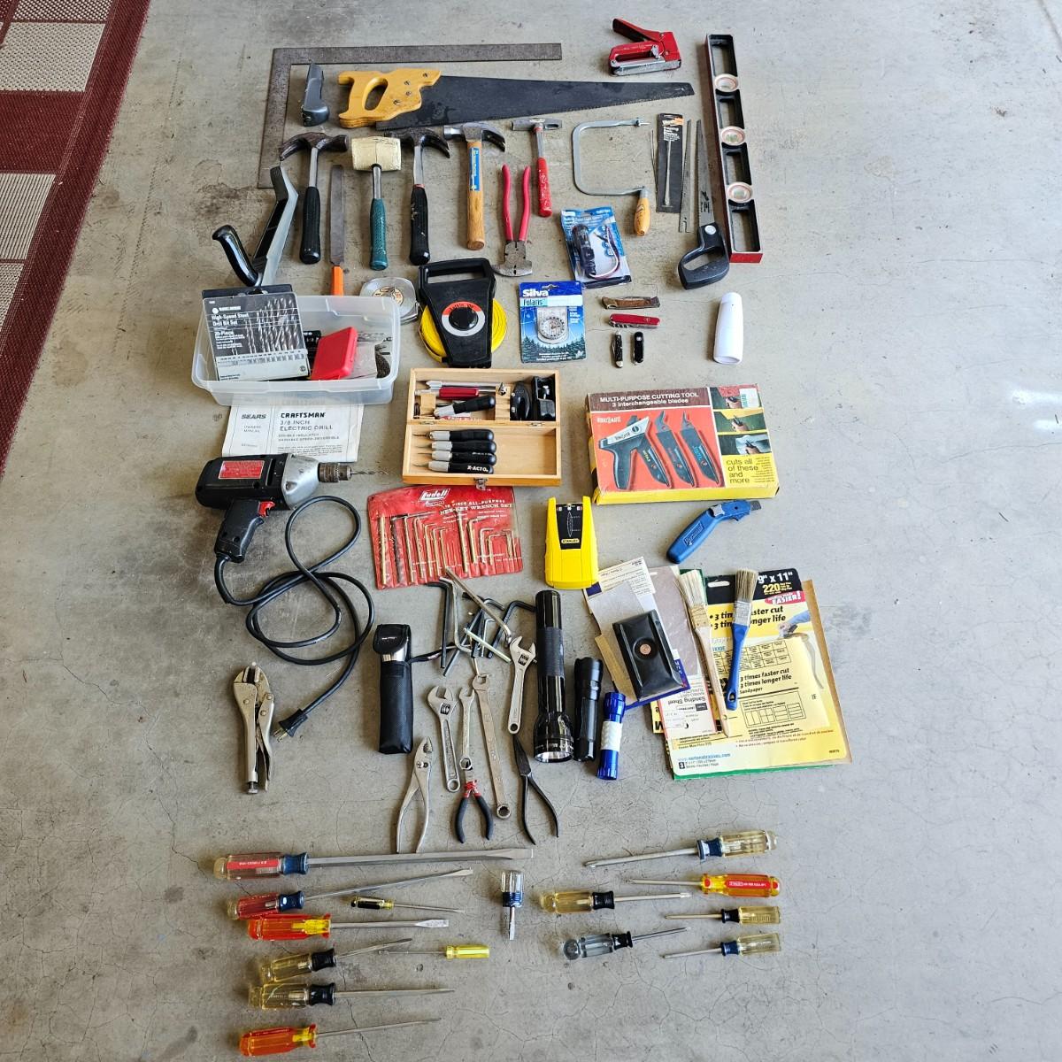 Hammers, screwdrivers, pliers, wrenches, saws and more. Three foot Millers Falls level, Craftsman 3/8" power drill with bits, no chuck key. Stanley stud finder, Lufkin 100 foot roll out tape. Drill plugged in and powered on. Allen wrenches, stapler, flashlights, not tested. See photos for details. Local pickup only.