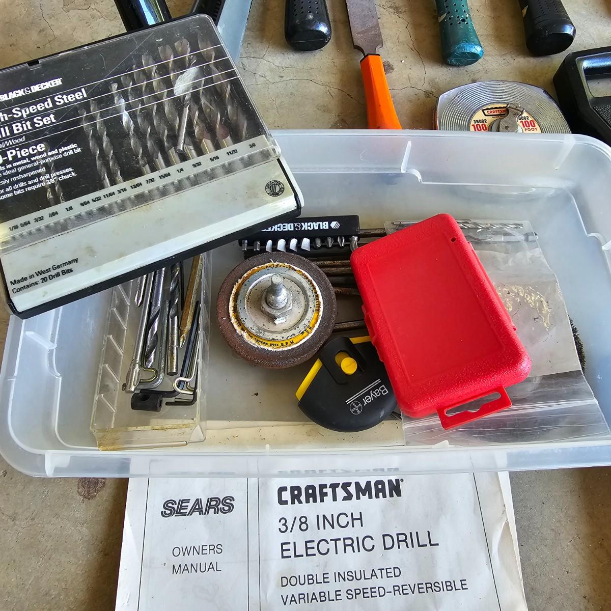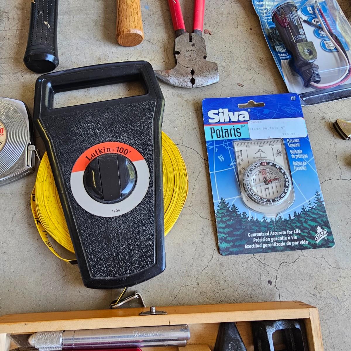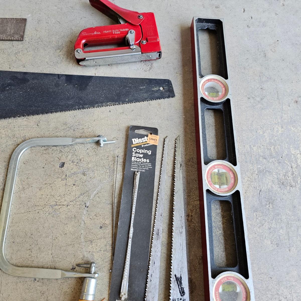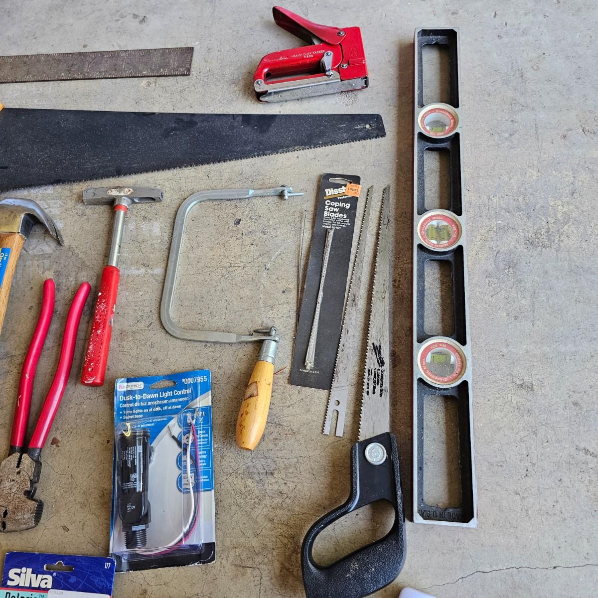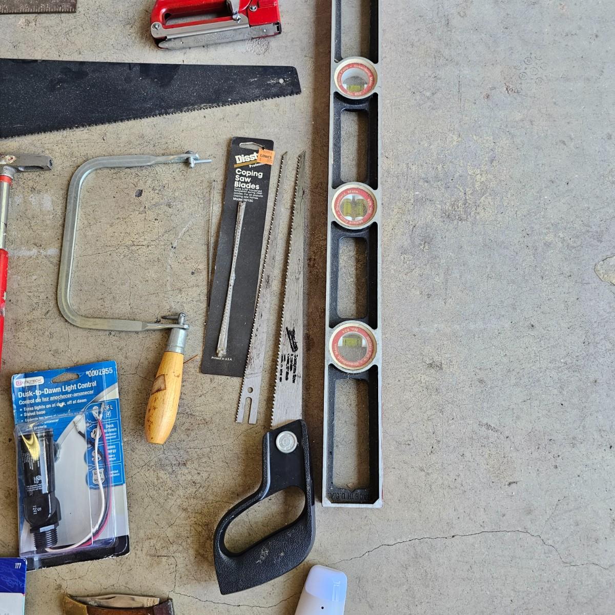 Hammers, screwdrivers, pliers, wrenches, saws and more. Three foot Millers Falls level, Craftsman 3/8" power drill with bits, no chuck key. Stanley stud finder, Lufkin 100 foot roll out tape. Drill plugged in and powered on. Allen wrenches, stapler, flashlights, not tested. See photos for details. Local pickup only.