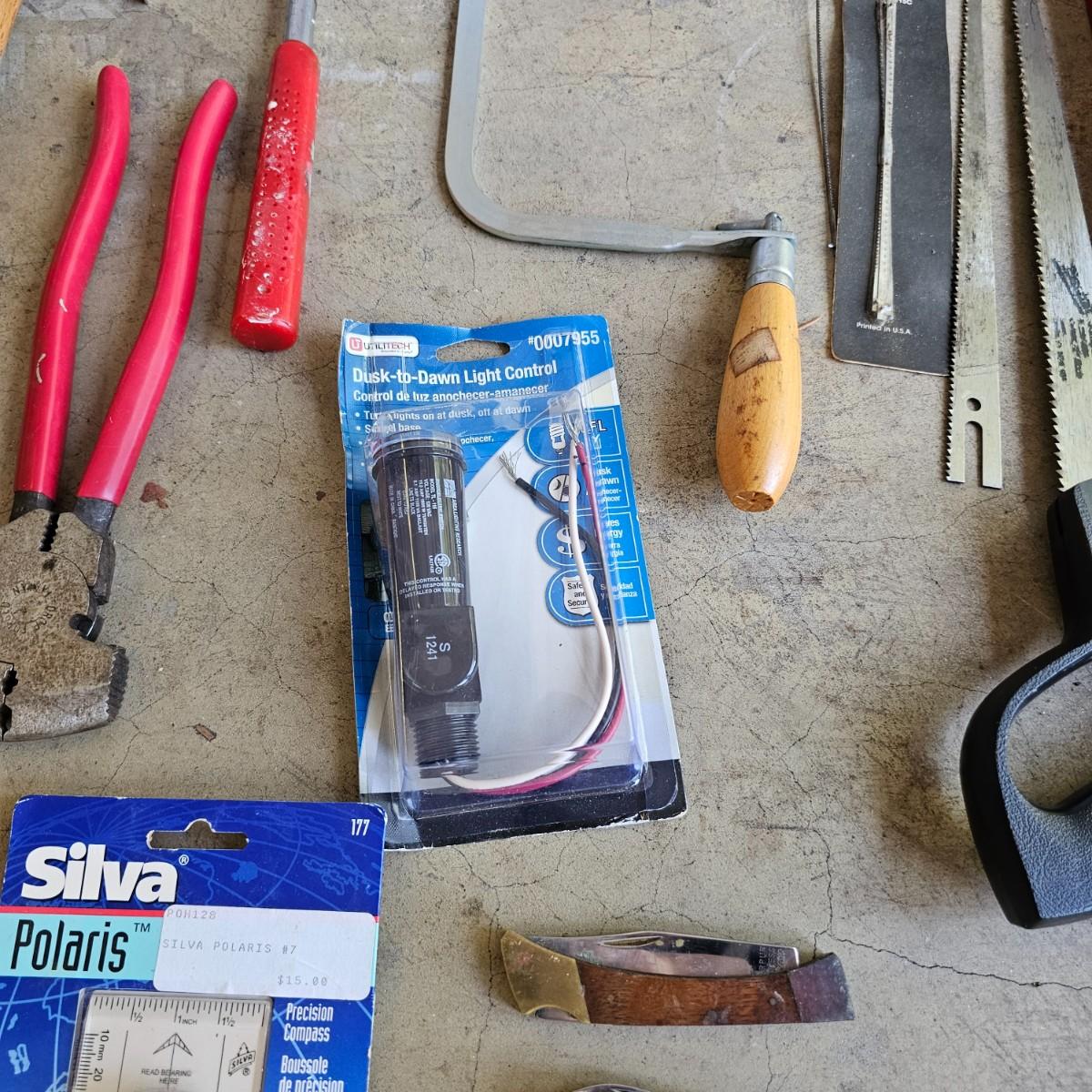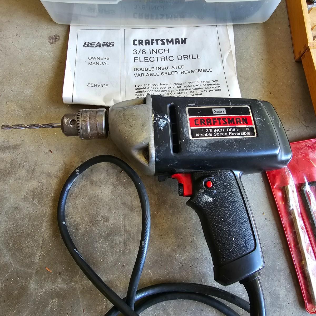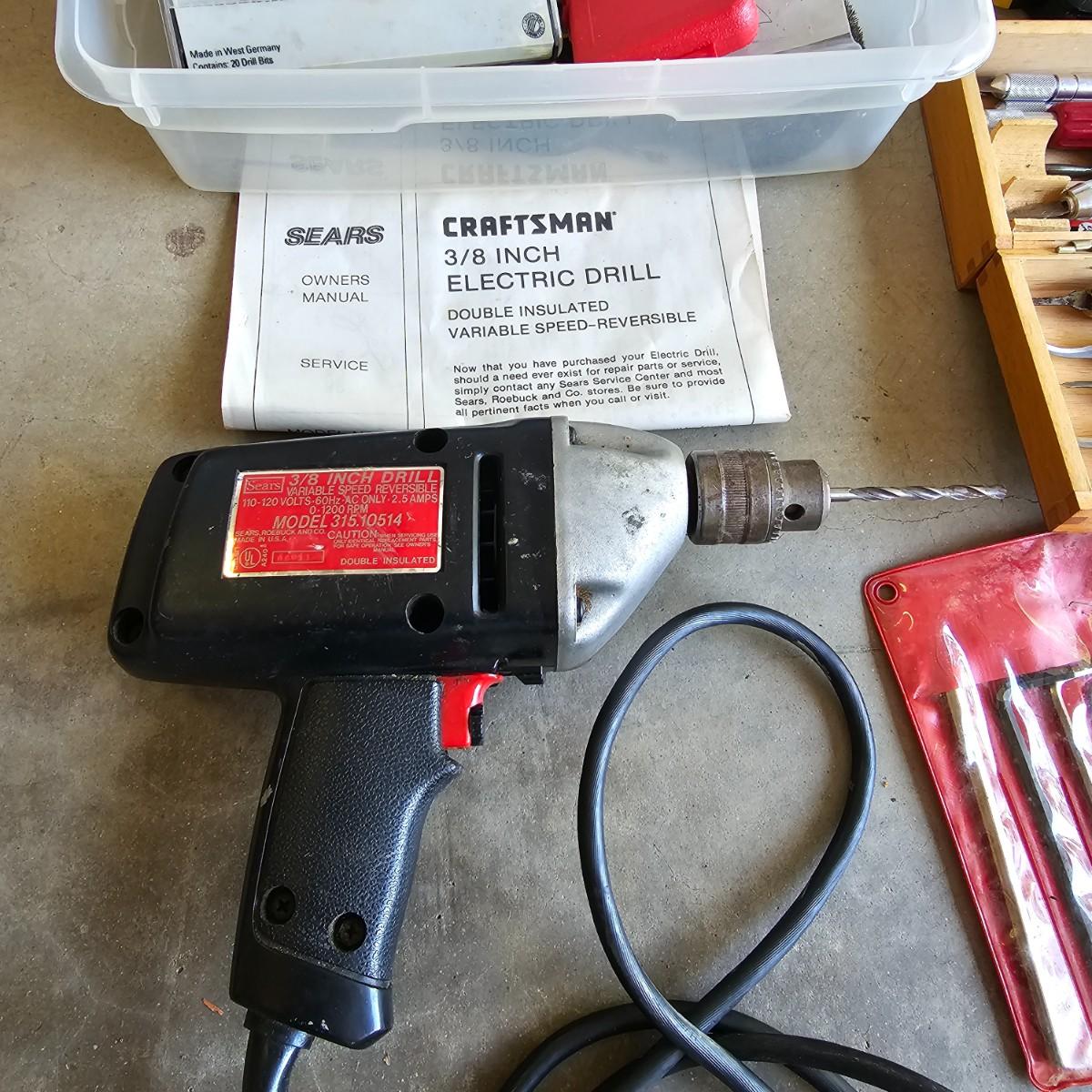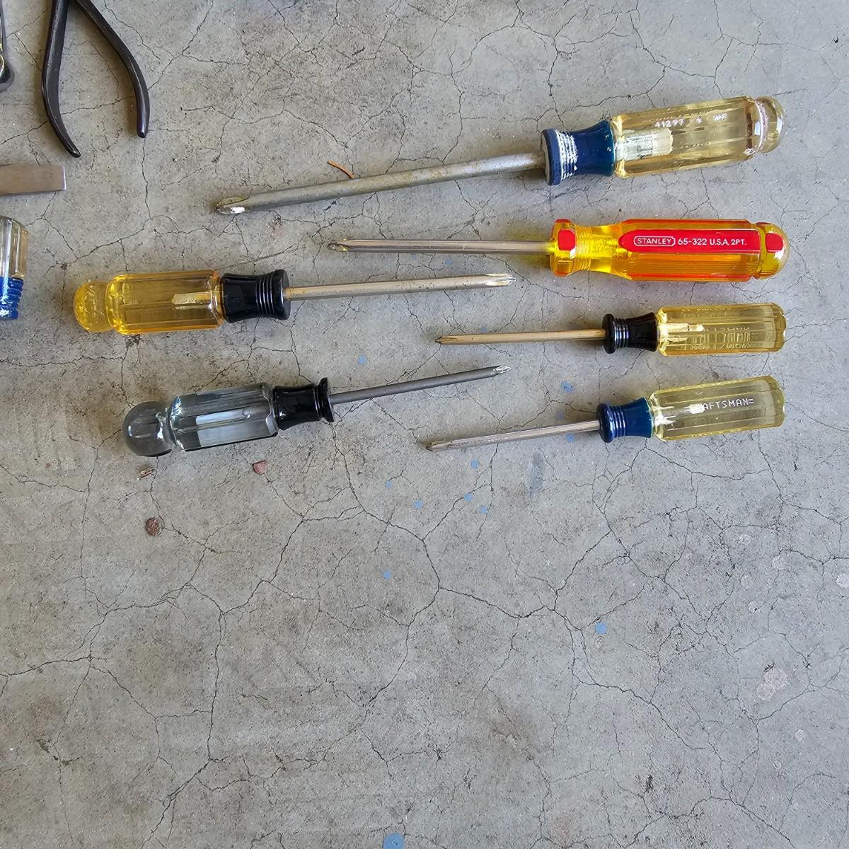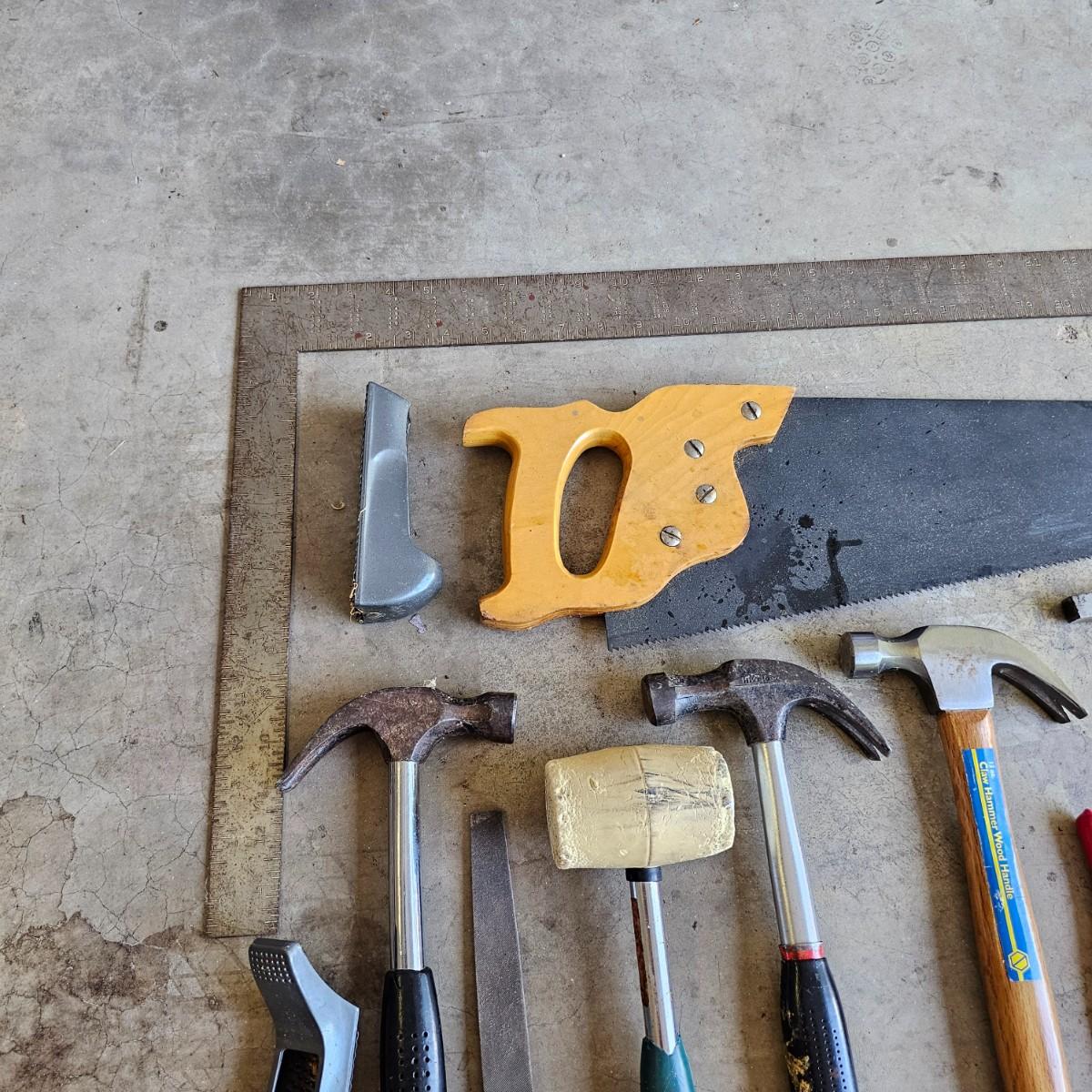 Hammers, screwdrivers, pliers, wrenches, saws and more. Three foot Millers Falls level, Craftsman 3/8" power drill with bits, no chuck key. Stanley stud finder, Lufkin 100 foot roll out tape. Drill plugged in and powered on. Allen wrenches, stapler, flashlights, not tested. See photos for details. Local pickup only.