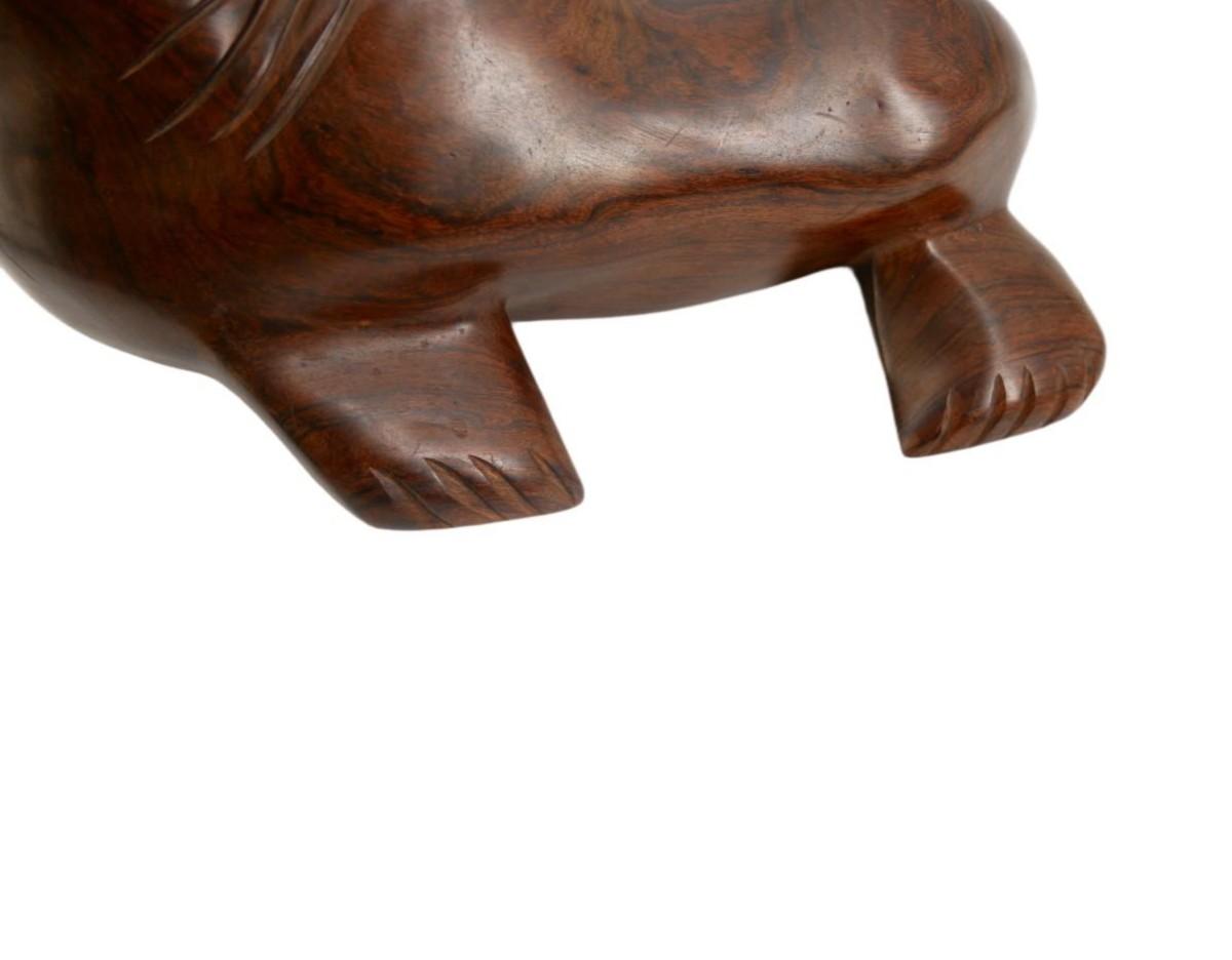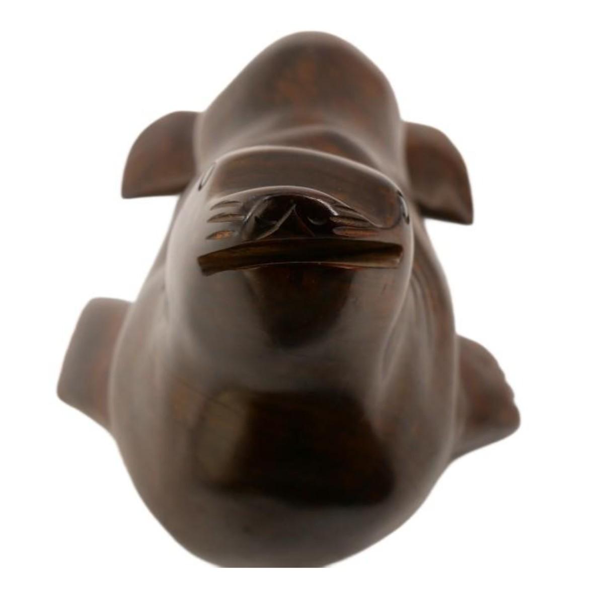 Whimsical, hand carved solid dark hardwood seal statue. Beautiful graining and striations. Measures L 14" x H 8.5" x W 8.5". Weight of item is 11 lbs. Condition is of normal aging, small scratches and scuffs may be present. Overall excellent, playful piece! (C001)