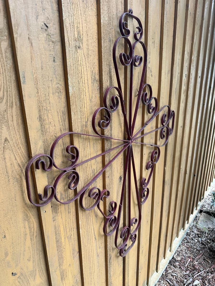 ,Heavy gauge wrought iron wall cross with detailed scrollwork and a rustic finish.