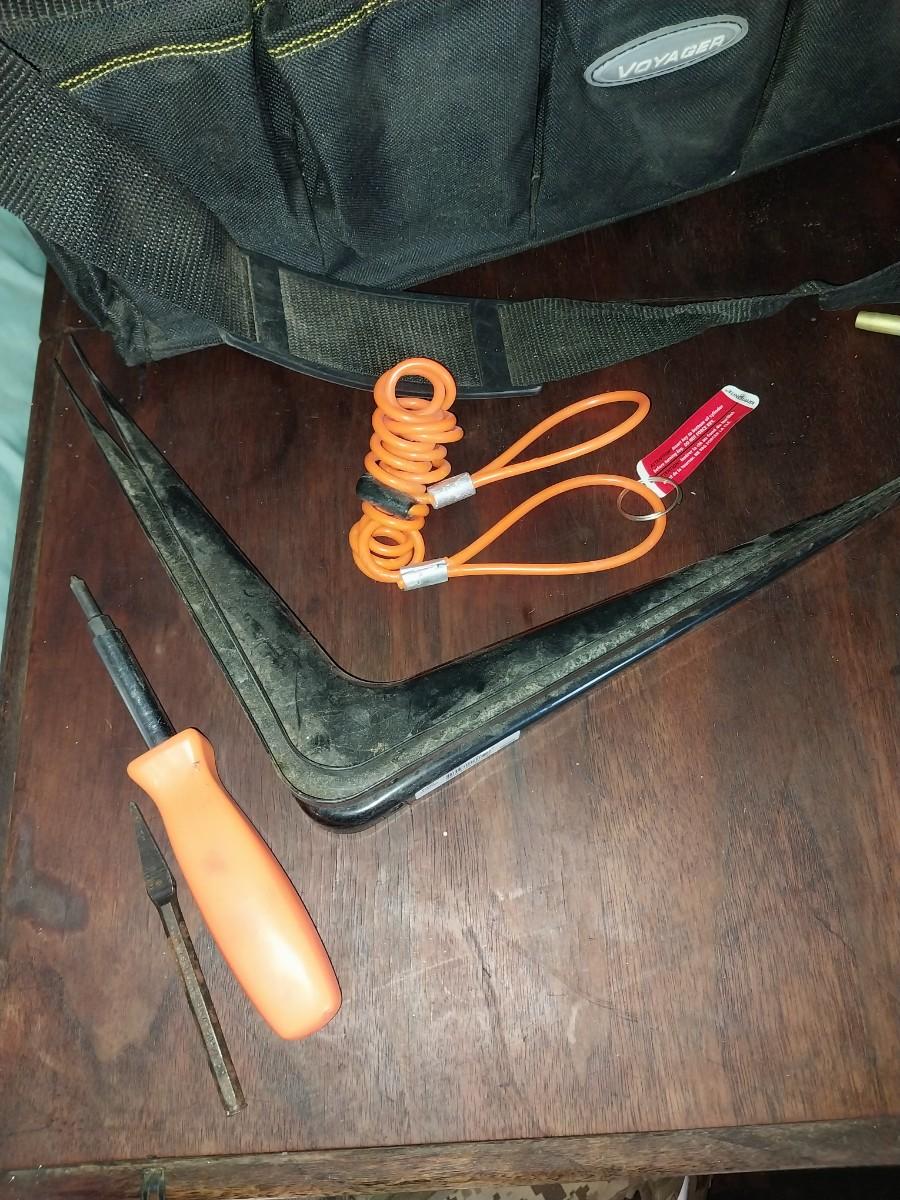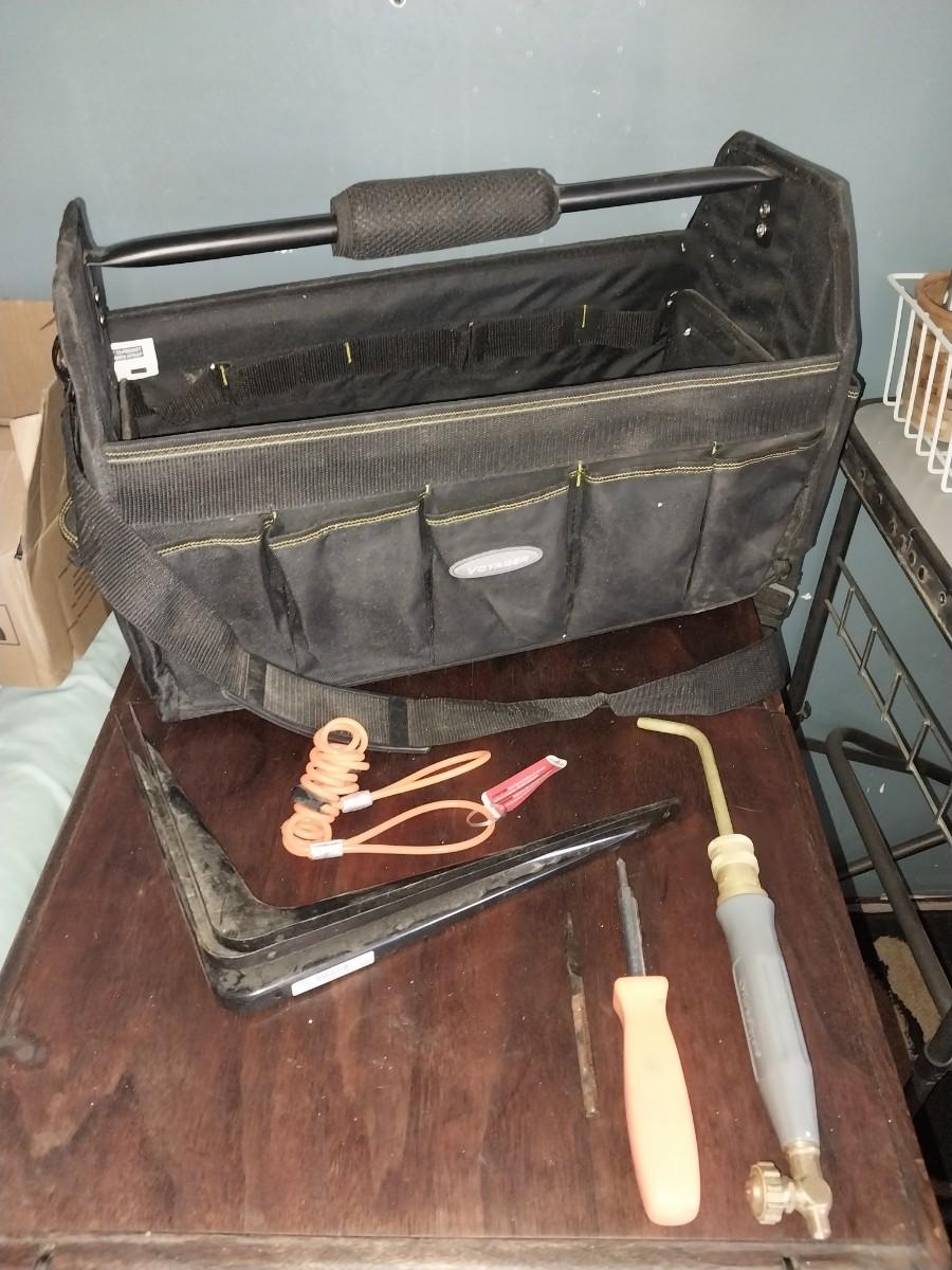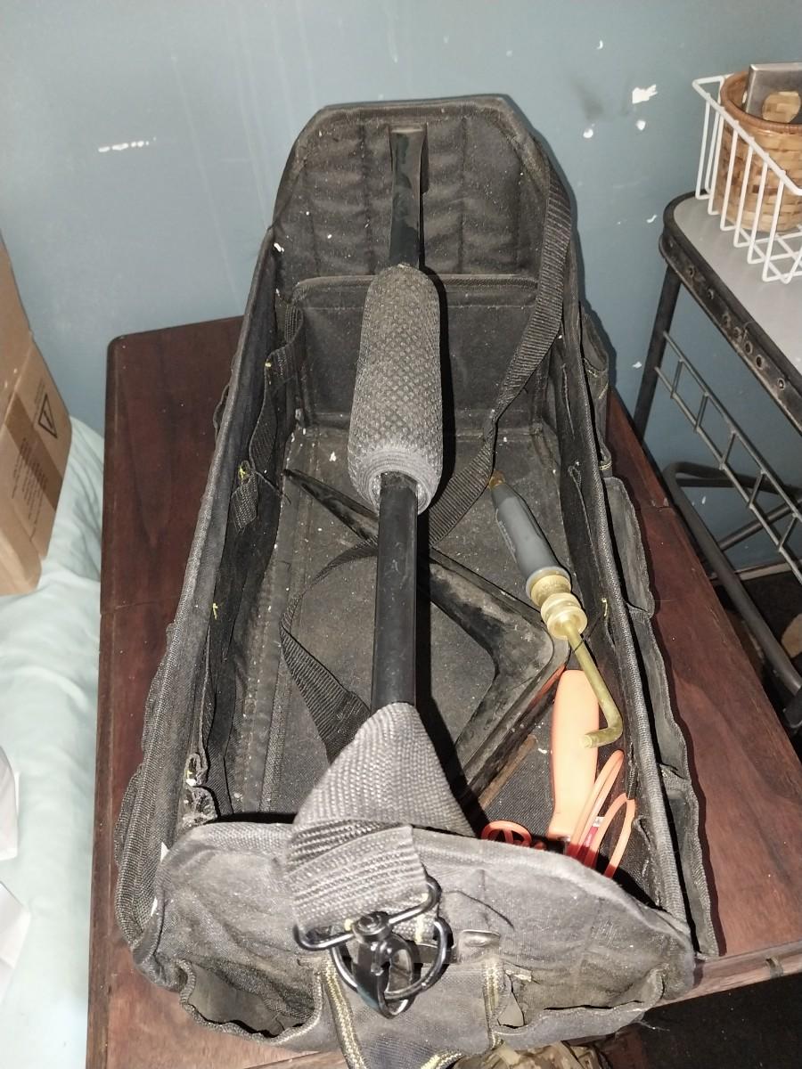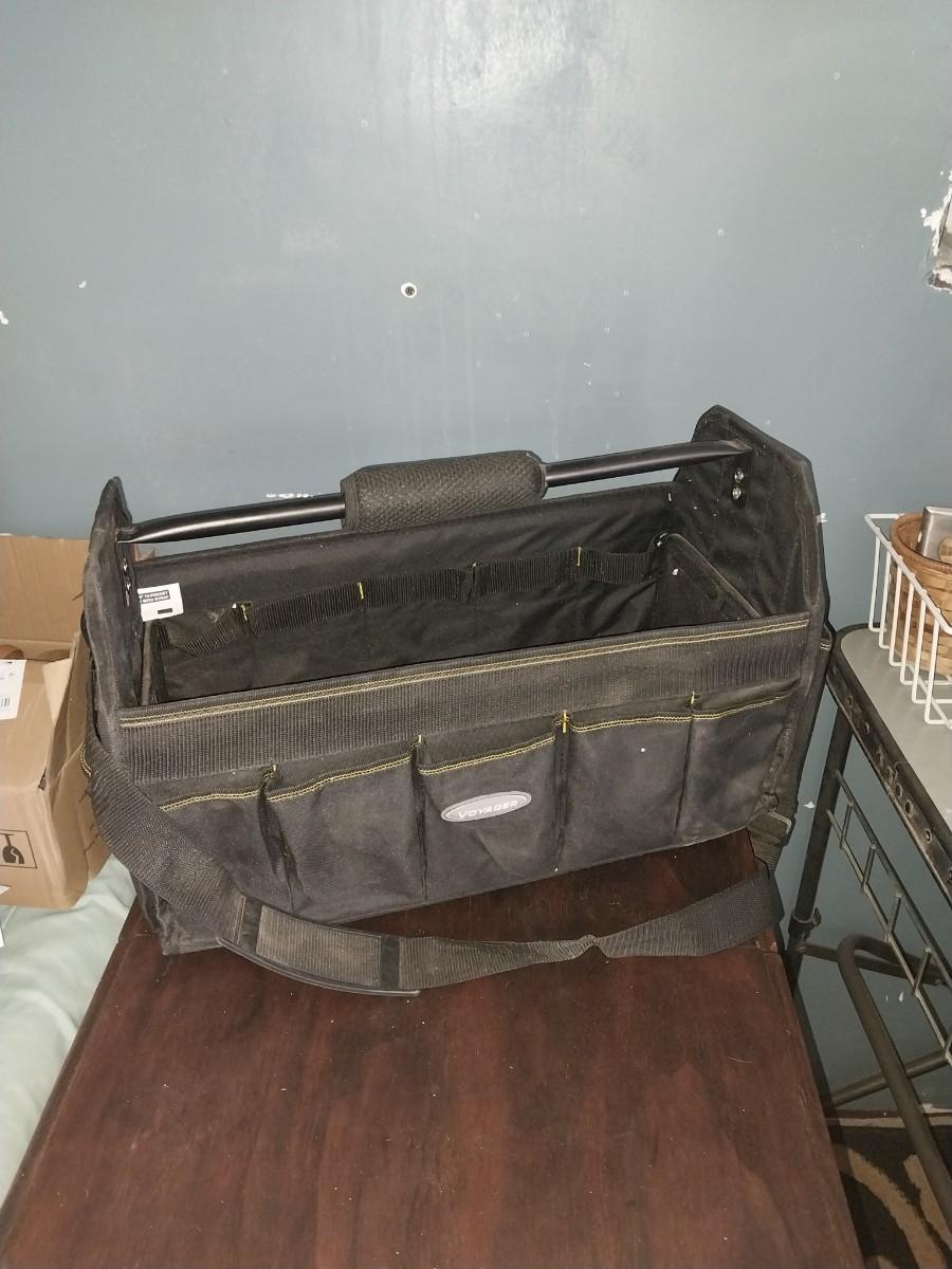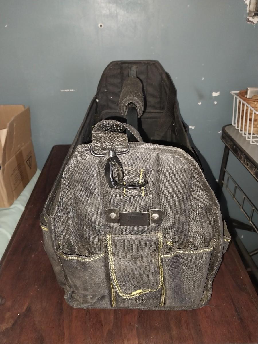 LARGE HANDELED CARRY TOOL BAG WITH STRAP AND FEW TOOLS