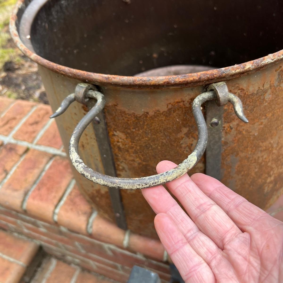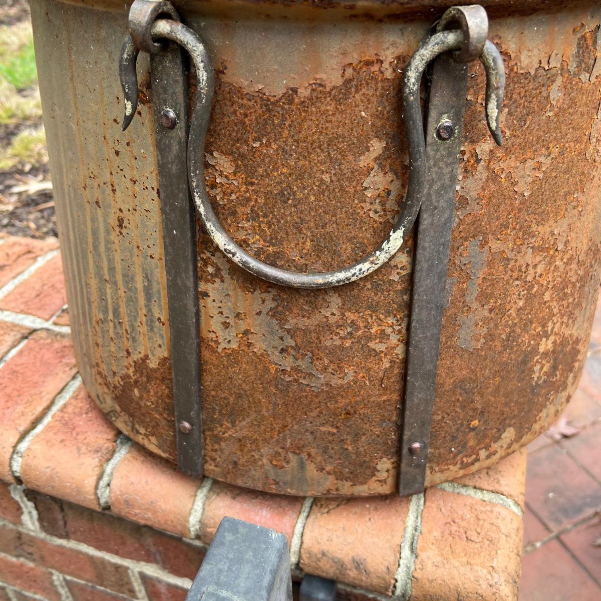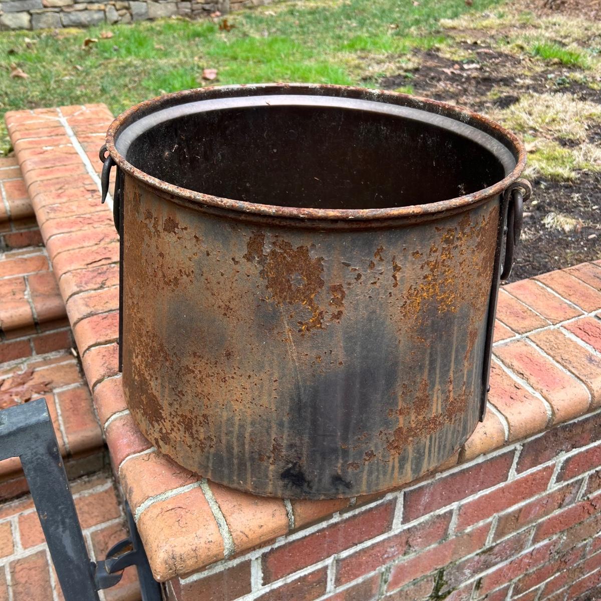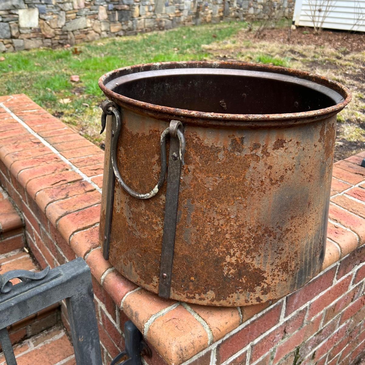 This large handled metal pot appears to have a copper base and features a hole on one side and multiple holes in its base. It has rust and plenty of patina which add to its rustic charm.