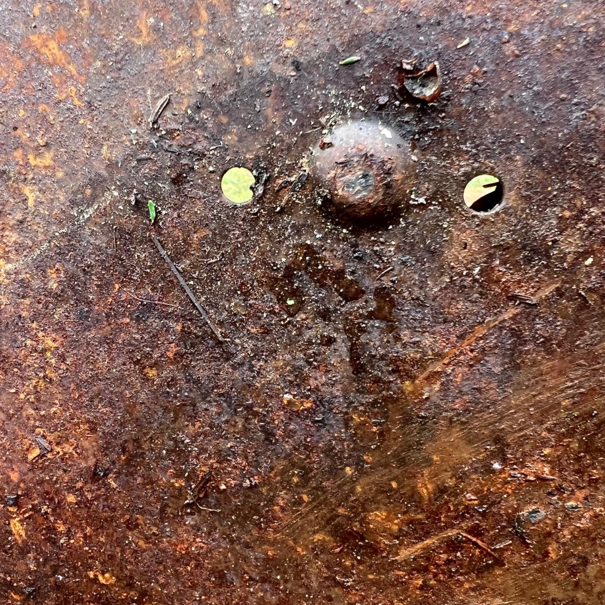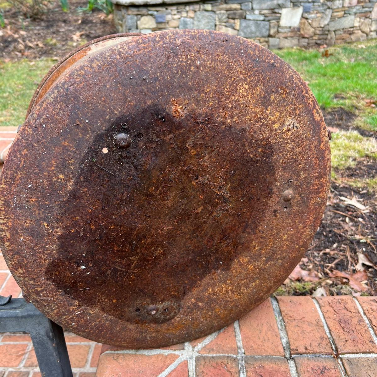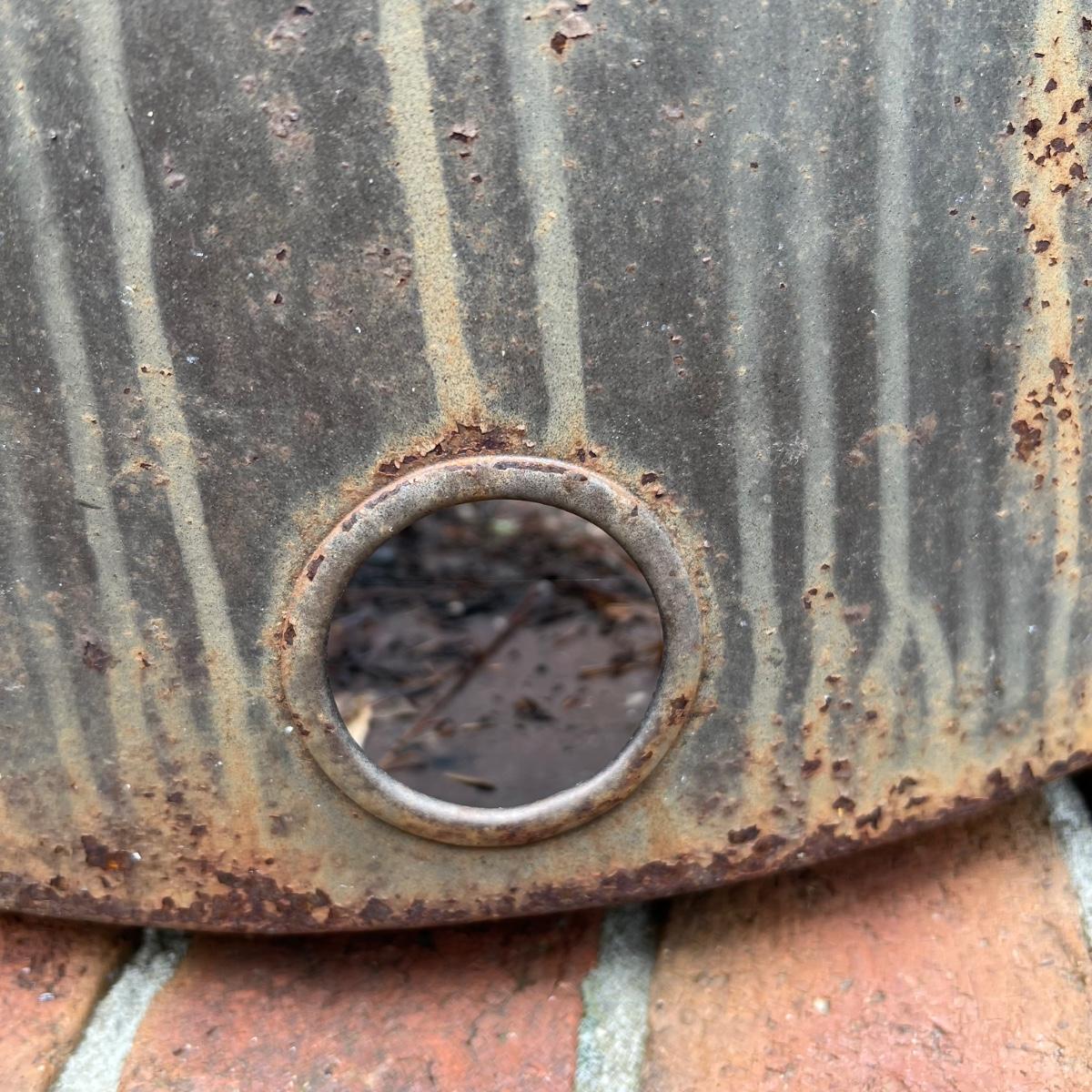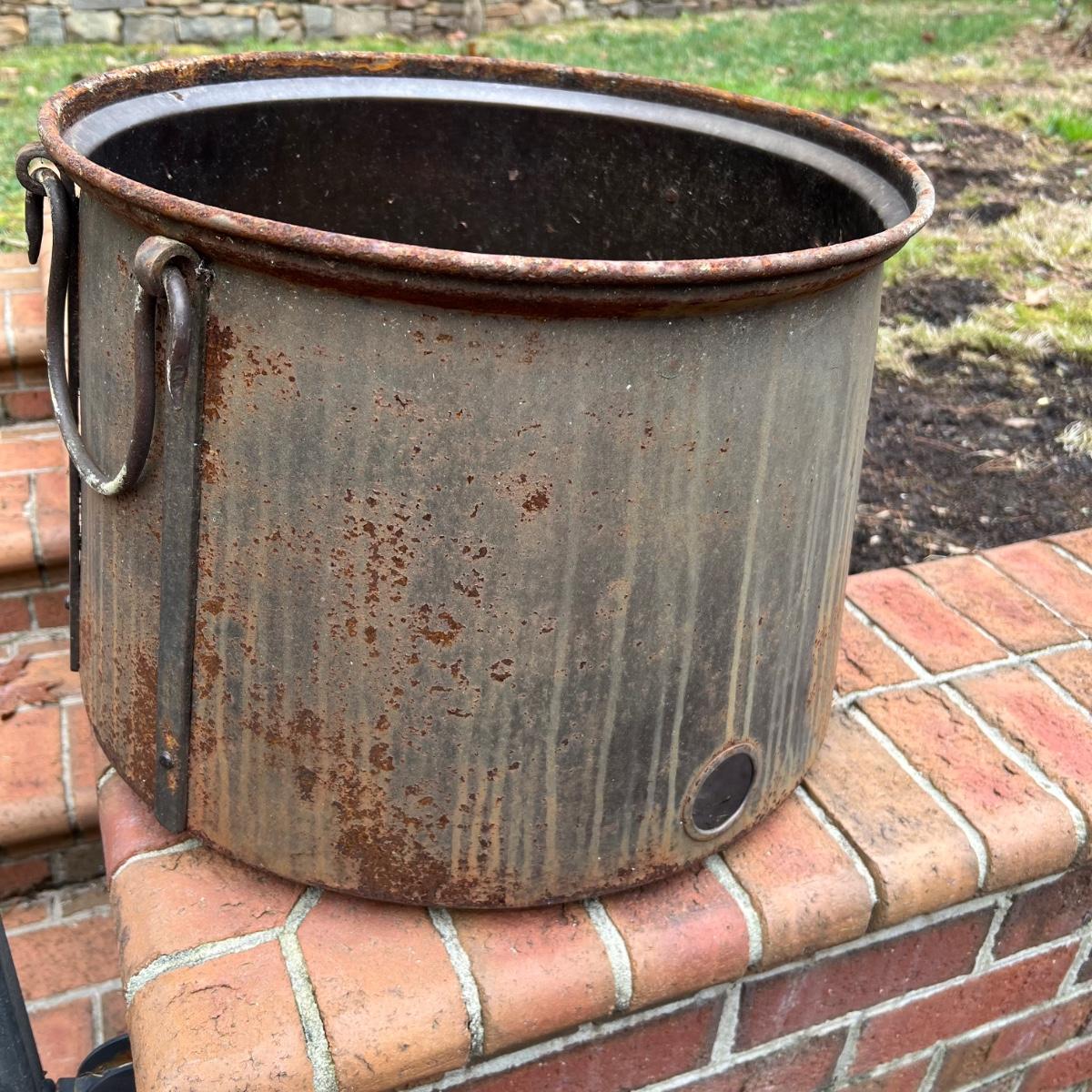 This large handled metal pot appears to have a copper base and features a hole on one side and multiple holes in its base. It has rust and plenty of patina which add to its rustic charm.